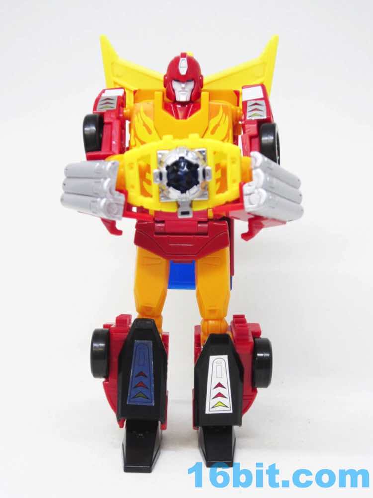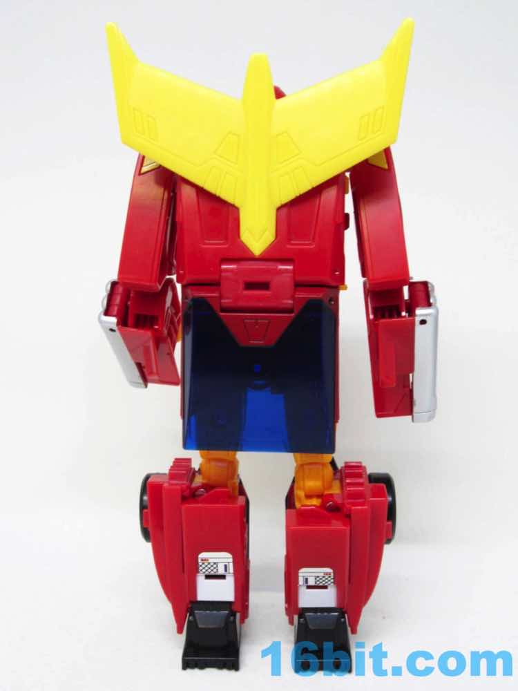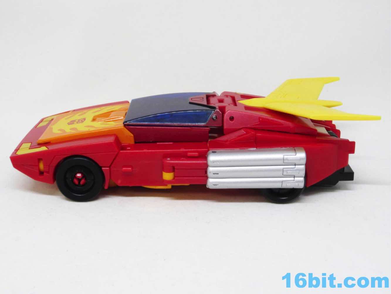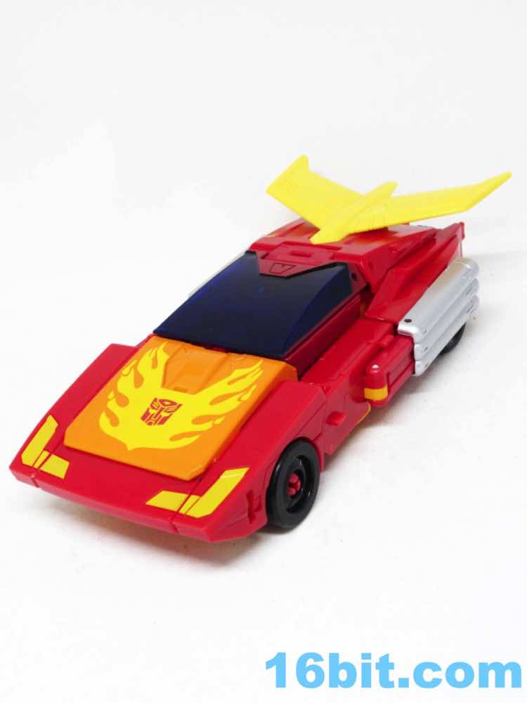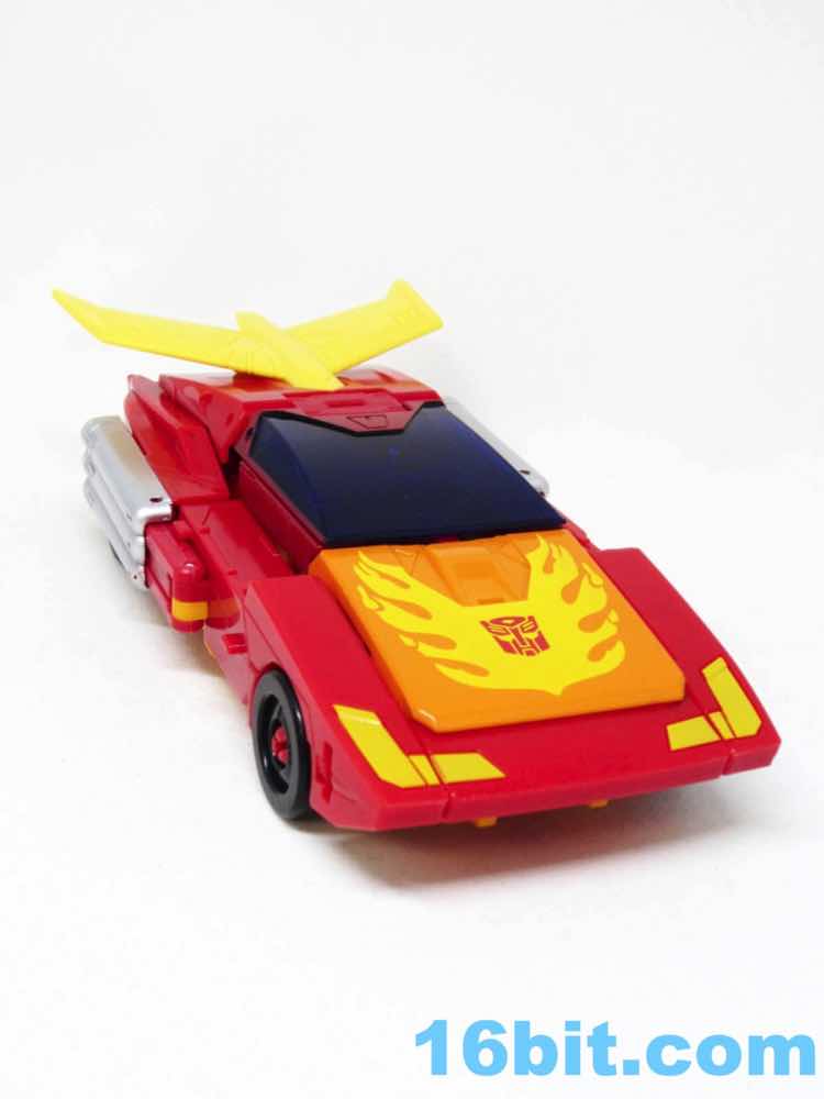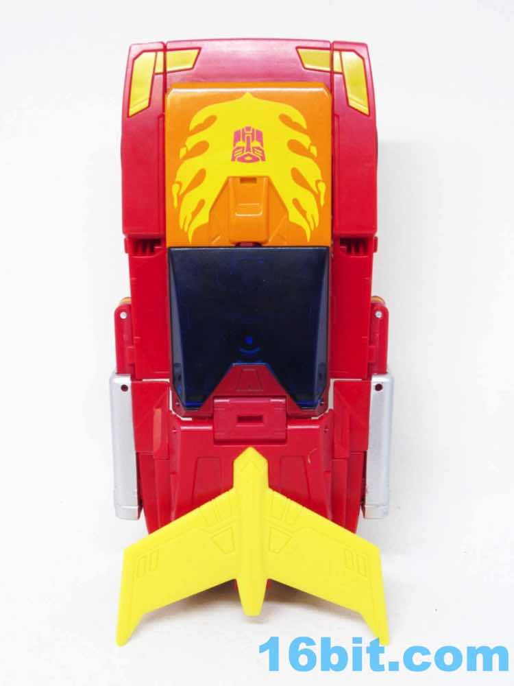 His car mode is a little bigger than the Titans Return toy, boxier and less elegant. There are more visible panels and steps that would reveal this to be the mode that sacrificed the most to this four-form concept piece. The yellow spoiler is closer to Rodimus Prime's, complete with that extra bit in the middle and more detail than you require. The clear blue boxy windshield/roof is just like the original toy, making this a weird hybrid of several animation models and toys. The snap-on wheels don't look particularly great with unpainted rims and a red mushroom peg holding them in place. A little color or a metal pin would do wonders for making them look better, but they're functionally acceptable. If you're happy with an existing Hot Rod toy's car mode, you won't enjoy this one more.