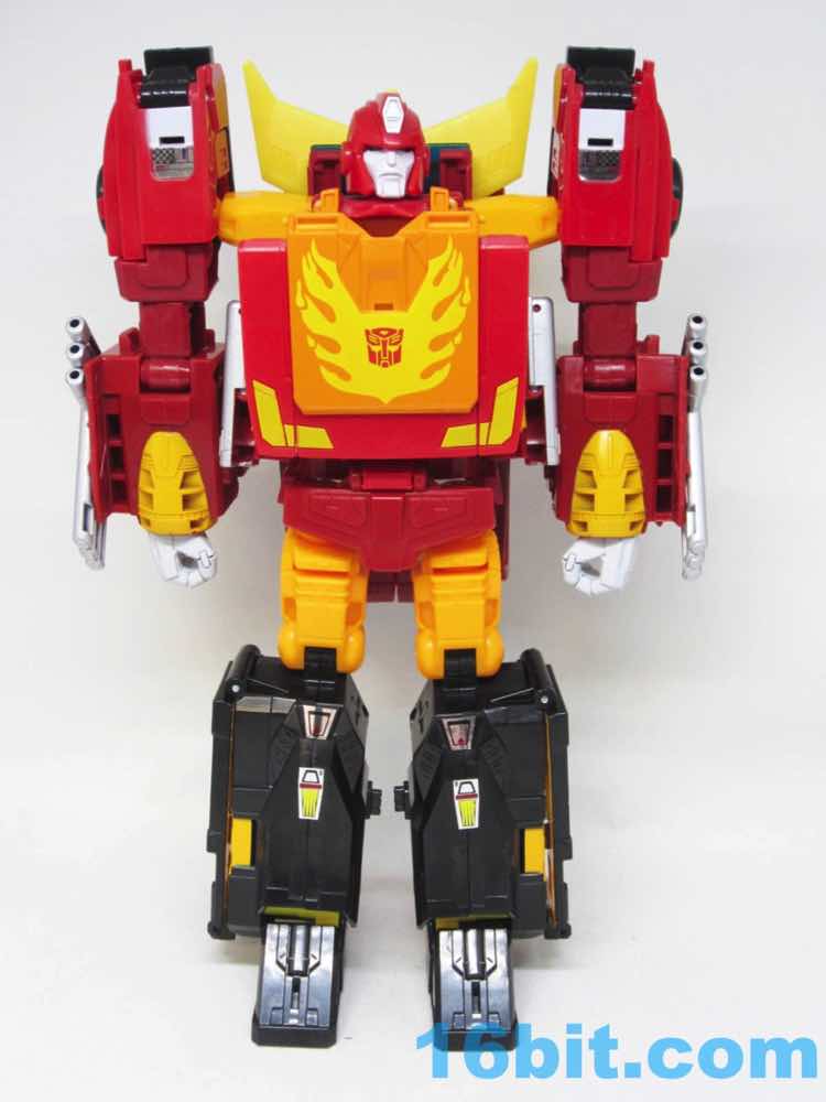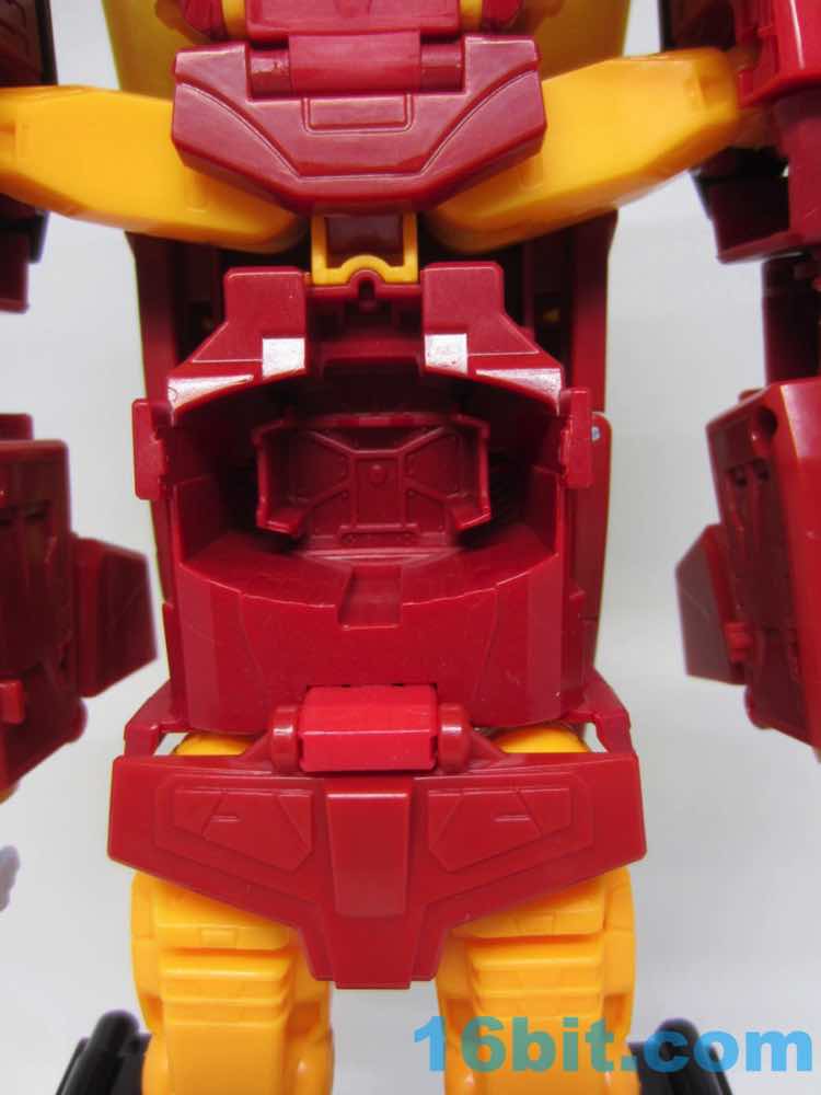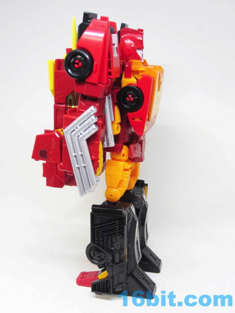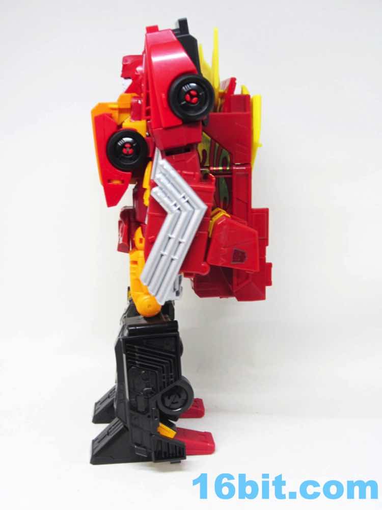The camper mode is pretty dorky - so was the original, but this one, even more so. Big Rodimus Prime's feet hang off the back, giving the long vehicle an appearance of a garbage truck. I expect the hatch to open to allow me to store parts in there - but this is not how it works. The clean lines of the original are gone, thanks to the need to cram all of the giant robot power suit kibble in a handy, pleasing Space Winnebago shape. The silhouette is decent, but the kibble is touch to miss. He's covered in slots and pegs and pins, plus there are big foil flame stickers that just make me nervous. The play features make this a forgivable weird toy since they were trying something big and now, but it's kind of ugly. There are lots of pieces to tab in place, and it works well. It may not look right, but it's ambitious enough that I would wager third-party fans would be jumping up and down to buy this. Since it's a Hasbro product, odds are it will get more criticism.