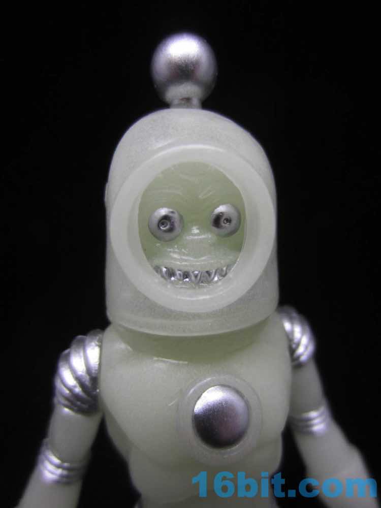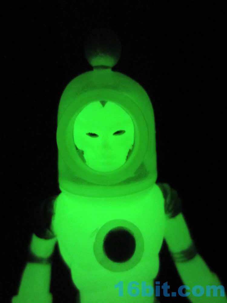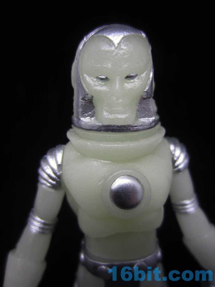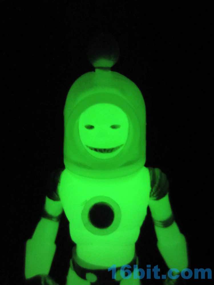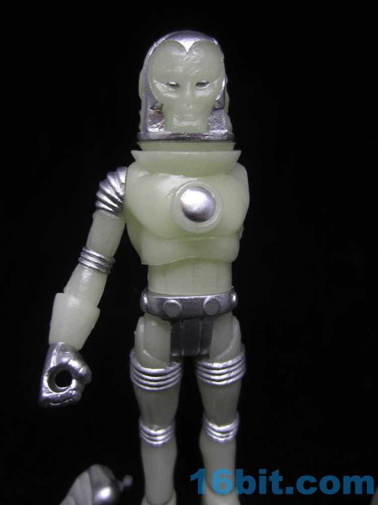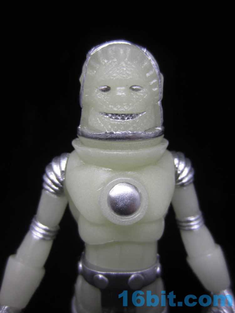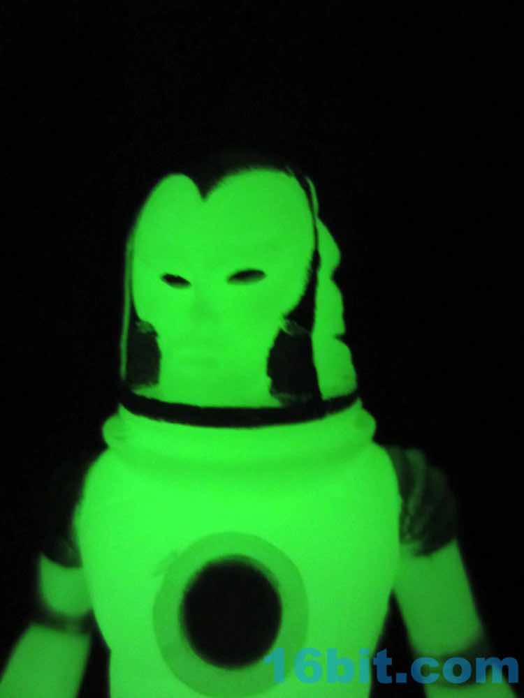 The Man from Alpha Centauri was based on an unproduced Colorforms benadable figure from nearly 50 years ago - it would have predated a rotating face gimmick on Man-E-Faces and other action figures to follow, while giving us a reptile face, an ape-like face, and what I would basically just call an alien face. In bare glow plastic they're difficult to make out, but the silver highlights added to this addition help them to stand out. The alien face has a silver border and tiny eyes. The ape face has huge eyes and a big silver grin. The reptile has a toothy smile and scaly skin. They stand out.