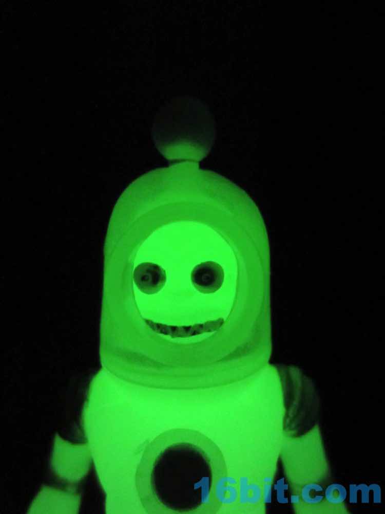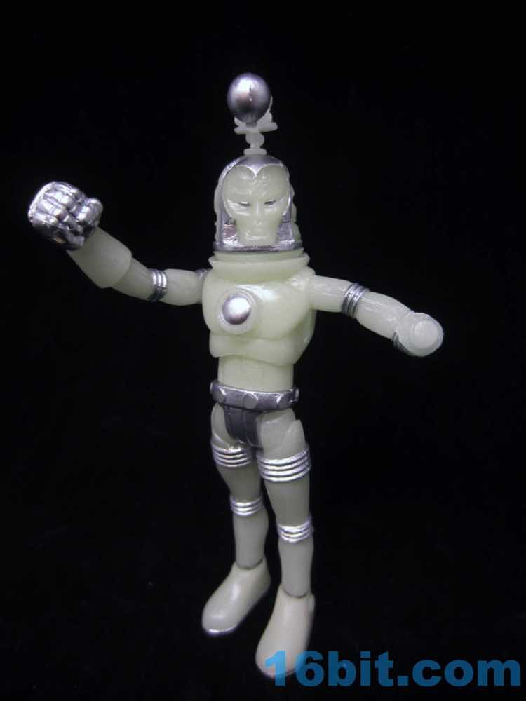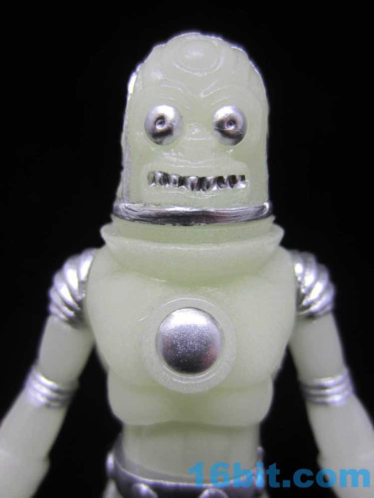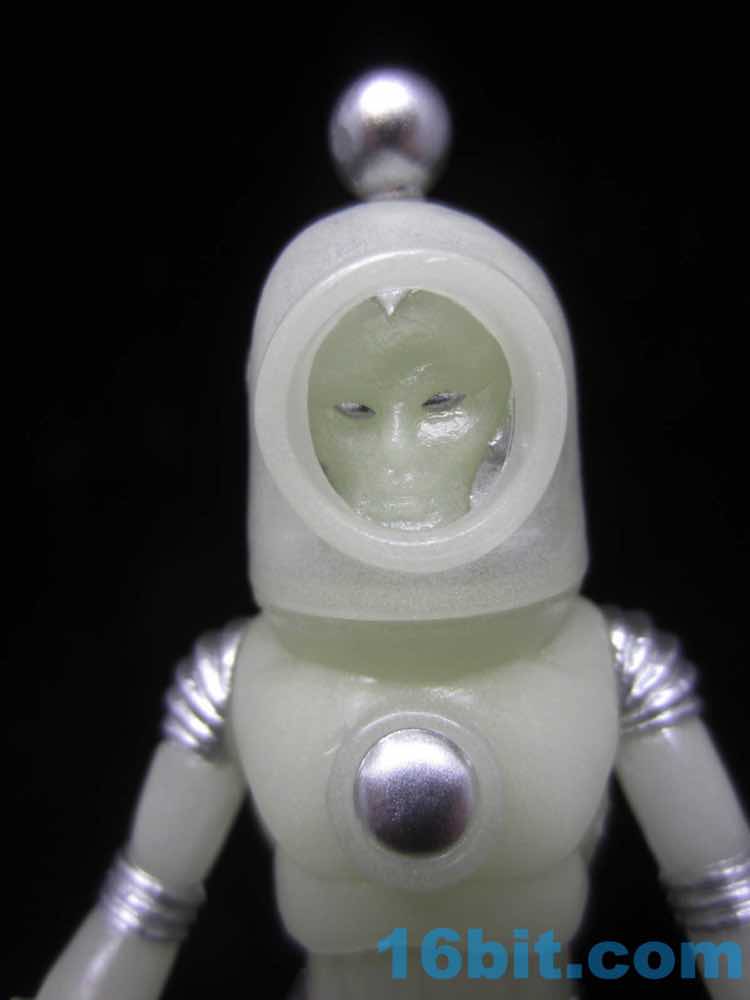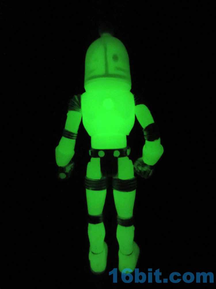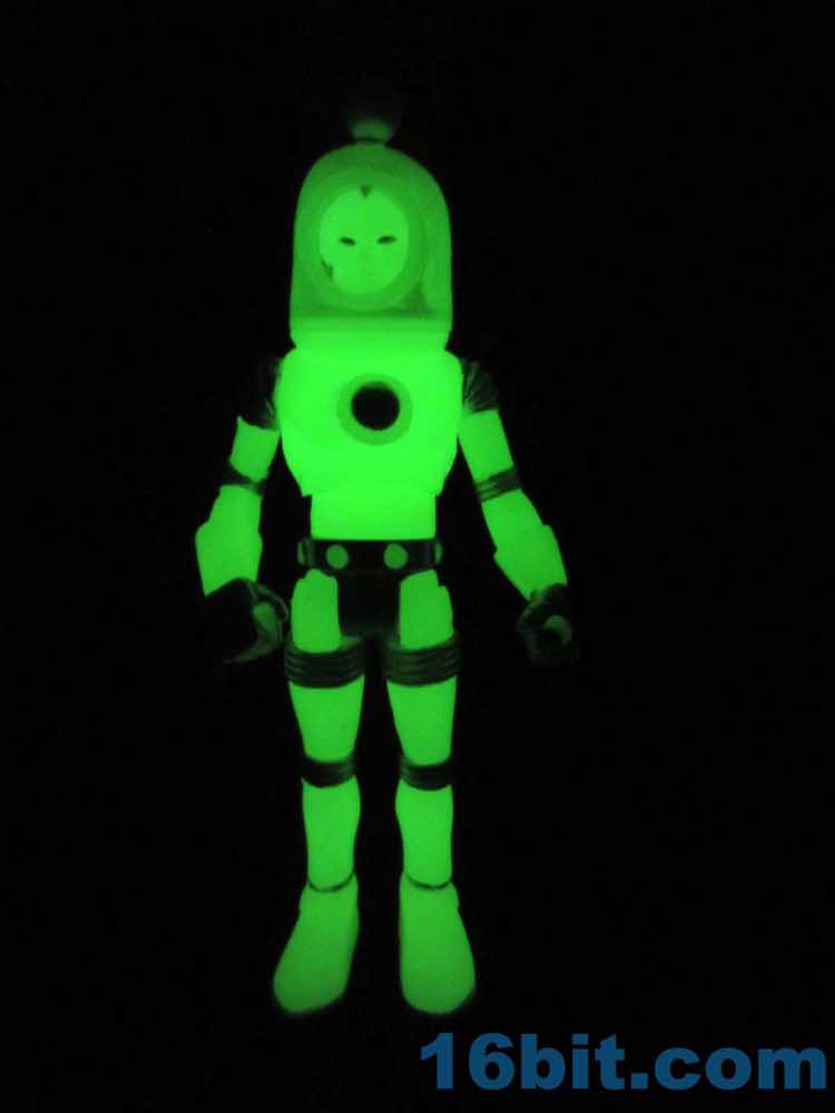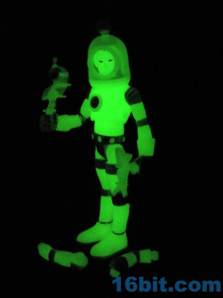 The Man from Alpha Centauri was based on an unproduced Colorforms benadable figure from nearly 50 years ago - it would have predated a rotating face gimmick on Man-E-Faces and other action figures to follow, while giving us a reptile face, an ape-like face, and what I would basically just call an alien face. In bare glow plastic they're difficult to make out, but the silver highlights added to this addition help them to stand out. The alien face has a silver border and tiny eyes. The ape face has huge eyes and a big silver grin. The reptile has a toothy smile and scaly skin. They stand out.