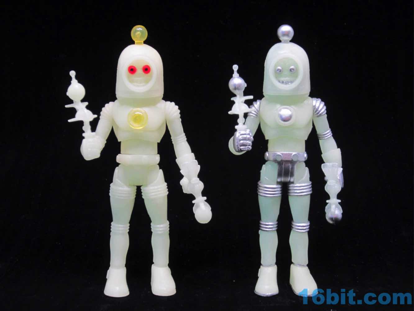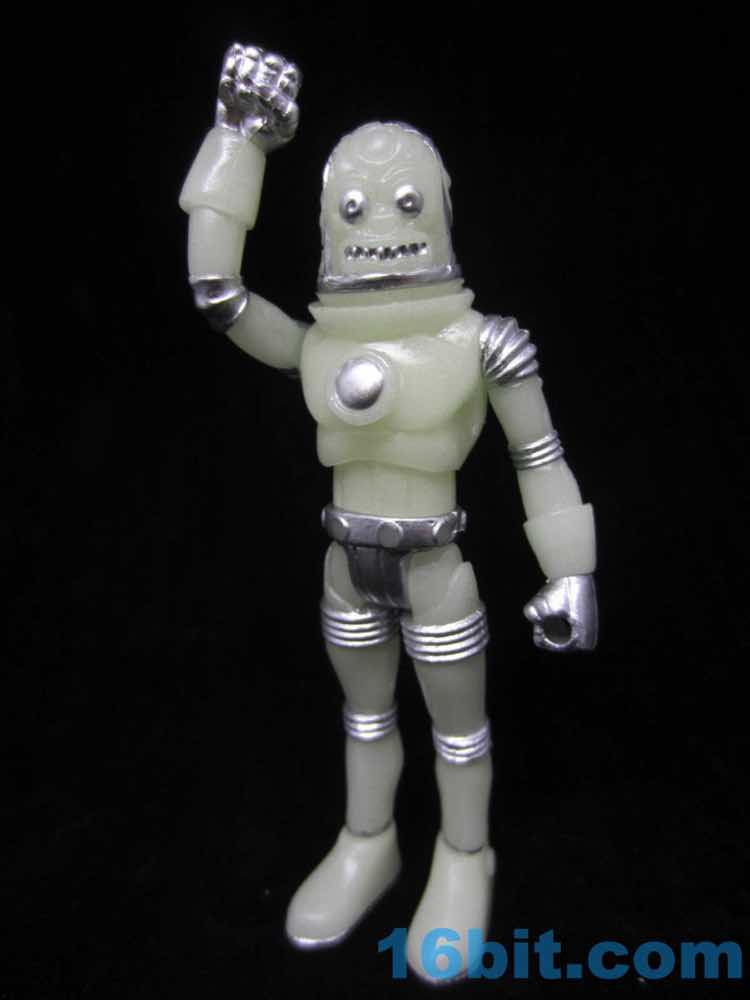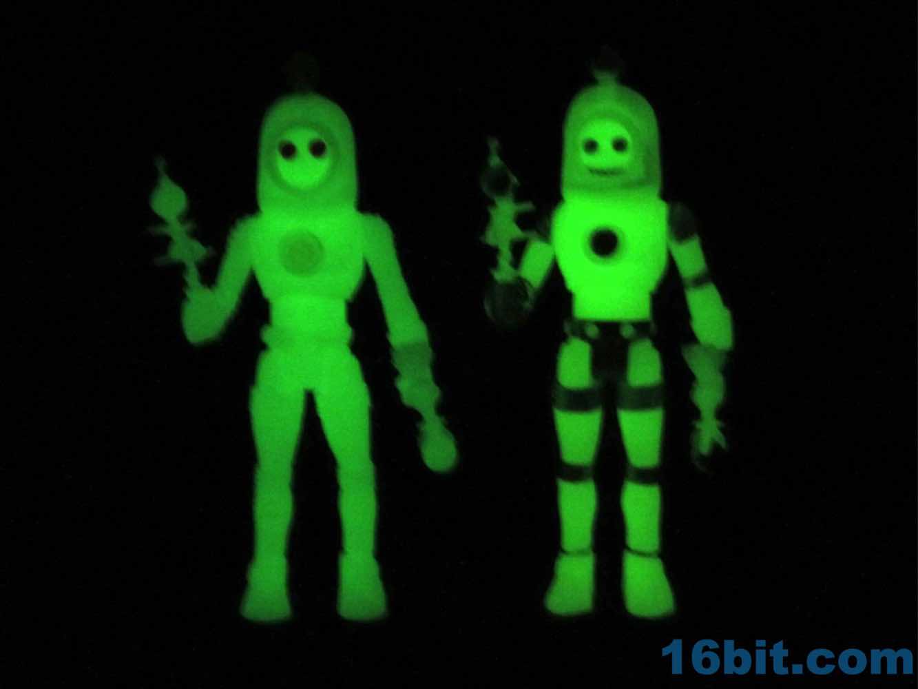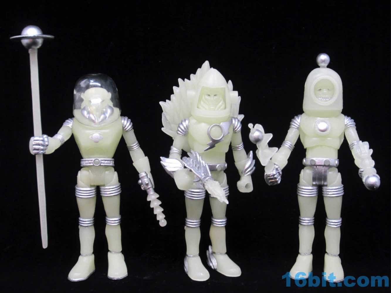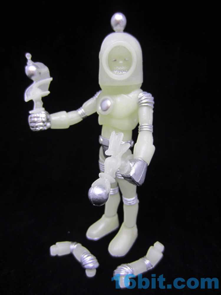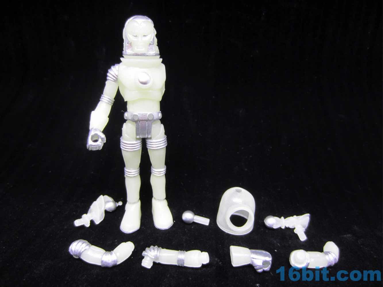 The Man from Alpha Centauri was based on an unproduced Colorforms benadable figure from nearly 50 years ago - it would have predated a rotating face gimmick on Man-E-Faces and other action figures to follow, while giving us a reptile face, an ape-like face, and what I would basically just call an alien face. In bare glow plastic they're difficult to make out, but the silver highlights added to this addition help them to stand out. The alien face has a silver border and tiny eyes. The ape face has huge eyes and a big silver grin. The reptile has a toothy smile and scaly skin. They stand out.