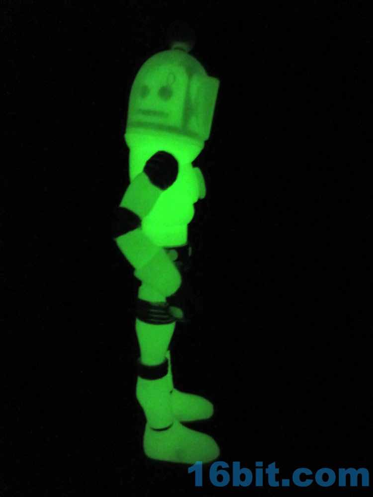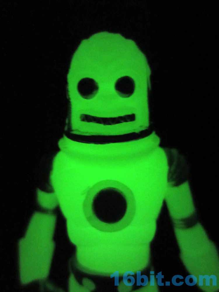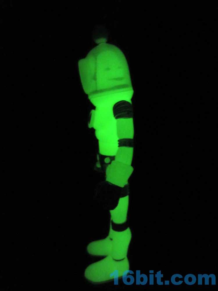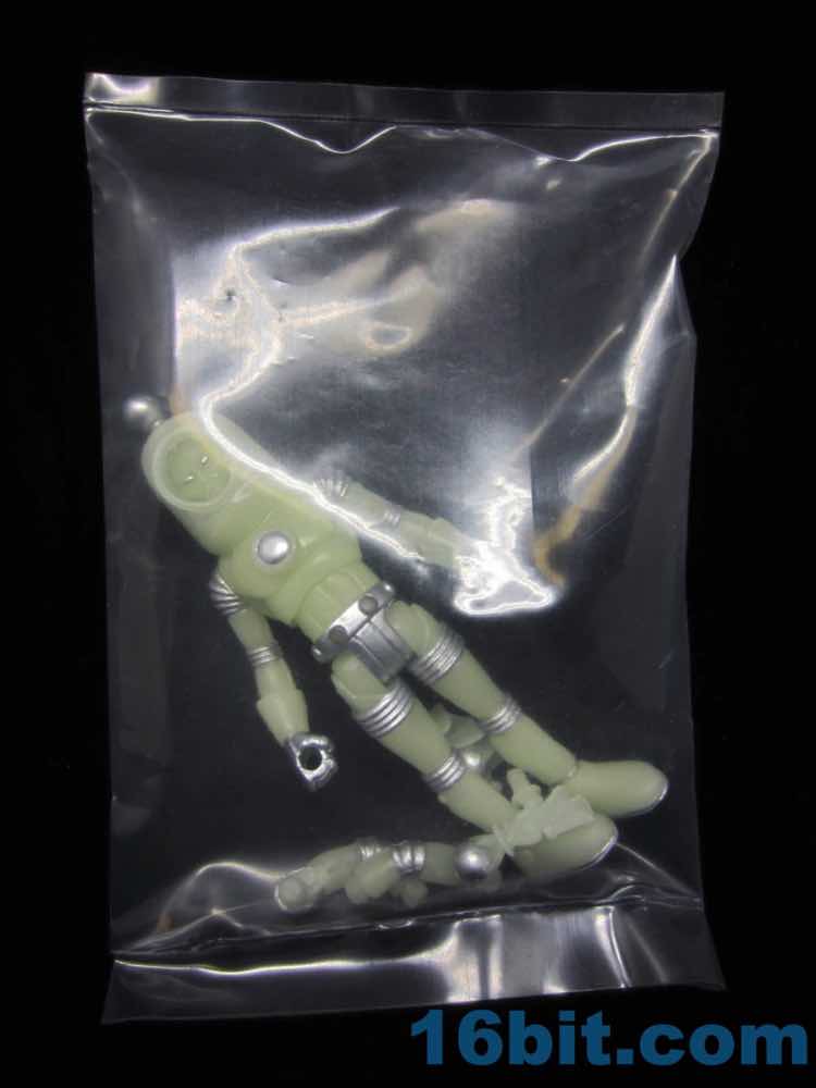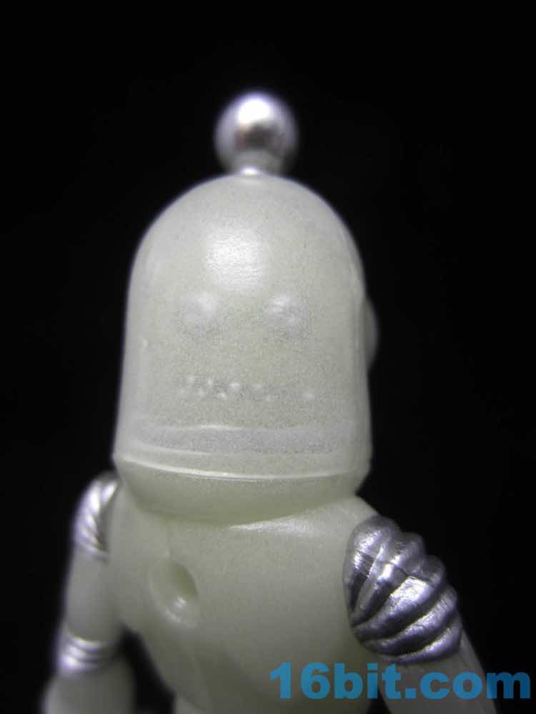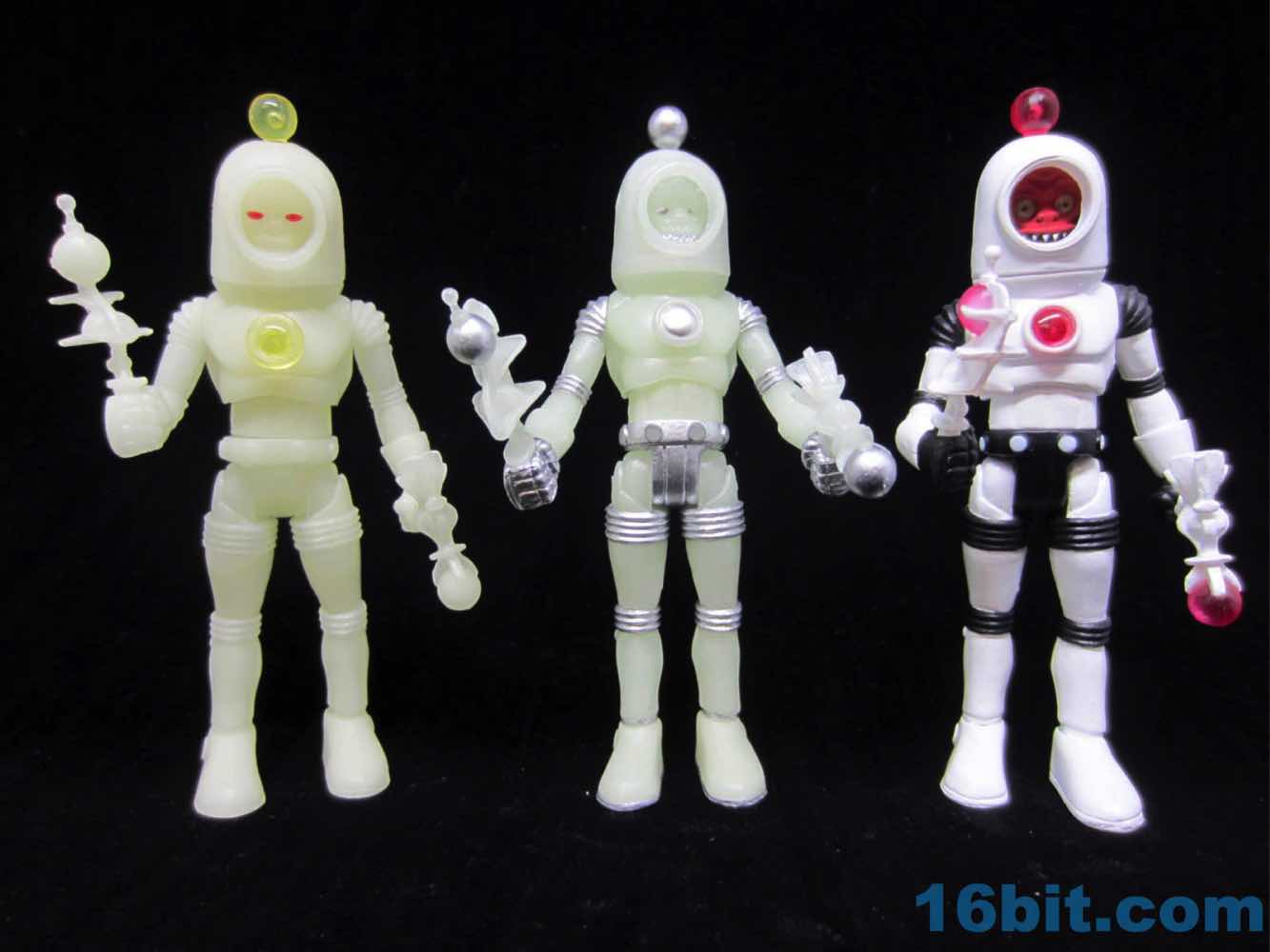 The Man from Alpha Centauri was based on an unproduced Colorforms benadable figure from nearly 50 years ago - it would have predated a rotating face gimmick on Man-E-Faces and other action figures to follow, while giving us a reptile face, an ape-like face, and what I would basically just call an alien face. In bare glow plastic they're difficult to make out, but the silver highlights added to this addition help them to stand out. The alien face has a silver border and tiny eyes. The ape face has huge eyes and a big silver grin. The reptile has a toothy smile and scaly skin. They stand out.