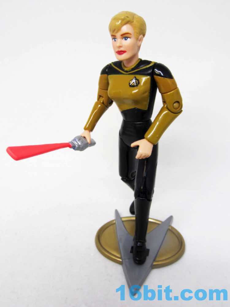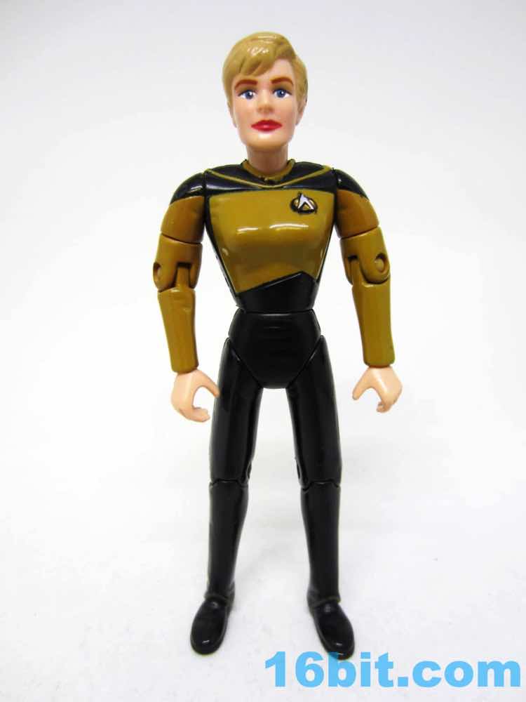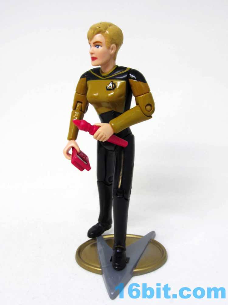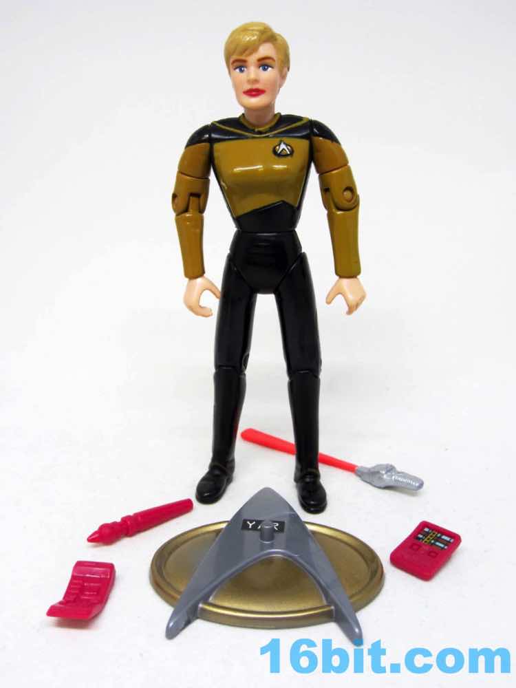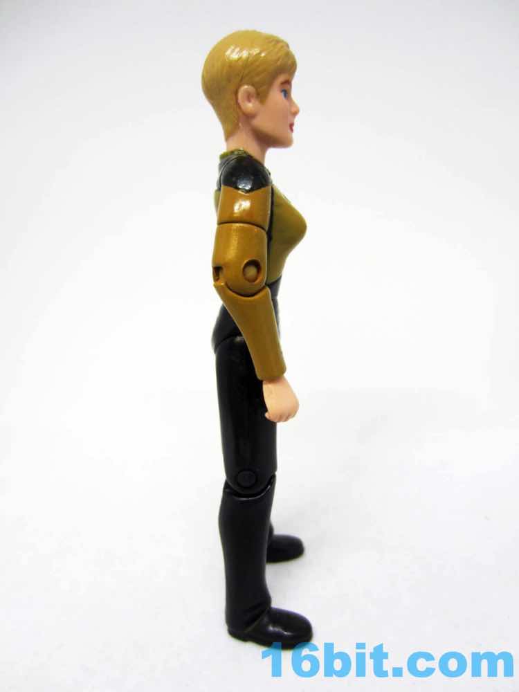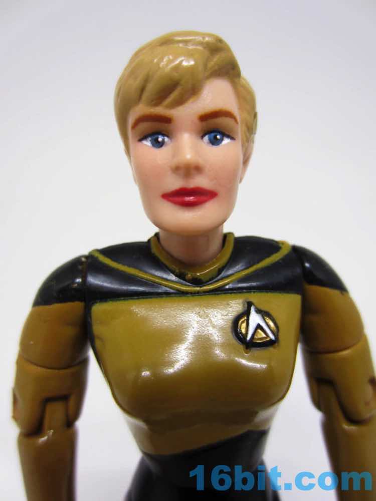 The 4 1/2-inch action figure was one of several for Yar in Playmates' line. This one is based on her first season appearance, eschewing the "action pose" sculpting and tricorder holsters of her crewmates. Interestingly, Playmates wouldn't do the entire crew in their debut duds - Dr. Crusher, Wesley, and Riker didn't get season one-specific figures. Worf really doesn't nail that early look, either. Yar gets it mostly right with the distinctive collar, but the front-zipper on her uniform is missing and the pips are a little close to the collar. The color is a little muted, and it doesn't have the weird no-quite-spandex look of the costumes on the series. In other words, it's a typical action figure.