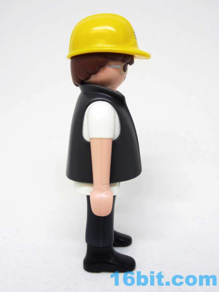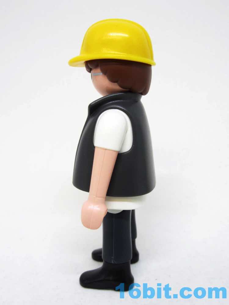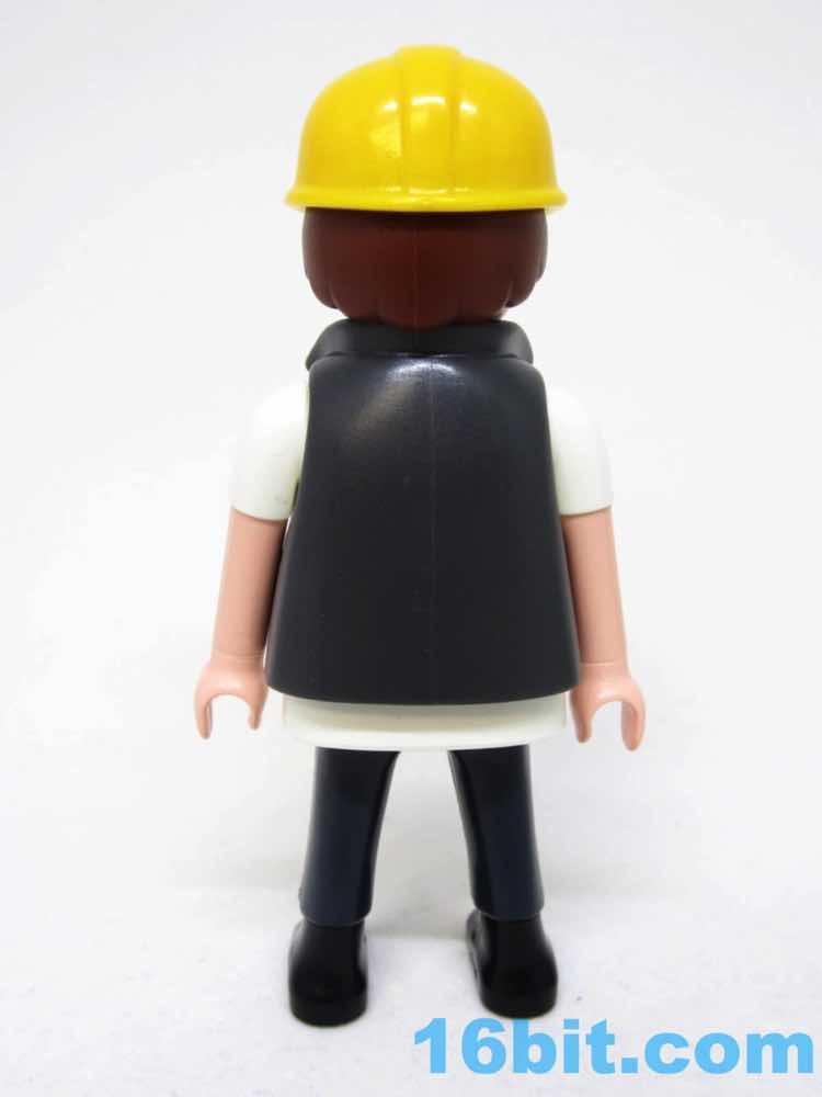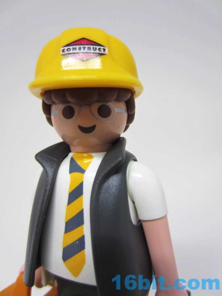 The figure is a pretty great white collar middle-class dweeb. Glasses, short sleeve shirt, IKEA-colored tie, and a vest with a briefcase. This might be a 1950s IBM employee. His silver rimmed glasses look a bit like mine, actually, with a bright yellow hard hat reading "Construct" on it. I love this detail because it looks like it could be a licensed brand or logo, but it's just some thing they made up. It looks great. As always he has six points of articulation with nicely integrated wrists.