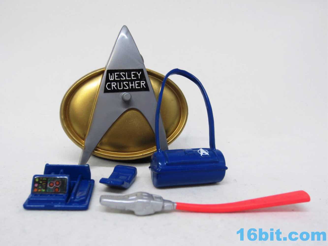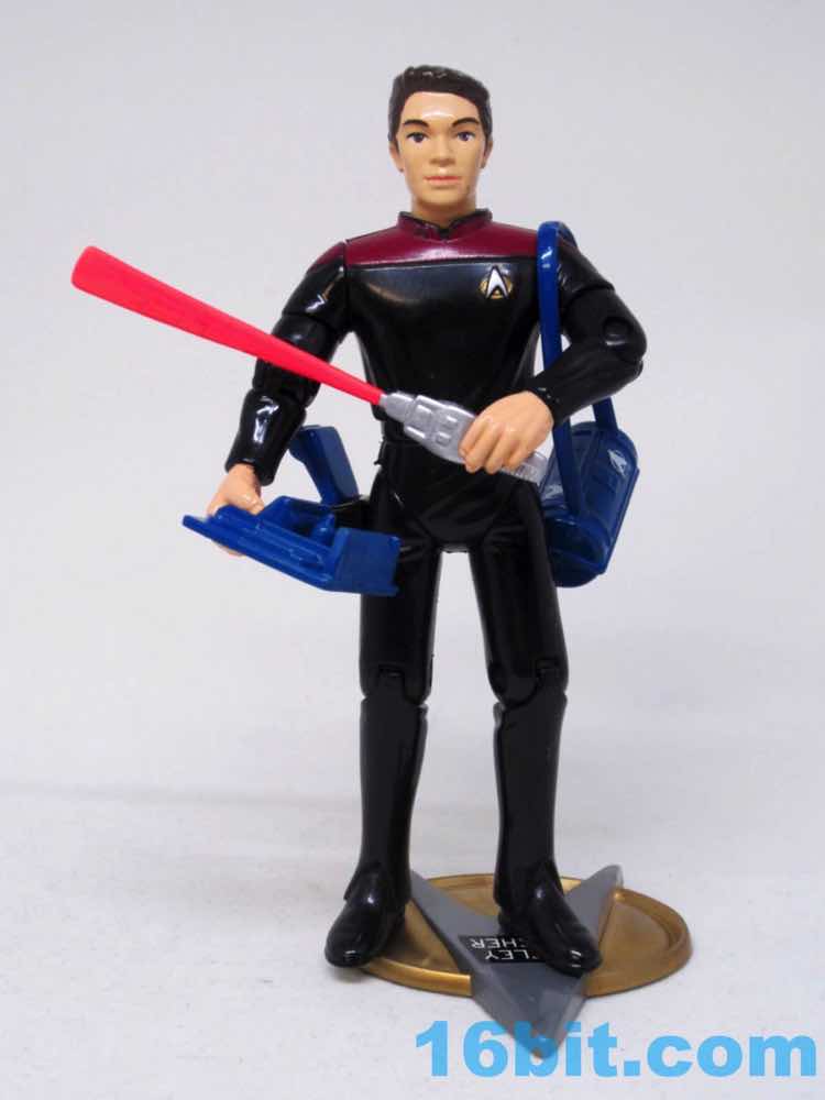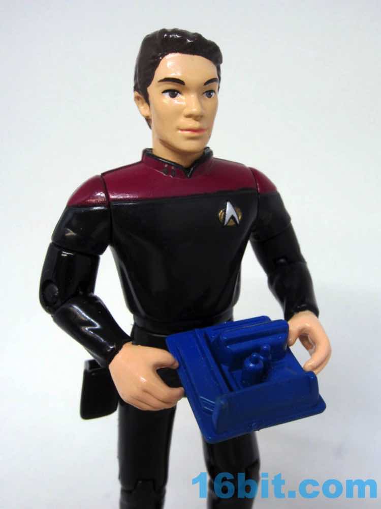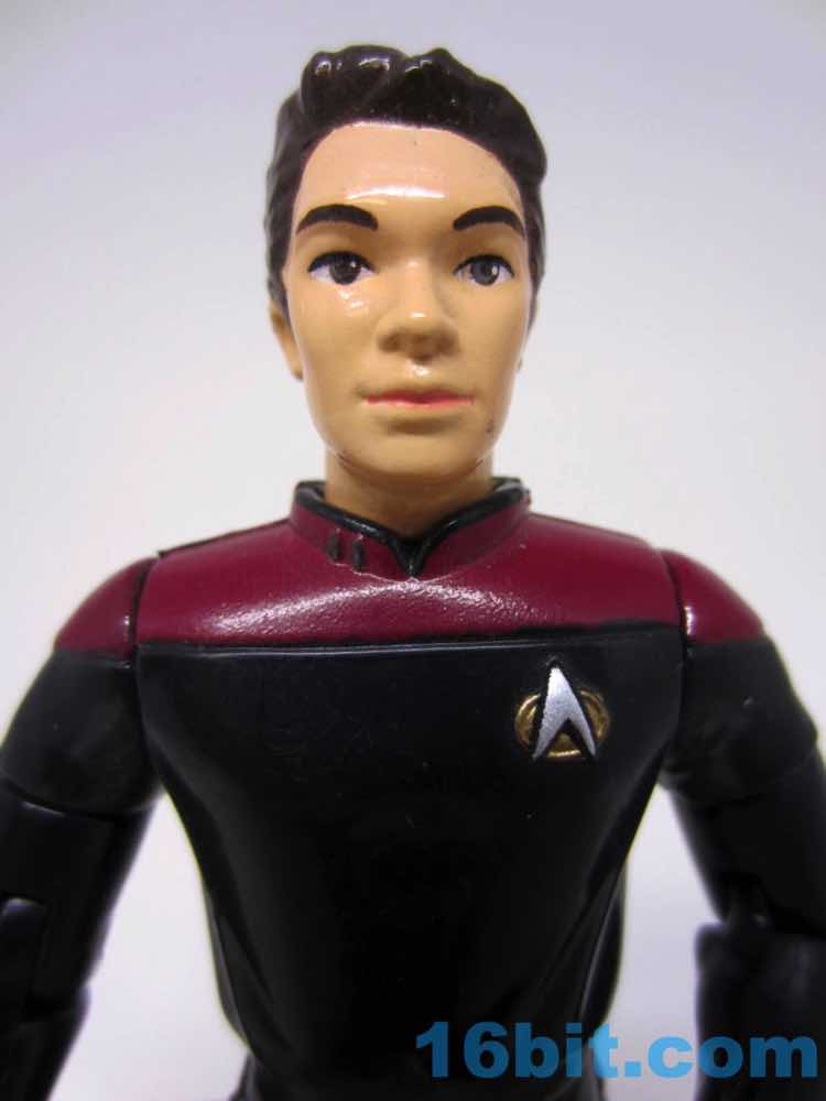 The 4 1/2-inch action figure is dressed like you saw him in "The Game" and "The First Duty," which is also quite similar to Deep Space Nine 's duds. Wes has two pips indicating he's a Cadet 3rd Class, which means he's a second year student. The black outfit has a red splash of color on the shoulders plus a typical commbadge. There's not a lot of paint here, but what's really strange to me is the painted face - Playmates went back and forth, offering figures with painted flesh and molded hair, or molded flesh and painted hair. Q got it both ways with a variation, and I only saw Wes with the painted face - but online photos show a molded face exists, too. His hair color is a little off, and his eyes seem a little wide - other than that, at least the uniform is about right. The portrait could be better, and while I wanted to say it wasn't bad... it's not good.