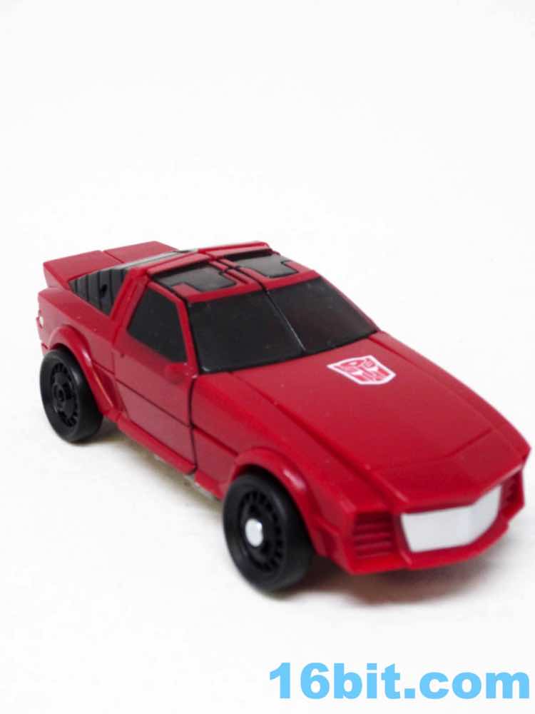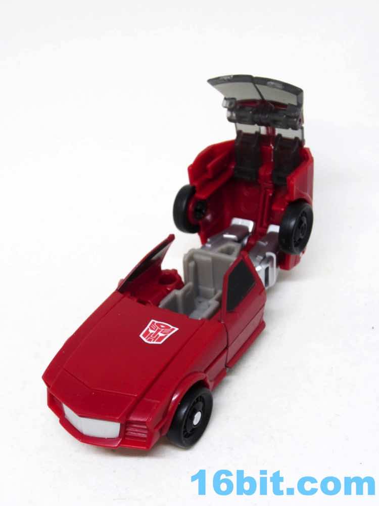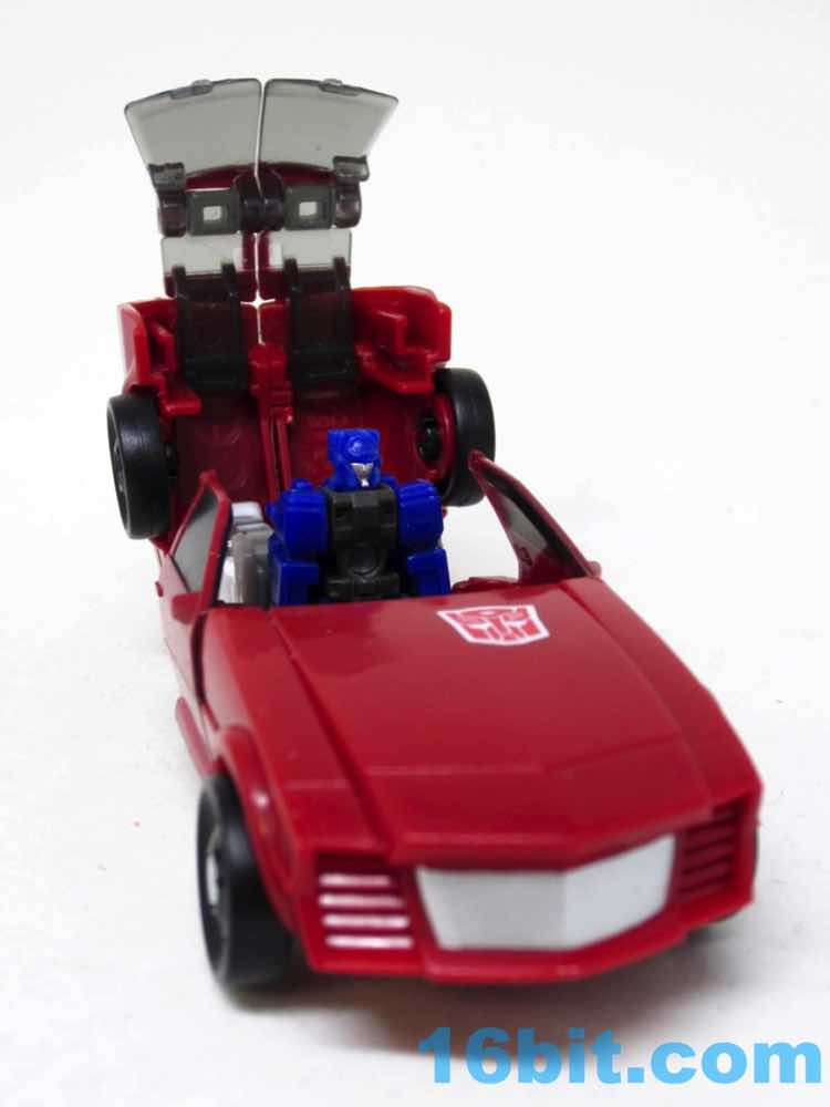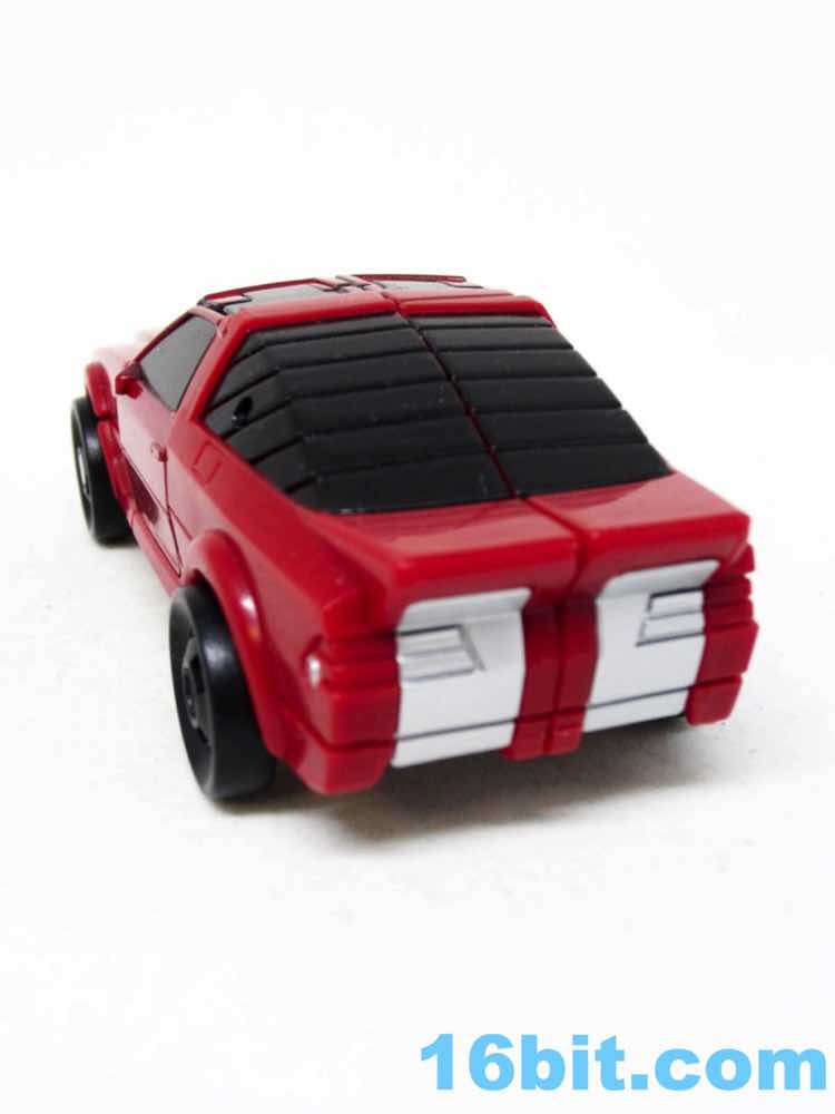 The resulting car is both great and weird. A not-quite Pontiac Firebird Trans Am comes in to focus with spinning wheels, plus a spiffy Autobot symbol. This part, I love. What I don't love is the decision to paint the side windows. The toy is molded in clear plastic, so the decision to paint the windows black is a head-scratcher. It doesn't roll particularly well, but at least we got a decent looking little red toy car with seating capacity for one Titan Master or Prime Master inside.