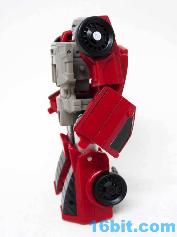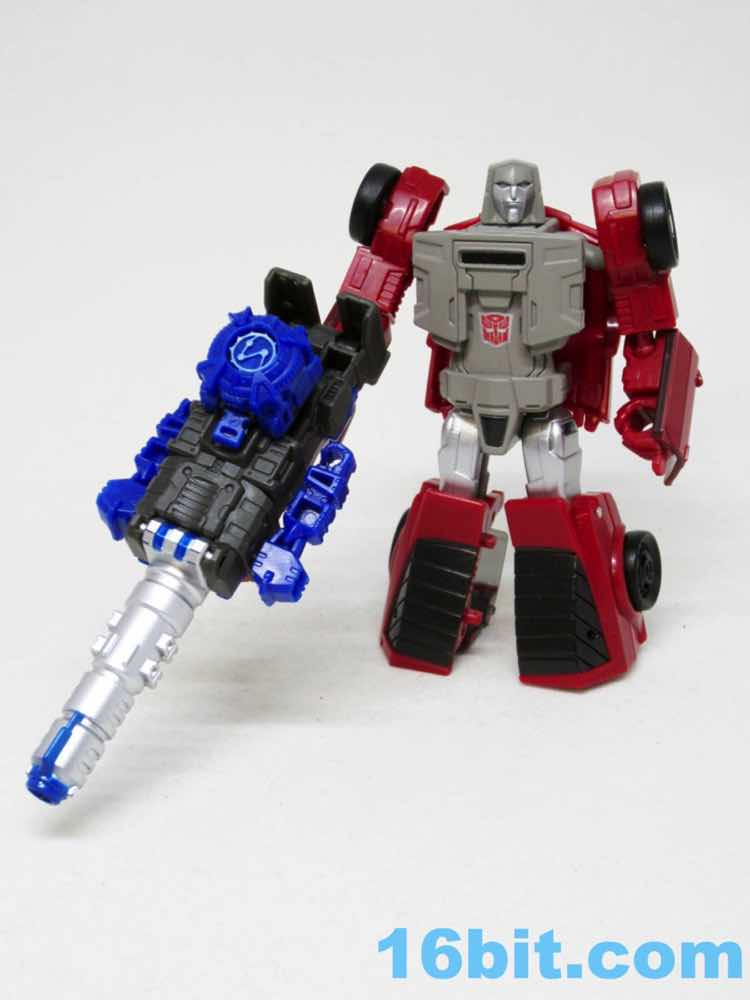 The robot mode is similar to the bulk of Legends-class Autobot cars. He has 11 meaningful points of articulation, and appears mostly like the cartoon except for the feet. The legs from the knees on down are clearly car bits, while the cartoon had silver legs with car part shoes. Power of the Primes Windcharger's head and chest are very similar to the cartoon - take a look at the torso in particular. The sincle line on the chest and the area around his robot Speedo are similar to the image on the TFWiki, with a boxy head that looks fair amount like that drawing. The colors are a little different - the grey is closer to a tan flavor, as opposed to a cooler blue flavor - but it's still a solid toy robot and a good modernization of that design. The range of motion is absolutely acceptable, but at this scale there's not a whole heck of a lot you need him to do.