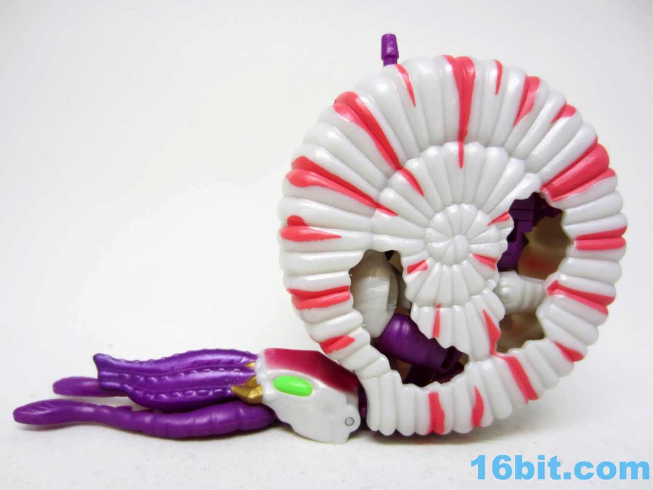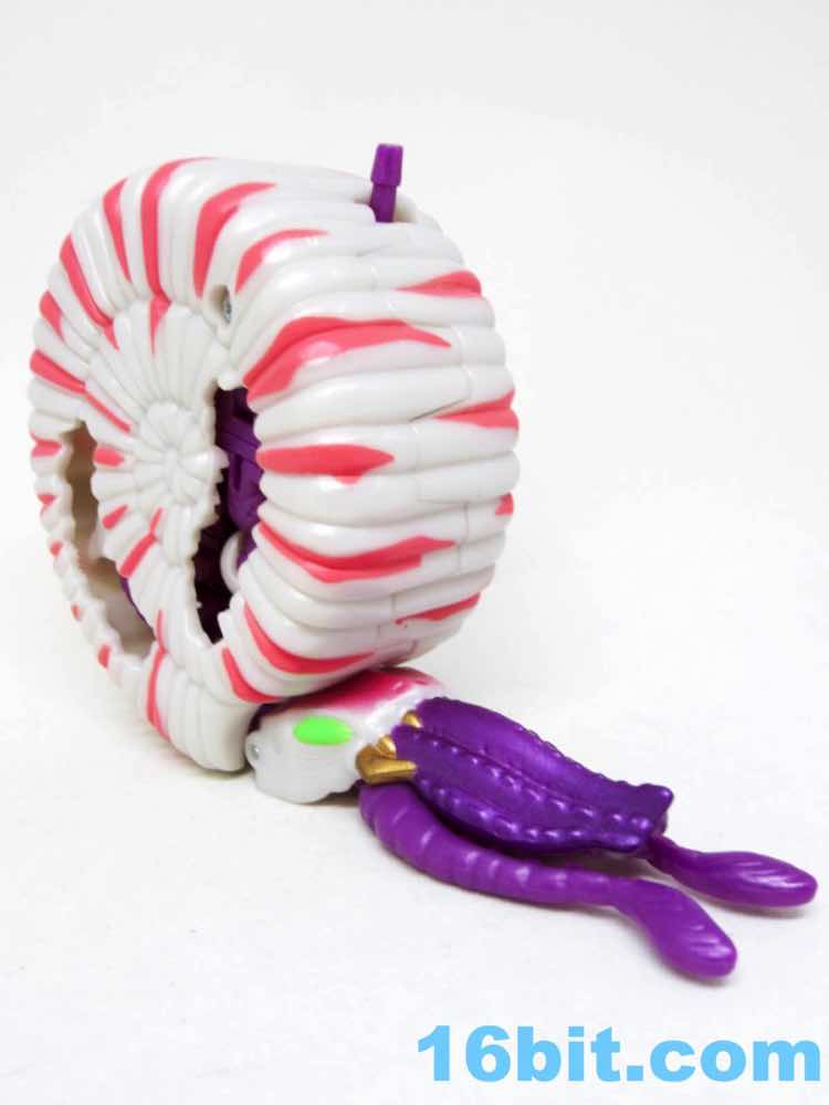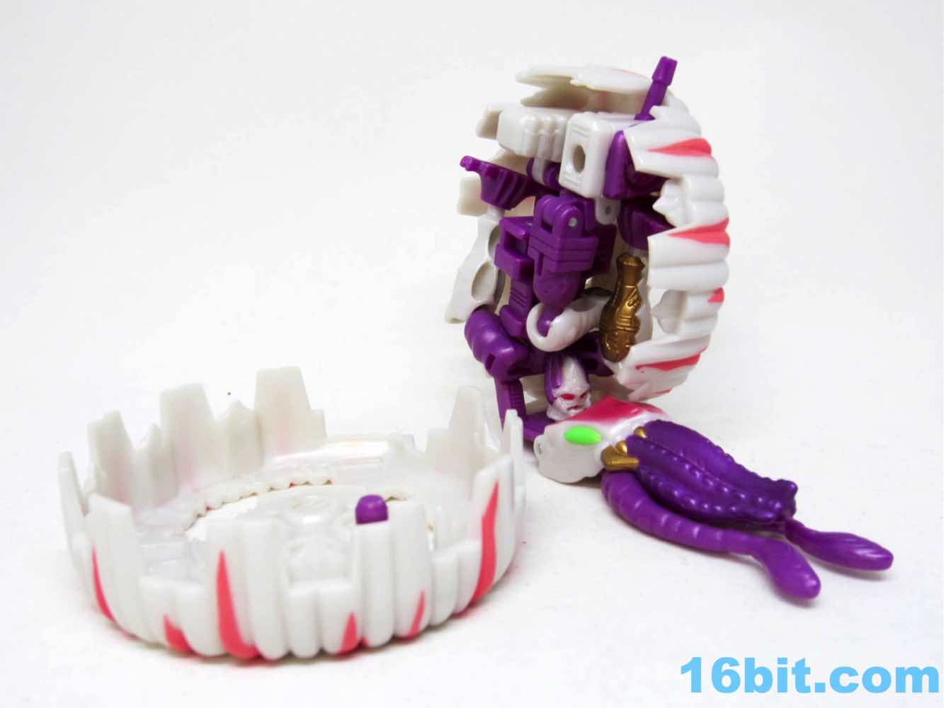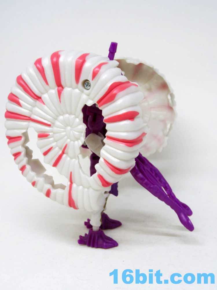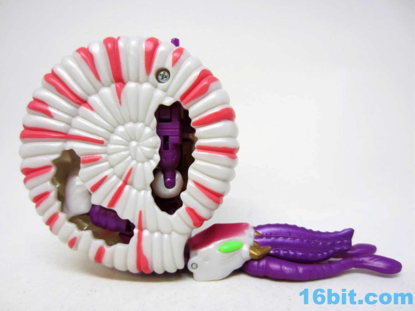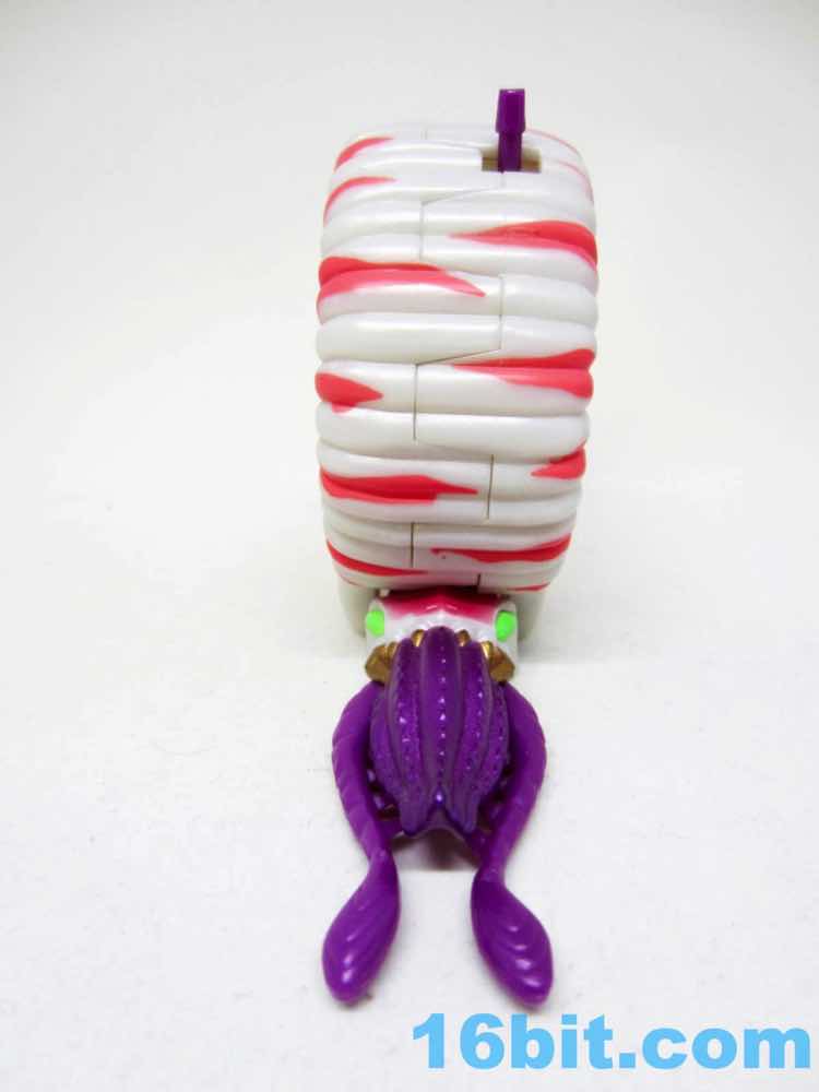 The robot is a 4-inch warrior with a Destronger (Predacon) spark crystal on its right shoulder, indicating where the spring-loaded launcher is for the shell. You can display the figure with or without the shell armor, and it sports 11 meaningful points of articulation. Squid-like detail on the face include tentacles for hair and a weird little red tongue behind a pearlescent face with subtle teeth. The feet also have squid elements on them, plus you have the whole beast head as the chest. I can't say the arm design does much for me, but he can hold his weapon and just plain look neat.