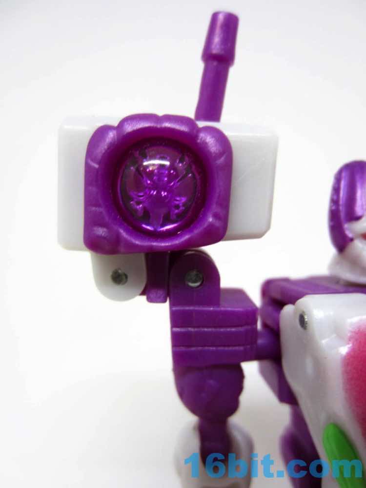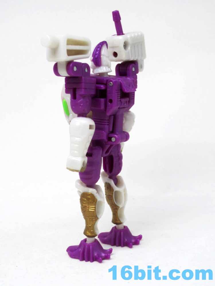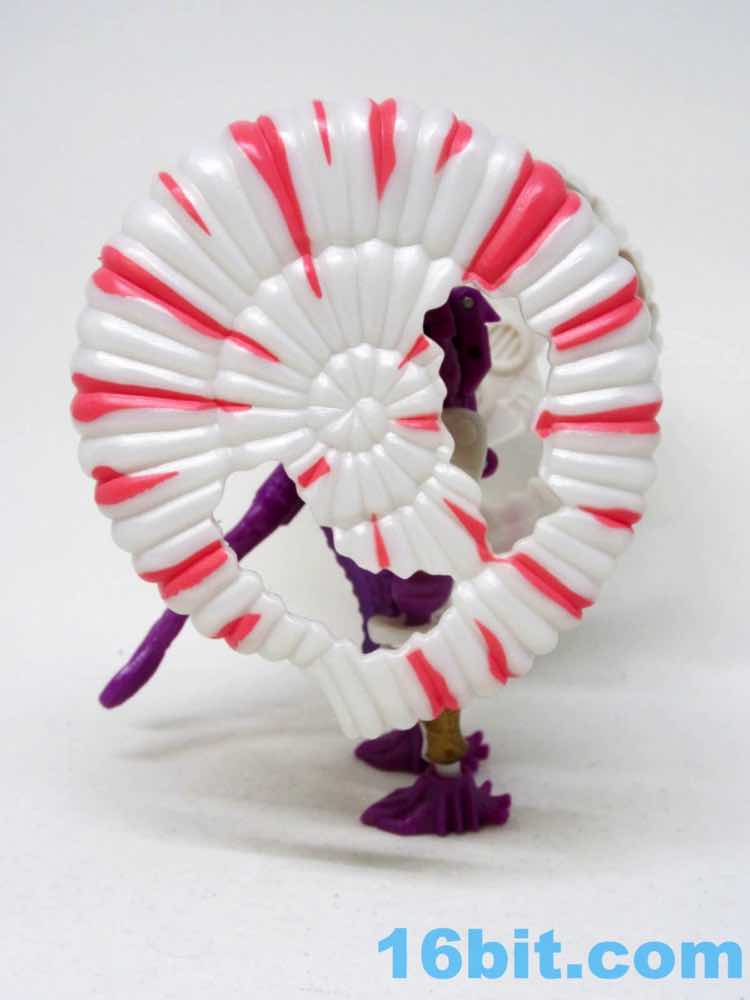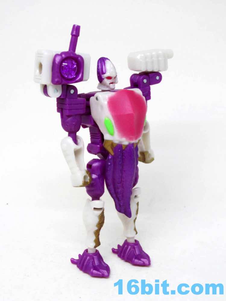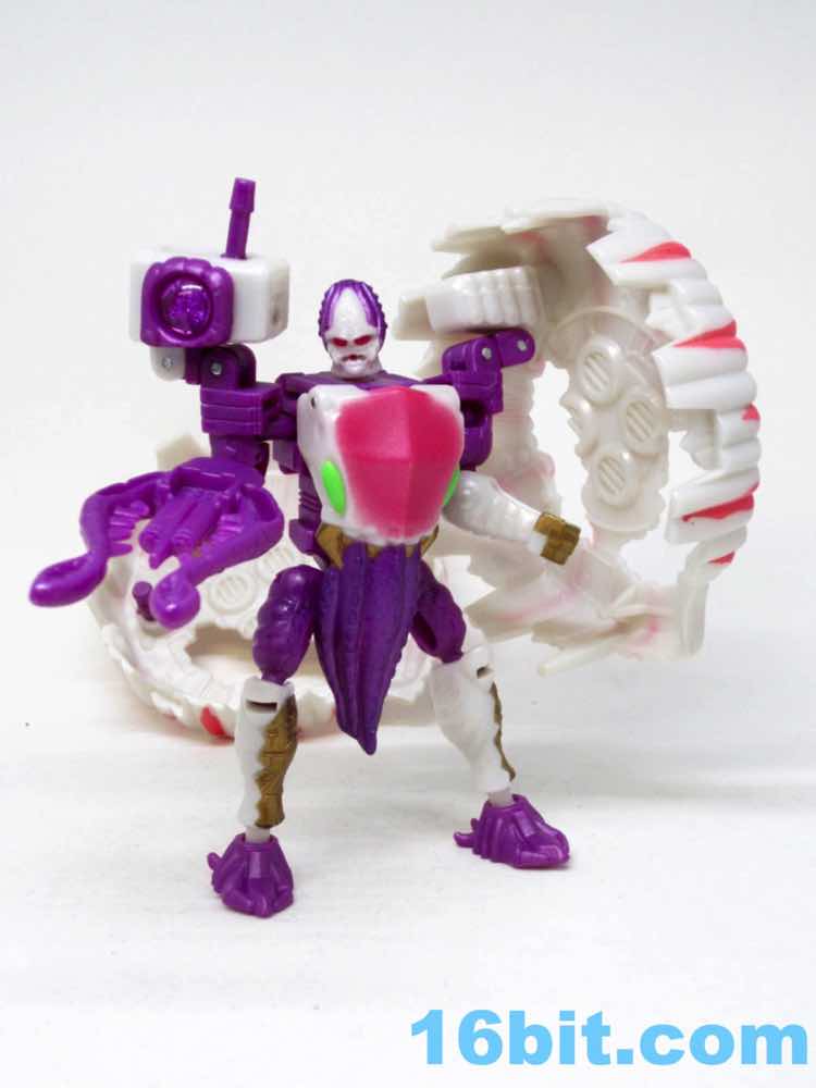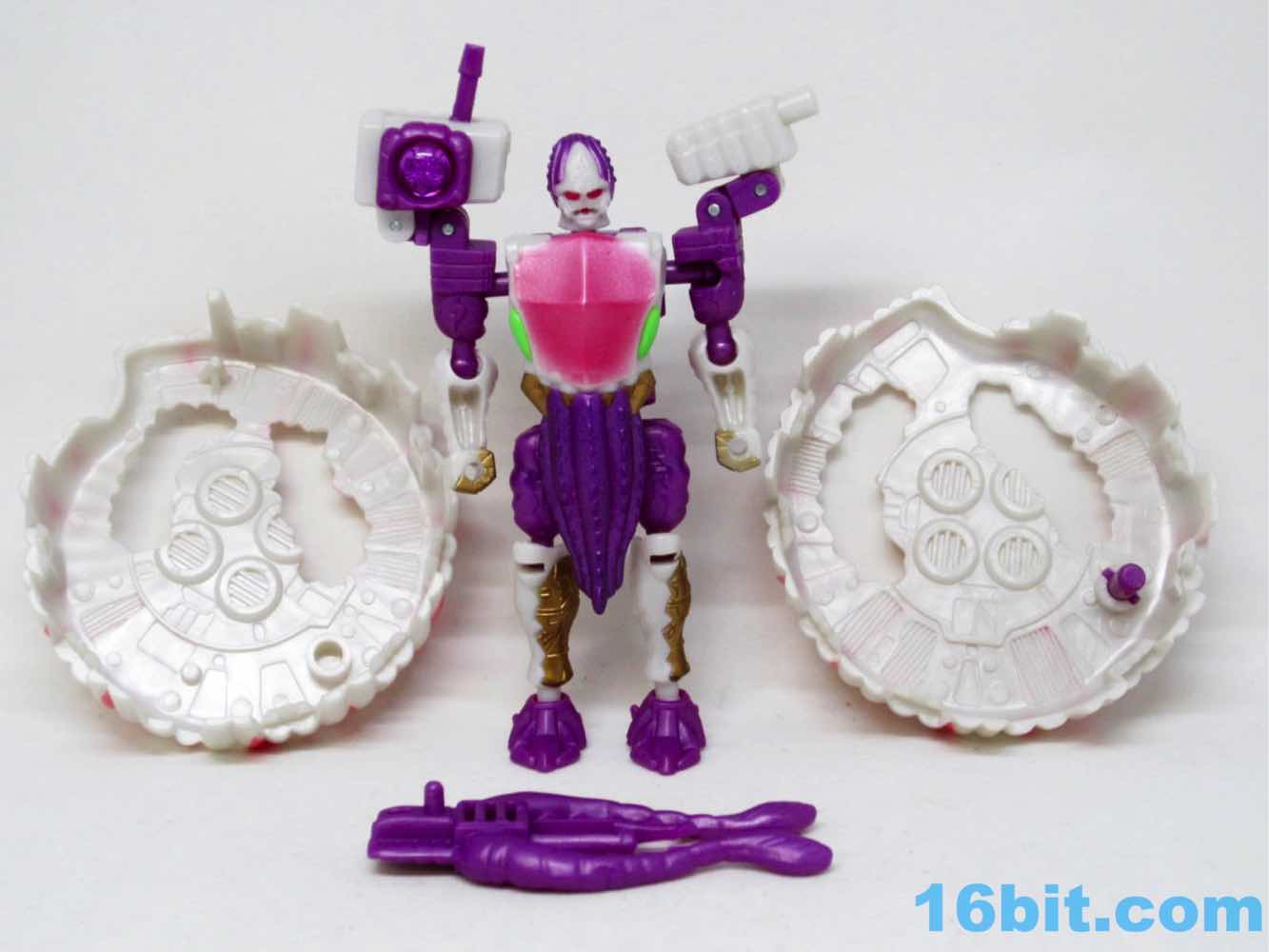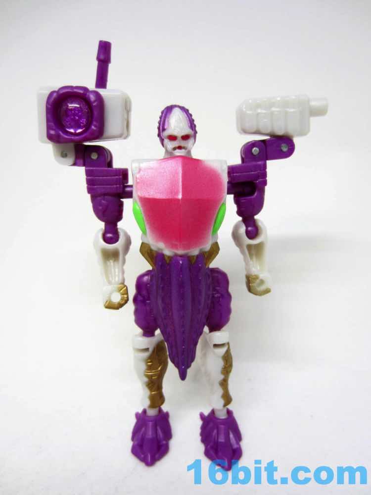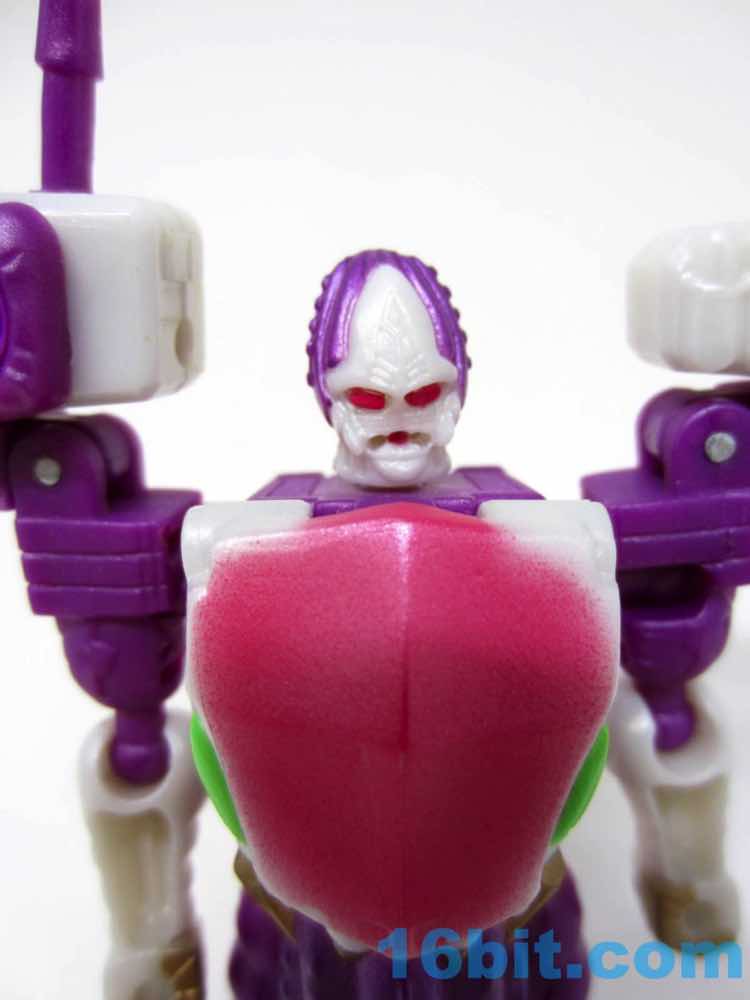 The robot is a 4-inch warrior with a Destronger (Predacon) spark crystal on its right shoulder, indicating where the spring-loaded launcher is for the shell. You can display the figure with or without the shell armor, and it sports 11 meaningful points of articulation. Squid-like detail on the face include tentacles for hair and a weird little red tongue behind a pearlescent face with subtle teeth. The feet also have squid elements on them, plus you have the whole beast head as the chest. I can't say the arm design does much for me, but he can hold his weapon and just plain look neat.