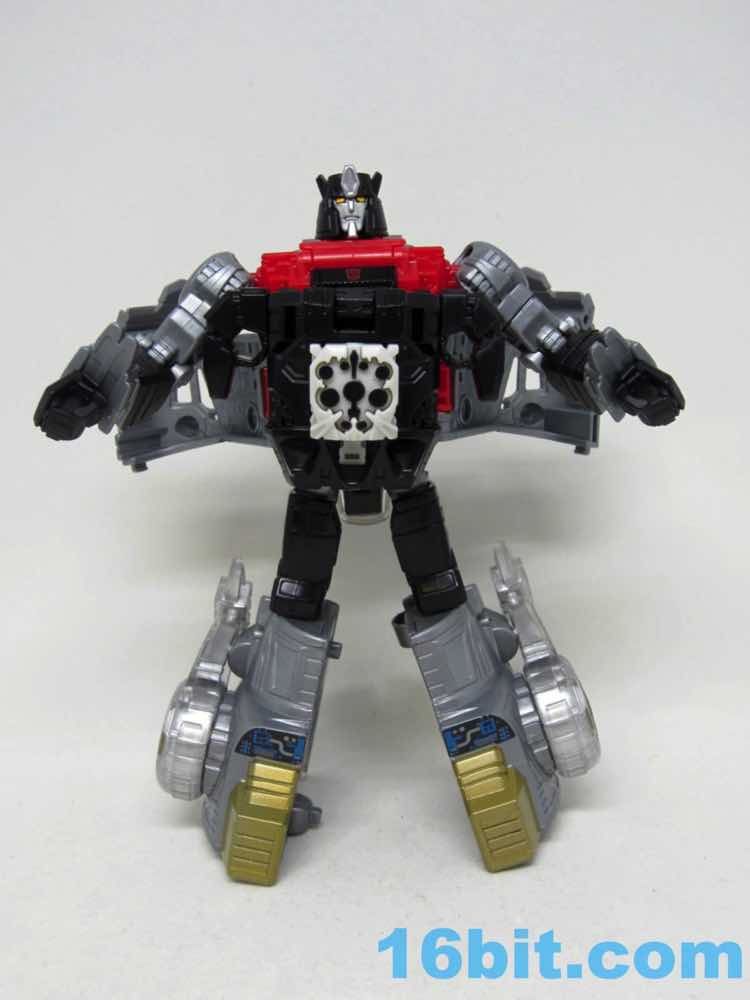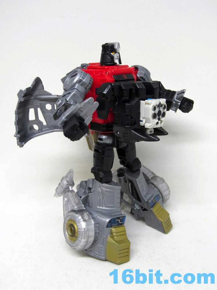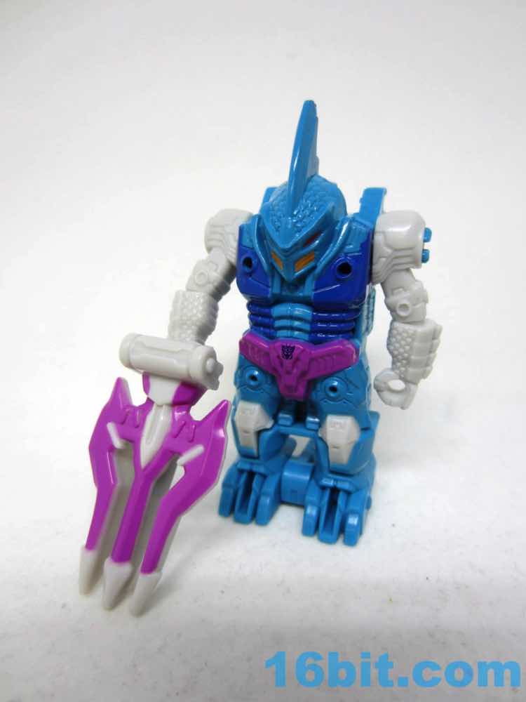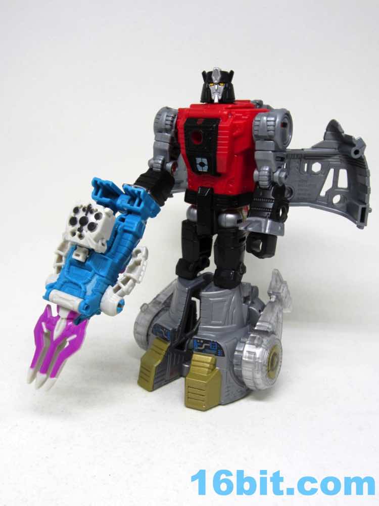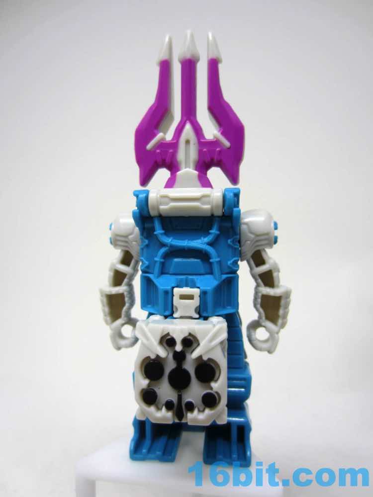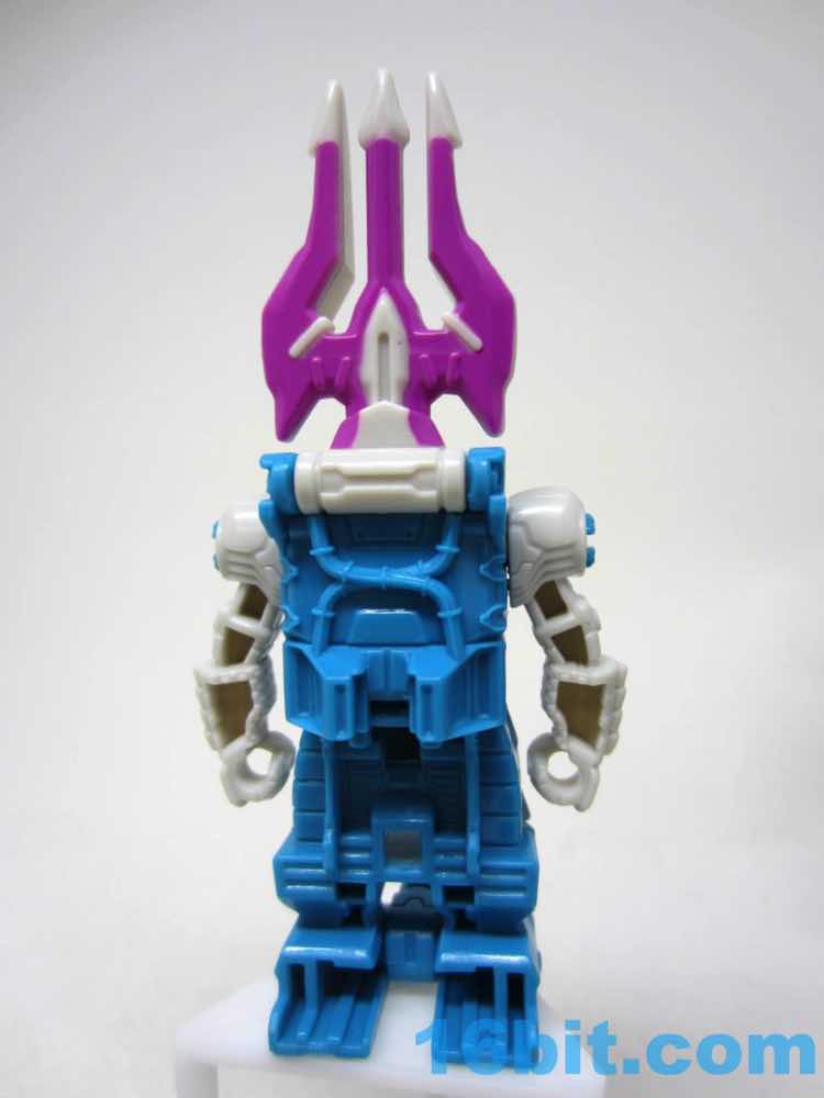 The original suit looked more like a Super Sentai villain, and the new one is a little more robotic. It's still a biped, but the legs and arms are more robotic than organic like the 1988 original toy. The arms swivel freely, and he has a little Decepticon symbol over his purple off-brand Speedo. The purple coloring doesn't extend to a suite of accessories like during the good old days, but you do get a purple splash over the grey claw weapon hidden behind the figure's neck.