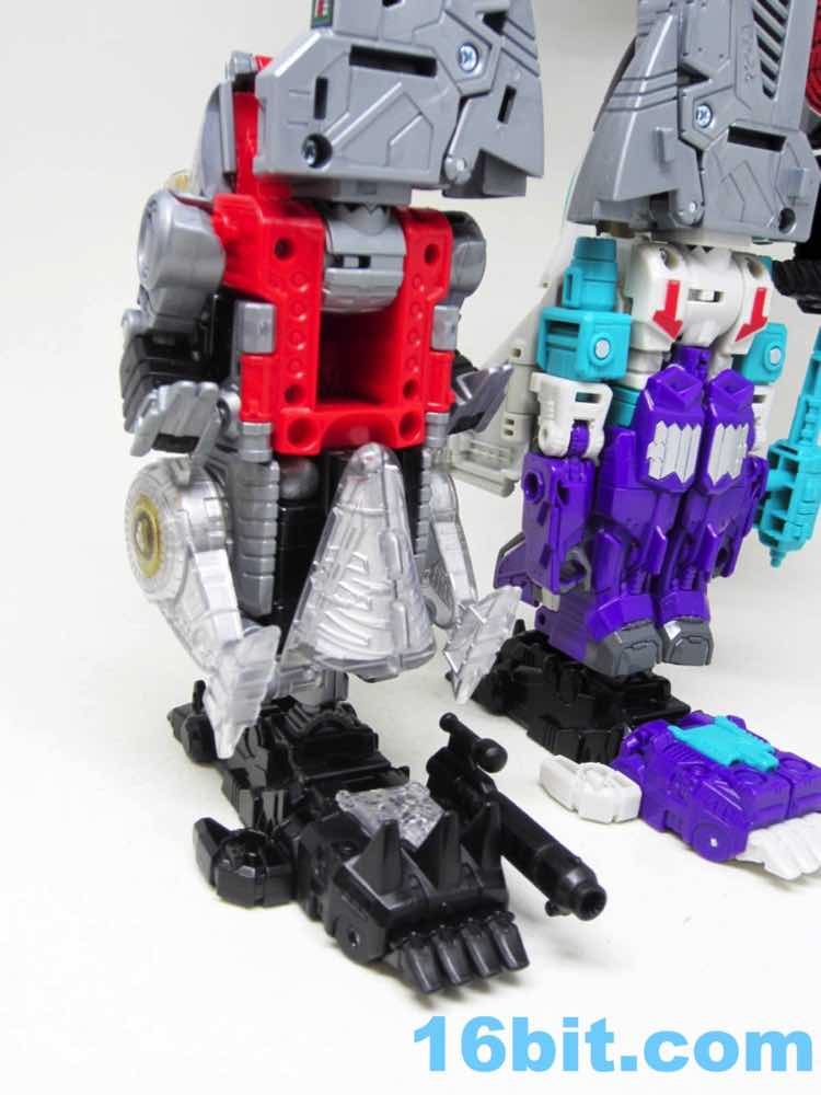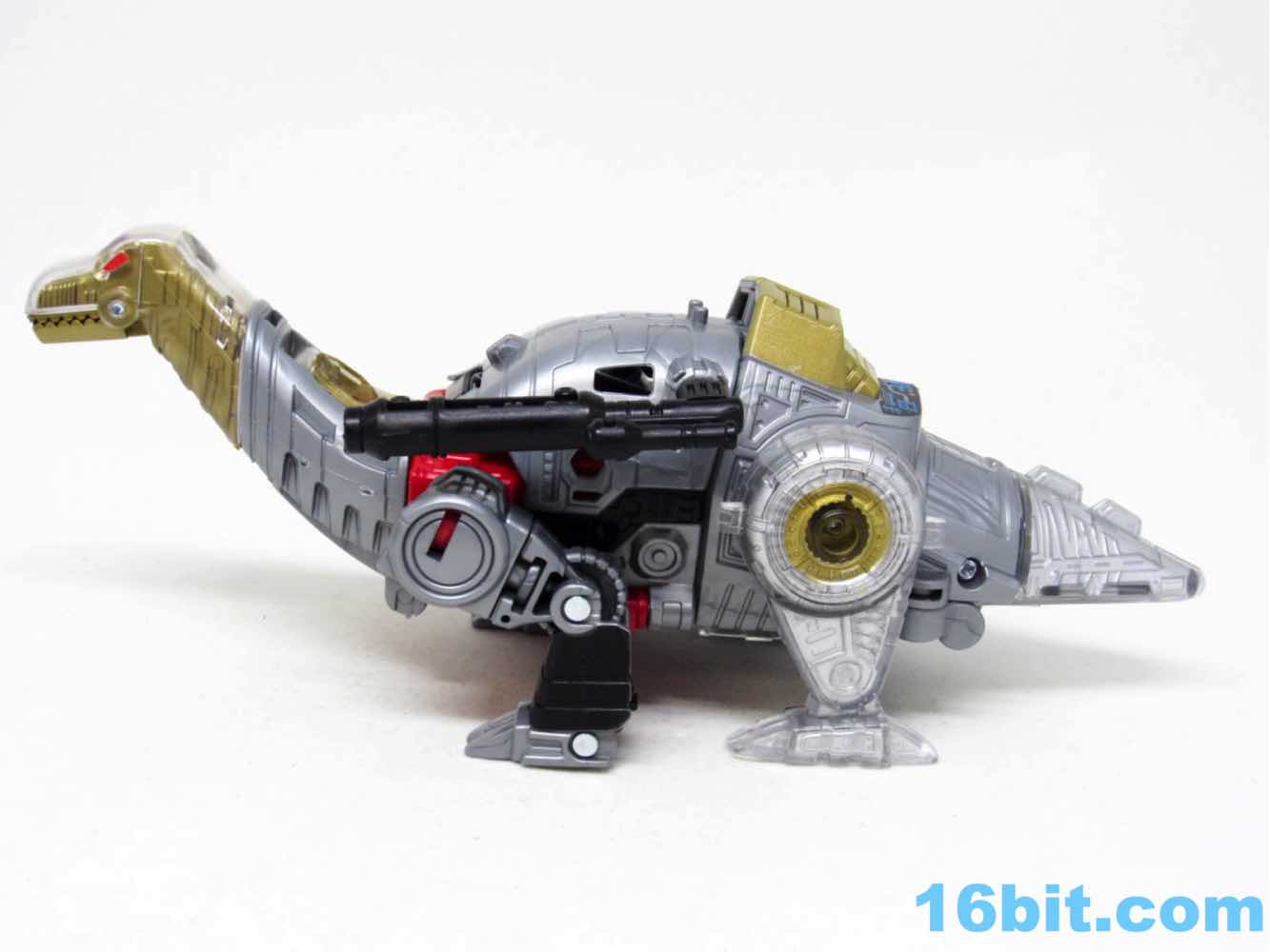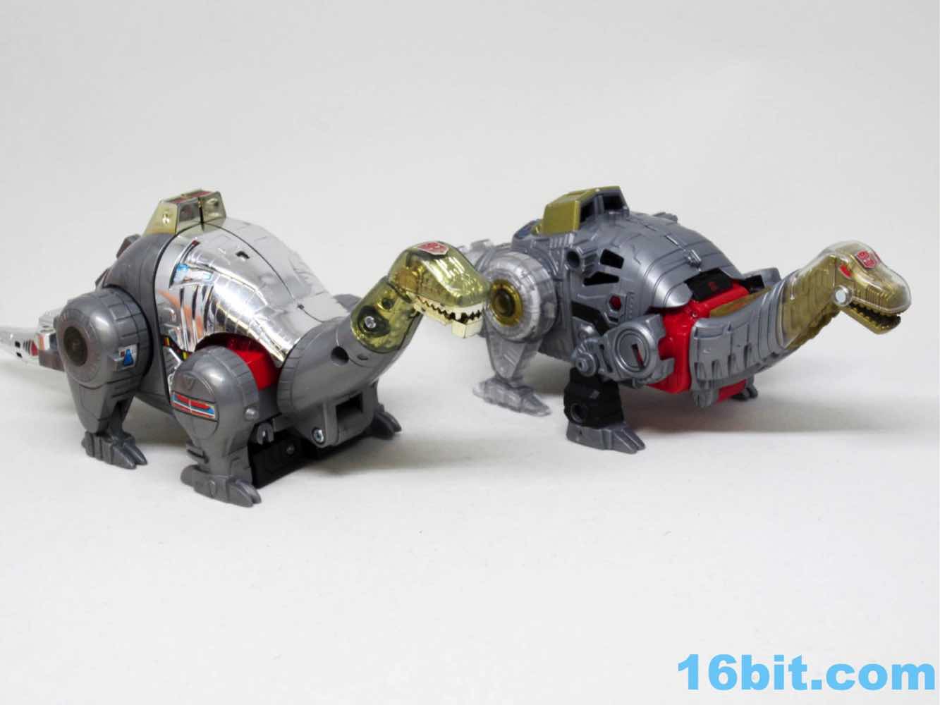 The alt mode is kind of amazing - back in the 1980s people still used the term "brontosaurus," which was deemed inaccurate and the substitute "apatosaurus" took over. Until recently - another species was discovered and now a brontosaurus is a real thing again. (It's not like the term fell out of total favor in pop culture, thank you Fred Flintstone.) What he lacks in silver he makes up for in red eyes and a decent smattering of grey. I have no idea why they insisted on giving him black legwarmers, but here you go. The arms are twisted around a bit thanks to how it recycles parts from Slug, so it's a good - but not great - dinosaur with exposed tabs and slots. He has a better range of motion than his G1 forebear, but he's still pretty stiff. I wish he had a chrome tail, but I assume the clear with silver may hold up better over time given how some recent chrome toys have gone. If gold flakes, what hope do we have?