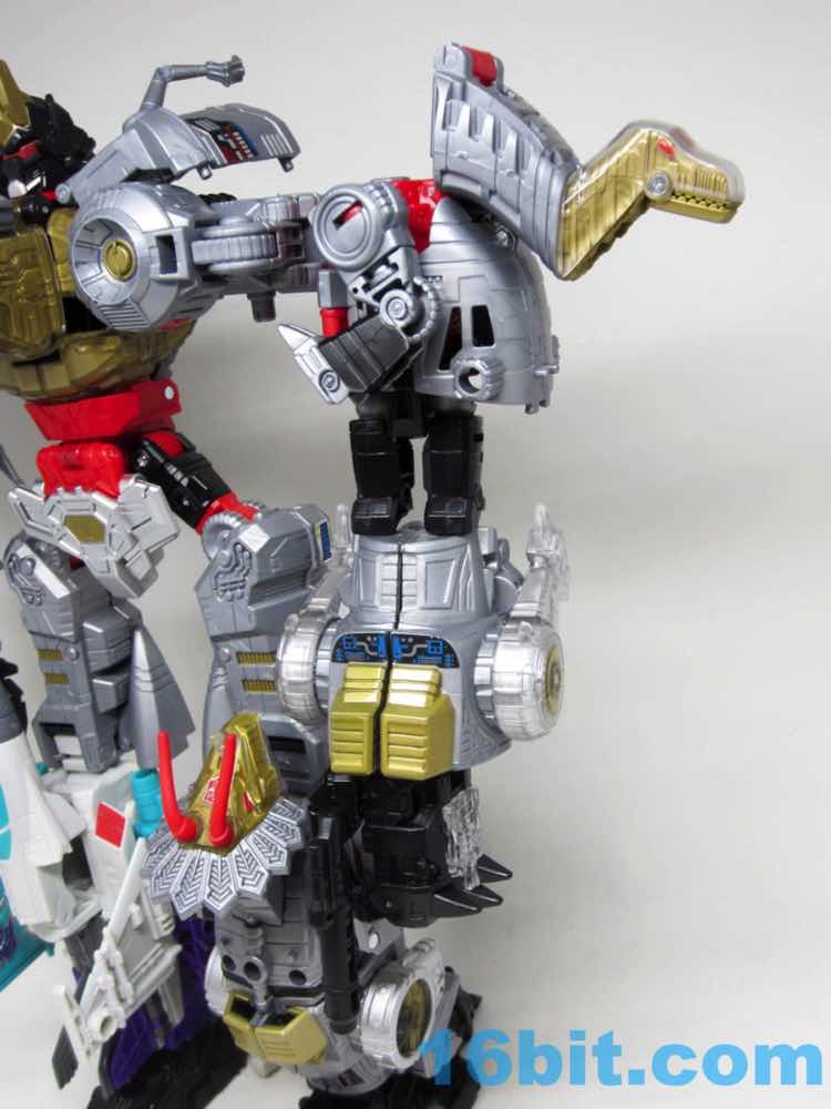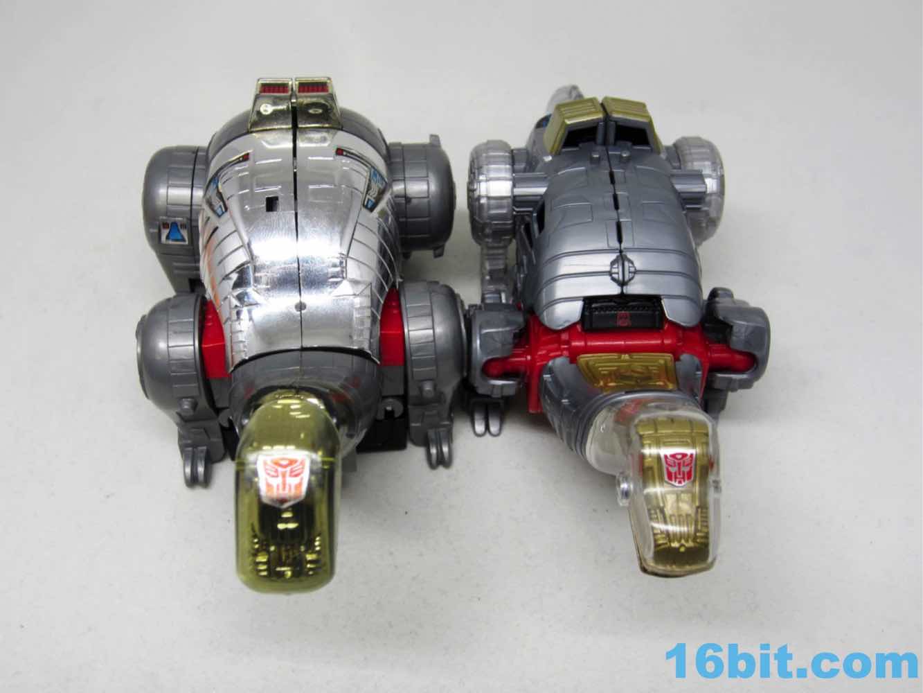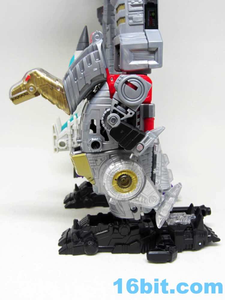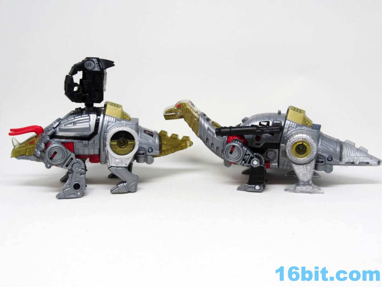 The alt mode is kind of amazing - back in the 1980s people still used the term "brontosaurus," which was deemed inaccurate and the substitute "apatosaurus" took over. Until recently - another species was discovered and now a brontosaurus is a real thing again. (It's not like the term fell out of total favor in pop culture, thank you Fred Flintstone.) What he lacks in silver he makes up for in red eyes and a decent smattering of grey. I have no idea why they insisted on giving him black legwarmers, but here you go. The arms are twisted around a bit thanks to how it recycles parts from Slug, so it's a good - but not great - dinosaur with exposed tabs and slots. He has a better range of motion than his G1 forebear, but he's still pretty stiff. I wish he had a chrome tail, but I assume the clear with silver may hold up better over time given how some recent chrome toys have gone. If gold flakes, what hope do we have?