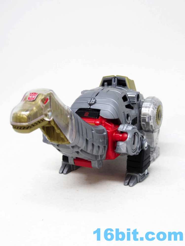 Packaged in robot mode, Sludge retains the gold (now yellow) eyes of the original and has a much thicker neck in line with his cartoon design. The toy's clear chest compartment is gone, but it's still red. His shoulders and lower legs are recycled from Slug too, but most of the rest of him is new. Articulation is par for the course in this line, with details similar to the original toy. The upper chest sticker is now a lower chest tampo, the waist stickers are gone, and many - but not all - of the leg details are kept. The arms have significantly more movement than the original toy, and certain details like the dinosaur head tuck away much more nicely.