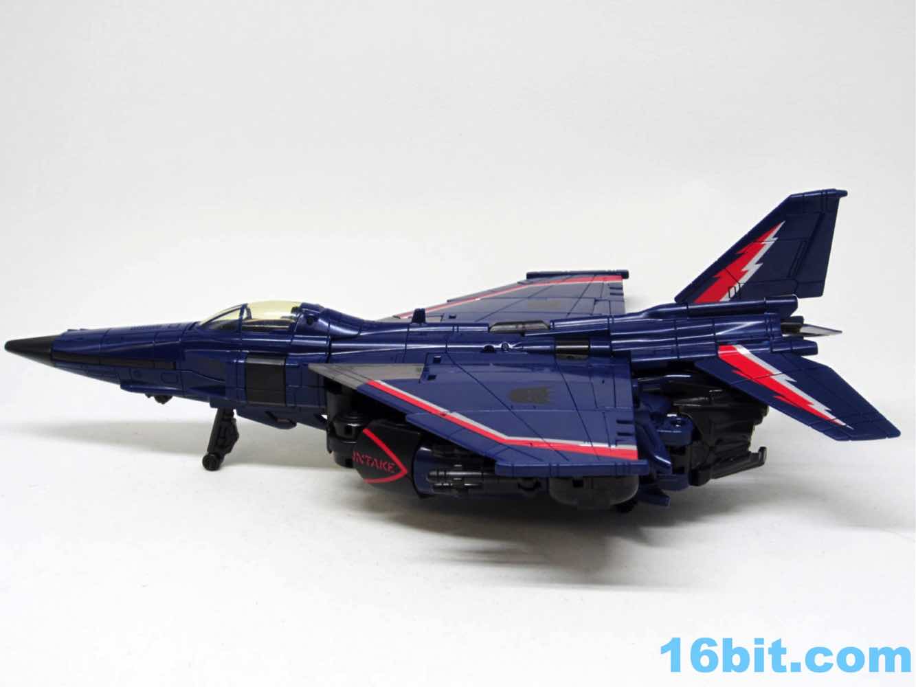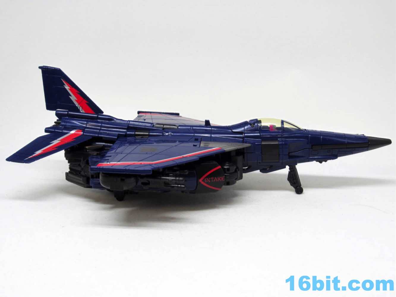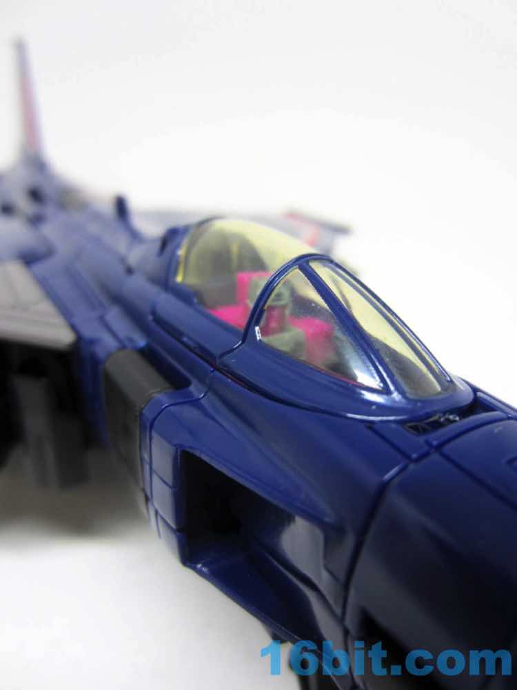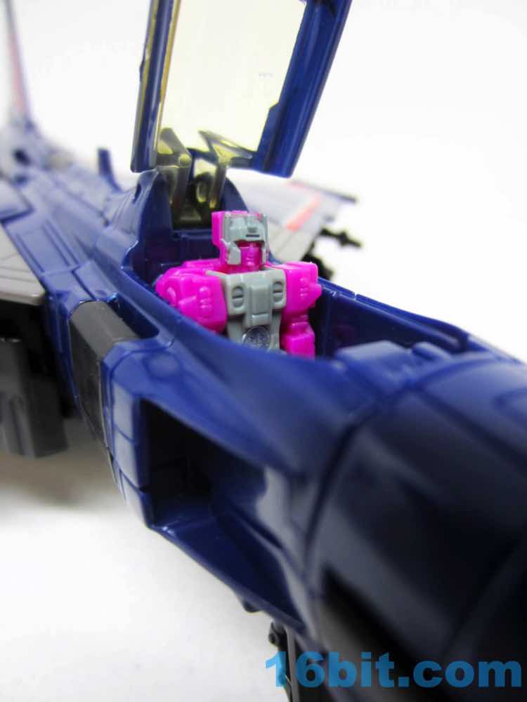 The plane is a plane. I love that you can open the cockpit and plop in a Titan Master or Prime Master robot. If Hasbro did little humans, that'd be even cooler. There's a landing skid that folds down, but that's all it really does. It looks cool, I love the dark blue, and the Decepticon faces on the wings fade in because they're so dang dark. Red and silver stripes may remind you of every Thundercracker ever (minus Machine Wars and Action Masters) with just enough color to be interesting. It may not be realistic, but it's pretty.