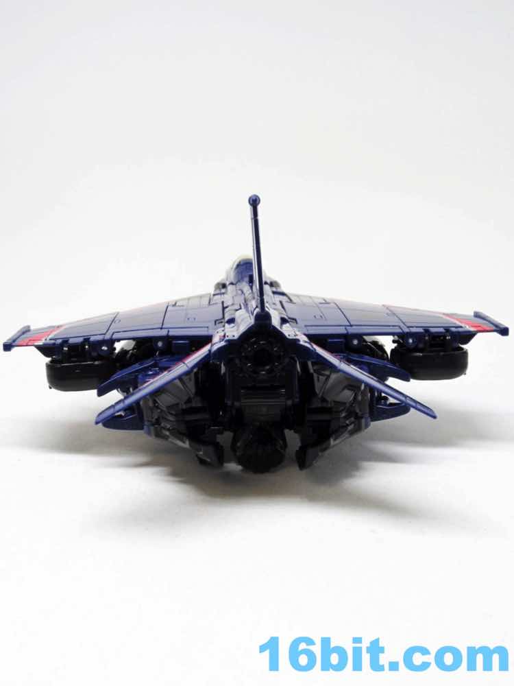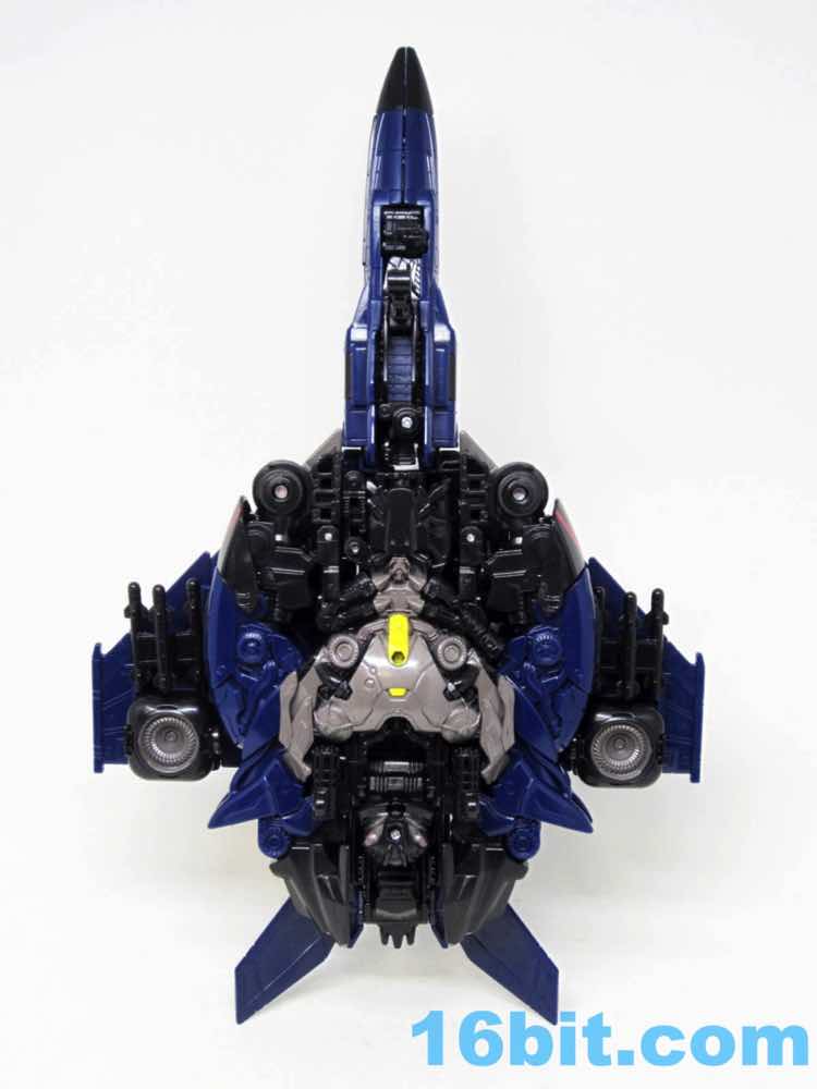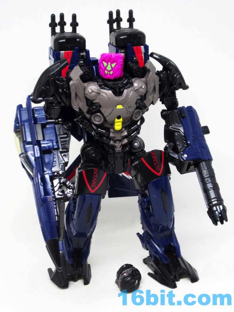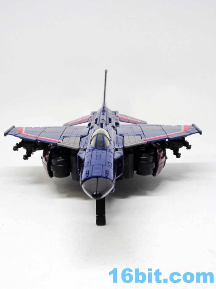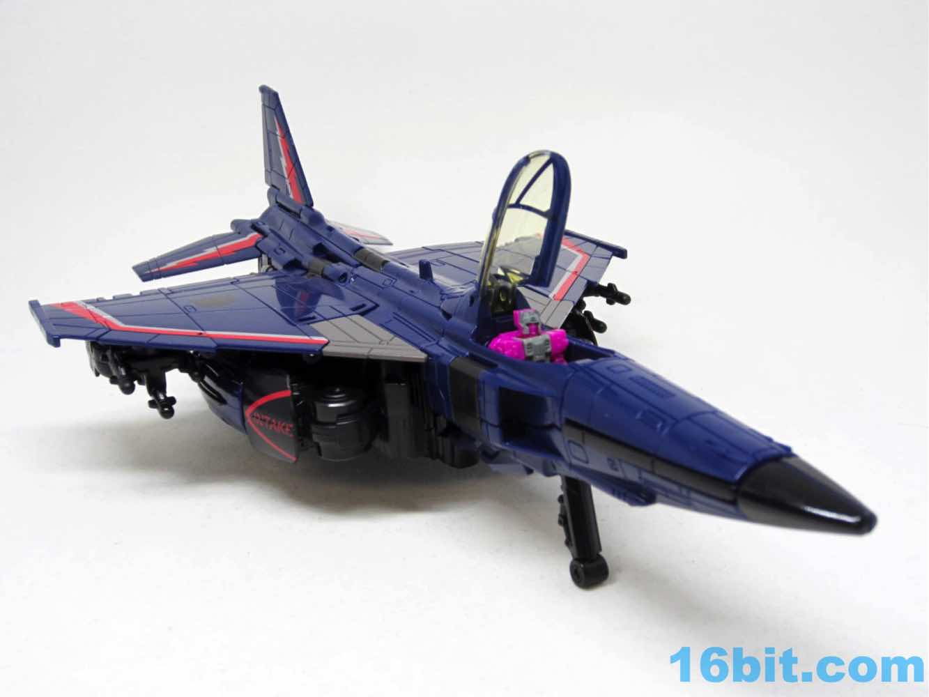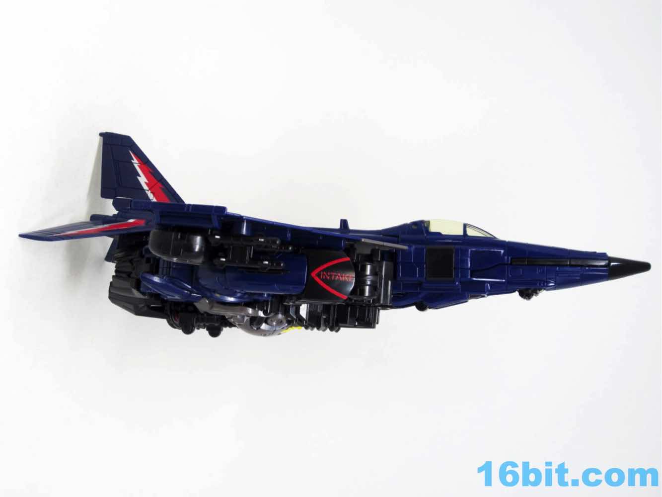 The plane is a plane. I love that you can open the cockpit and plop in a Titan Master or Prime Master robot. If Hasbro did little humans, that'd be even cooler. There's a landing skid that folds down, but that's all it really does. It looks cool, I love the dark blue, and the Decepticon faces on the wings fade in because they're so dang dark. Red and silver stripes may remind you of every Thundercracker ever (minus Machine Wars and Action Masters) with just enough color to be interesting. It may not be realistic, but it's pretty.