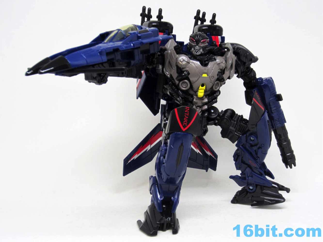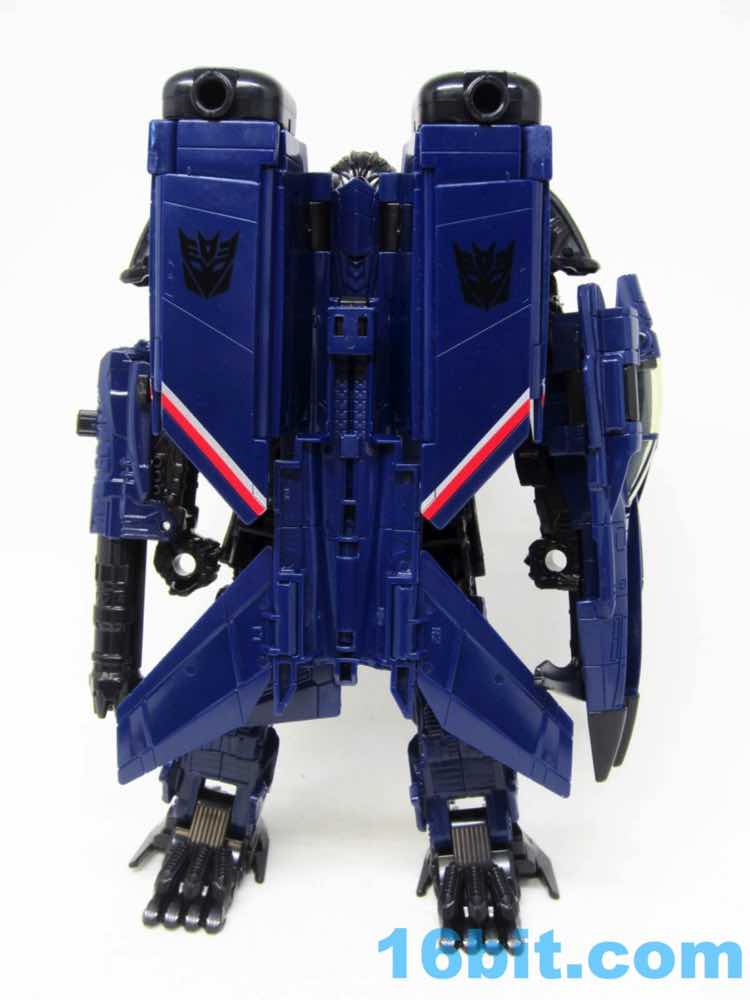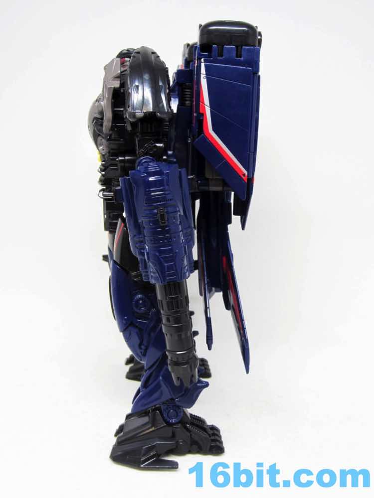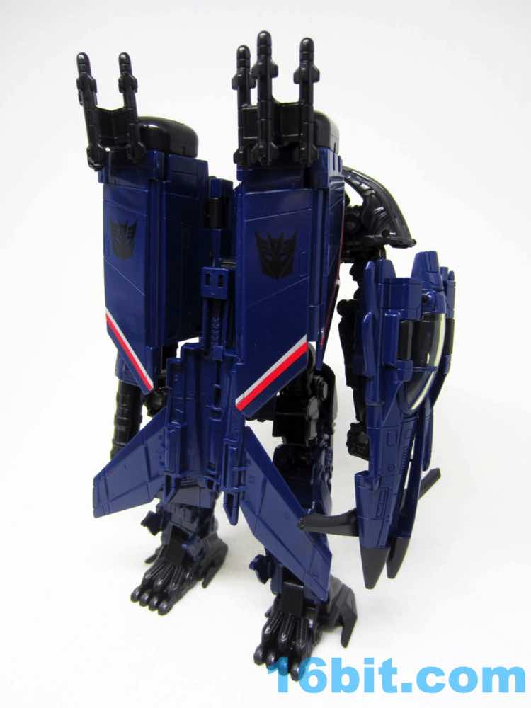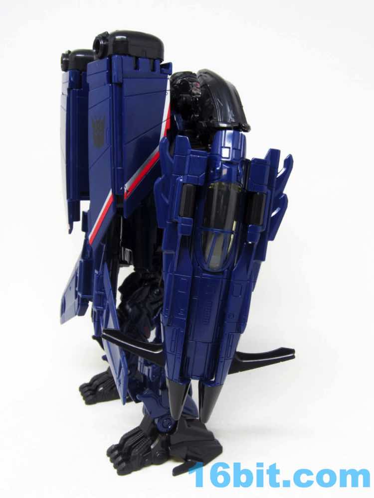 The plane is a plane. I love that you can open the cockpit and plop in a Titan Master or Prime Master robot. If Hasbro did little humans, that'd be even cooler. There's a landing skid that folds down, but that's all it really does. It looks cool, I love the dark blue, and the Decepticon faces on the wings fade in because they're so dang dark. Red and silver stripes may remind you of every Thundercracker ever (minus Machine Wars and Action Masters) with just enough color to be interesting. It may not be realistic, but it's pretty.