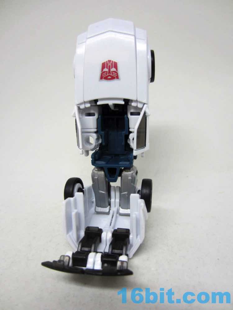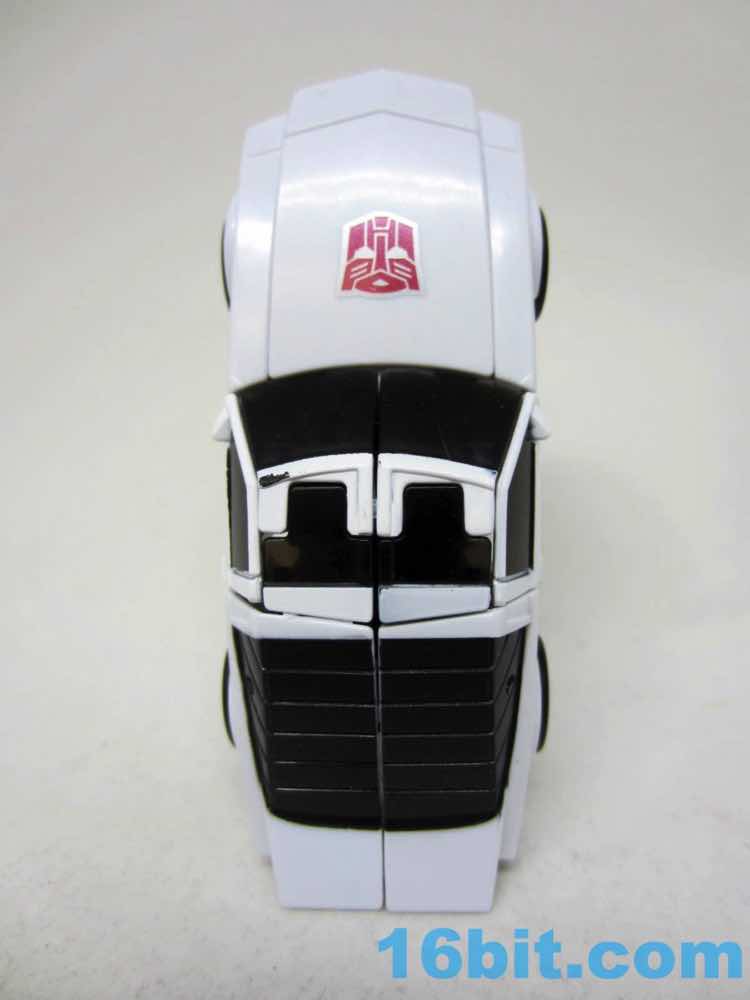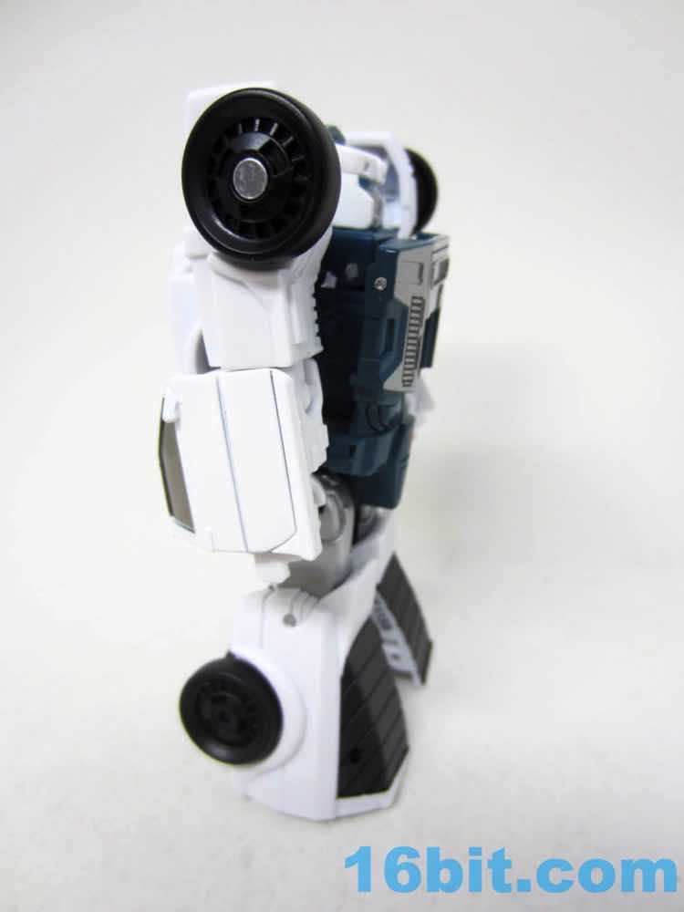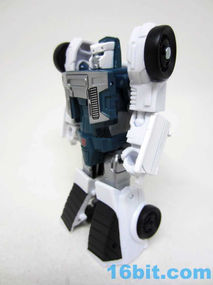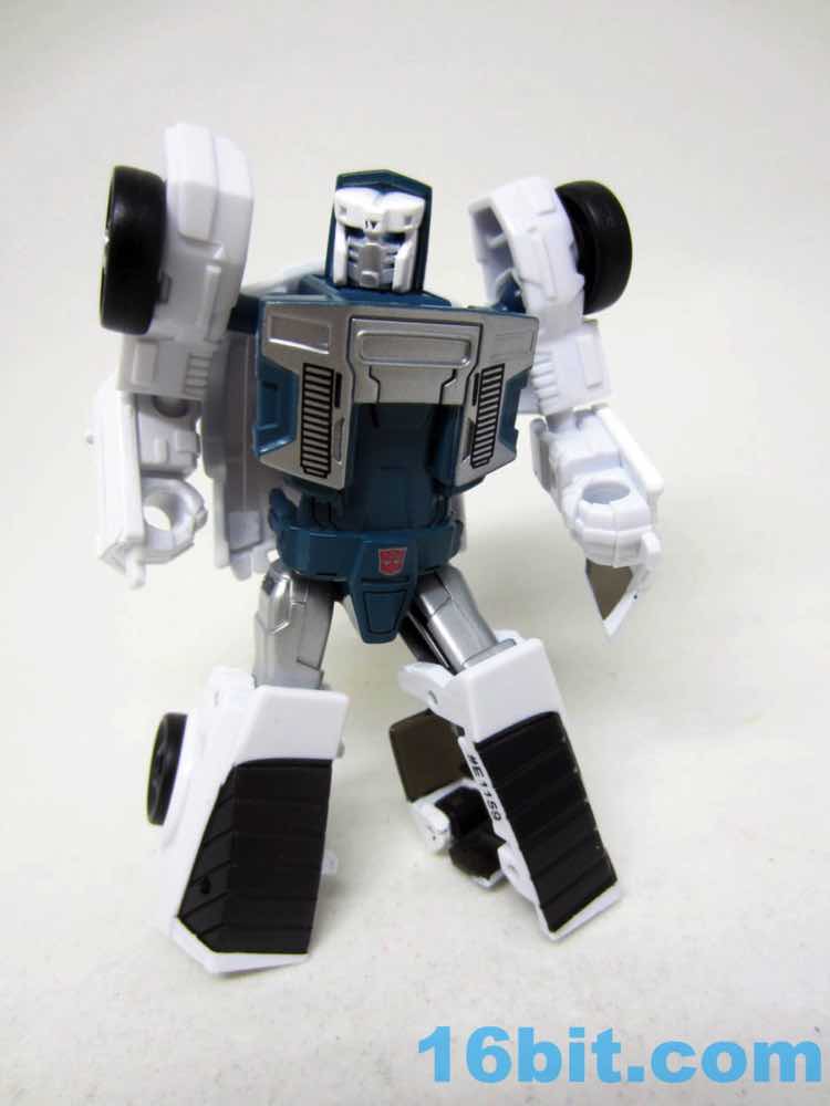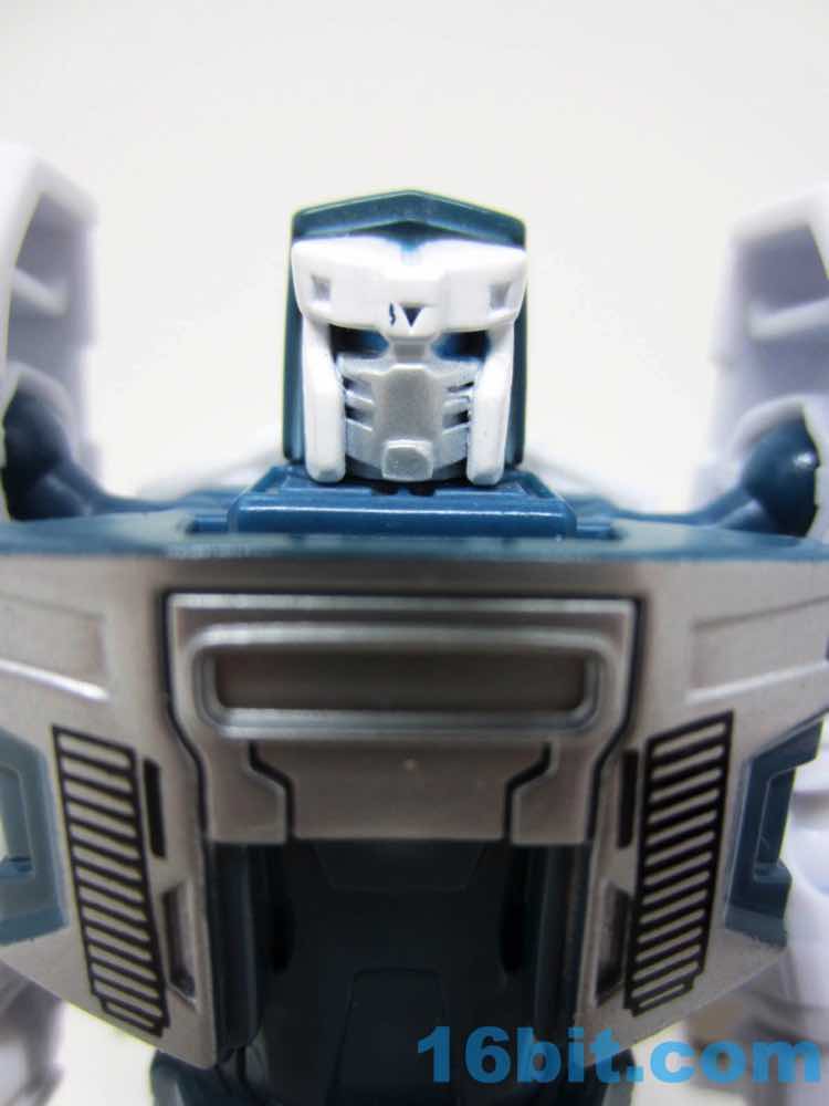The robot mode is basically Windcharger with a new head. The white toy has painted white bits and some molded blue bits to leans heavily on the original toy's design, with a few modifications. The chest sticker is missing, but the other central details are all here from the silver face to the Autobot codpiece. The blue eyes are a departure from the original G1 toy, and it's a curious choice since the character usually has a unified blue visor and not separate blue eyes. The chest could benefit from a little more color, and I assume that ToyHax will be cranking out labels in the future.