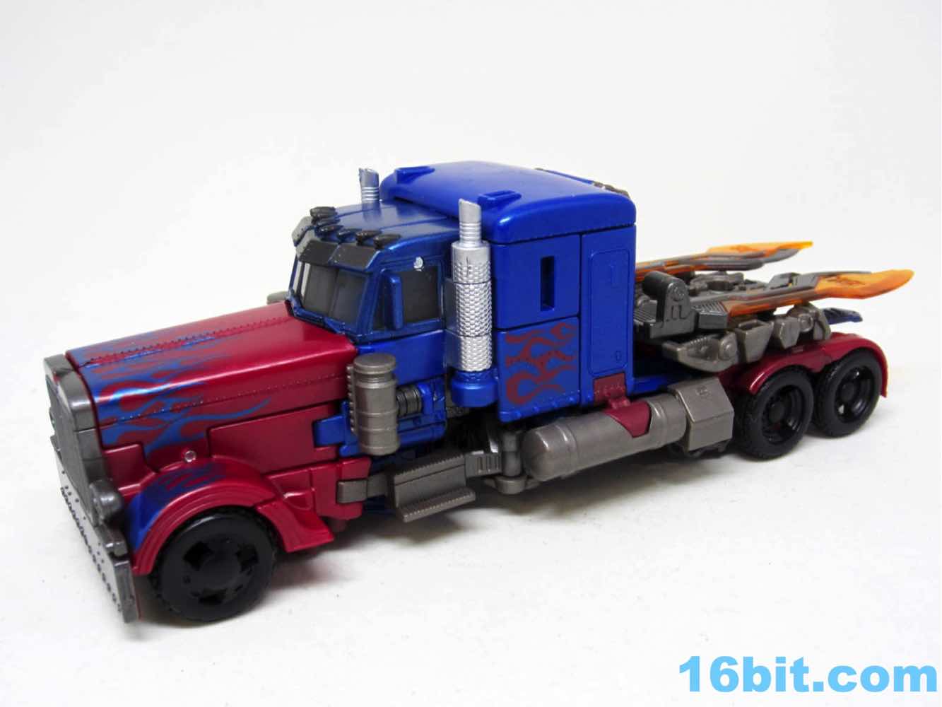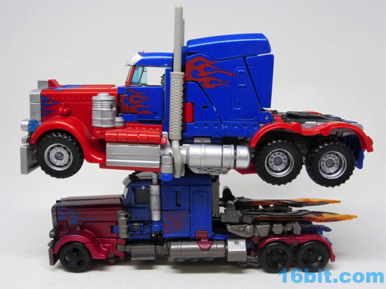 There's no getting around the fact that the truck is small. The new 35-step Voyager toy gives you a truck about the same size as the $10 Walmart exclusive Deluxe Optimus Prime [FOTD #217] from a few years ago. That toy had some more flames, great silver paint, brighter colors, and some added orange on the cab. This one is pretty spartan, and if you don't compare it to other toys it looks great. The sculpted detail is excellent, but the older toy has clear windows, silver paint, and more painted flames. Given the price increase, it would be nice of it had deco parity with the older, dirt cheap toy.