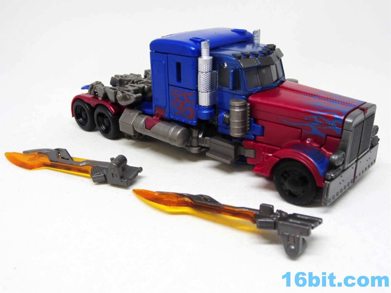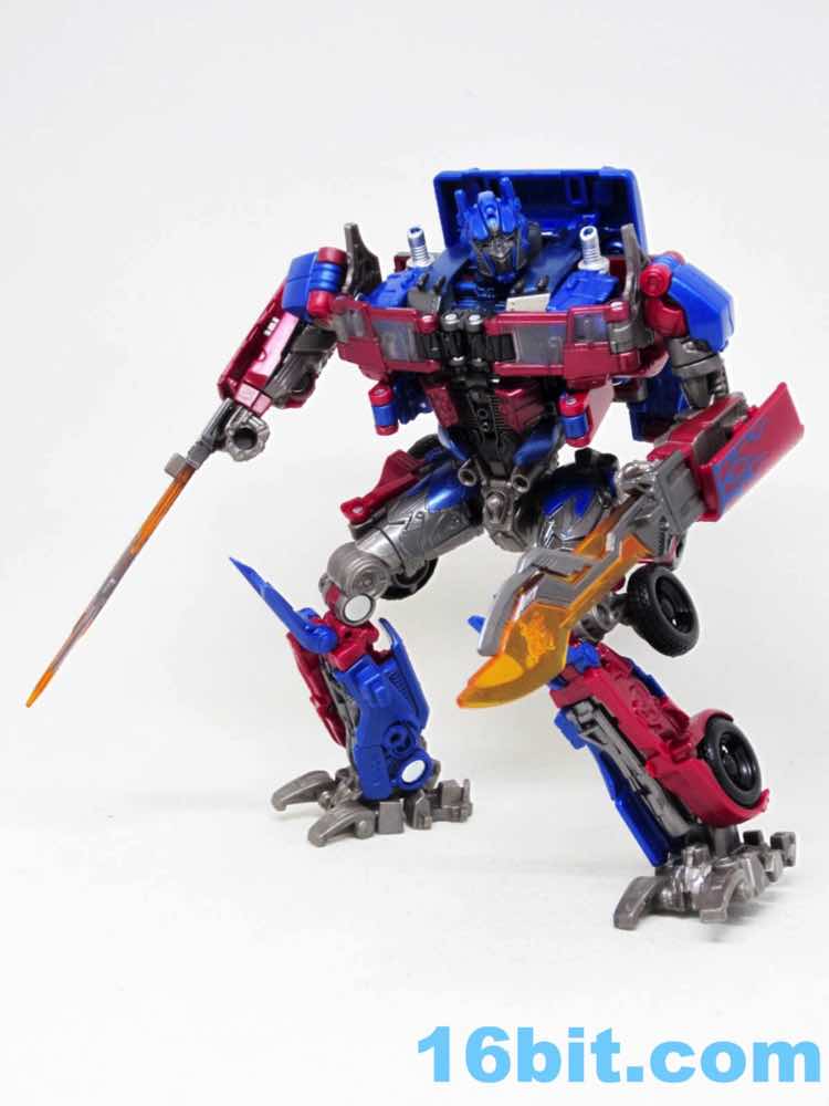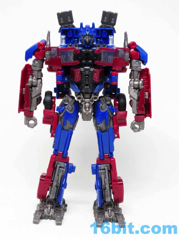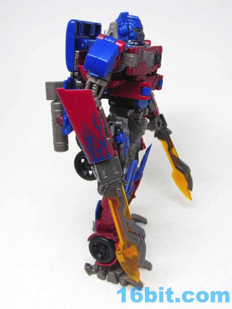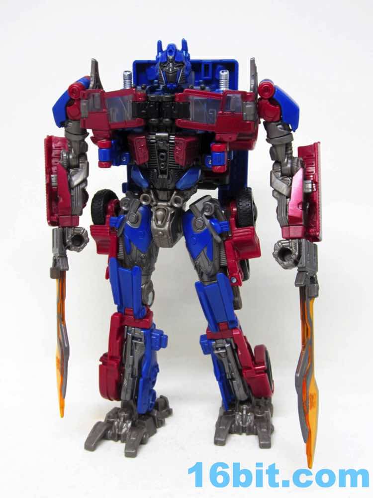 Based on Revenge of the Fallen, Optimus has two swords and no guns. He's smaller because Hasbro is trying to keep the robots in this series in scale with one another, to some degree of success. The downside is Optimus is small - this one is just over 4 ounces, while the 2007 Voyager class toys were about 8.6 ounces. The Dark of the Moon Deluxe was over 3 ounces. The Studio Series toy has short smoke stacks, there are no spring-loaded automorph or driver gimmicks, and the paint quality is a lot less interesting than subsequent toys. The robot also doesn't look quite as true to the movie as other toys, especially the recent Movie Masterpiece.