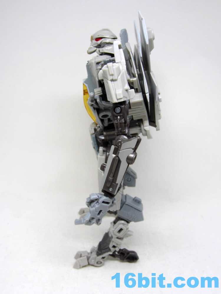 The tall robot has about 23 meaningful points of articulation, and stands taller than the other Voyagers within my reach. A lot of the mobility is in the arms and legs, with no torso joint. You can get him to gesture in interesting ways and hunch over a bit, but the neck doesn't move much. There's not a lot of color here, so it matches the movie pretty well with greys and browns and some orange. The hands can fold back so you can plug the weapon into it, or you can plug it via 5mm peg to the numerous holes all over the figure. This is a toy with options.