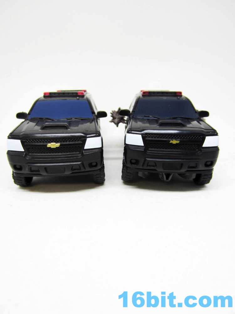 The car is good! The vehicle is compellingly authentic with a Chevrolet symbol on the front and back - painted, to boot. There's a spot for a license plate sticker should you want to add an aftermarket label, and the wheels are unpainted - it matches the Berserker toy nicely as you can see. The red lights on top are a little darker, and the Decepticon symbols are G1 now for some reason. Not just on the toy - but on Stinger, and the packaging too. Starscream is correct for some reason. There's no in-the-car weapon storage as far as I can tell, so they have to hang out on the doors. It works, but it's ugly - and that's how weapon storage is on all of Studio Series so far.