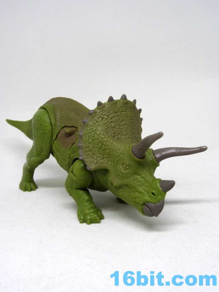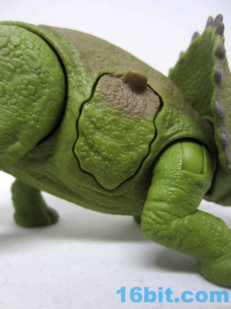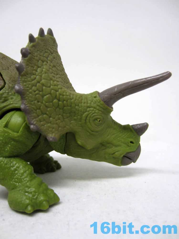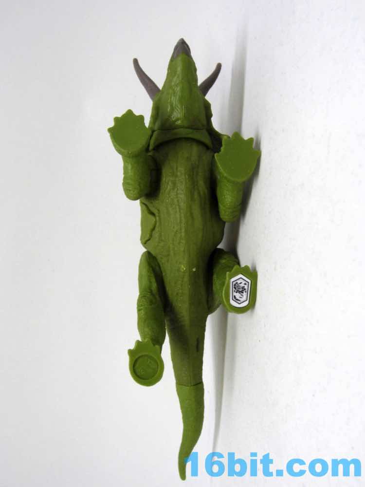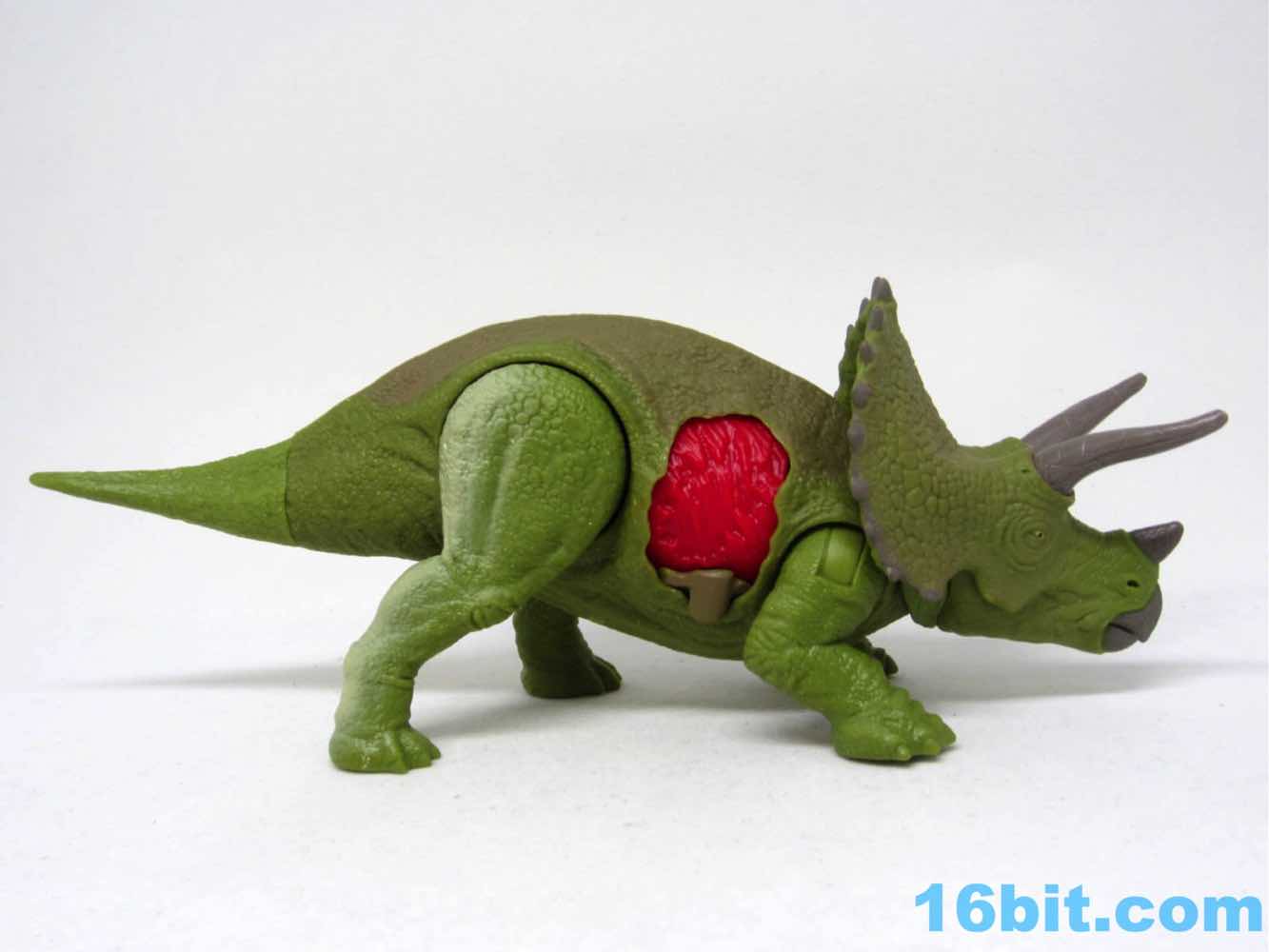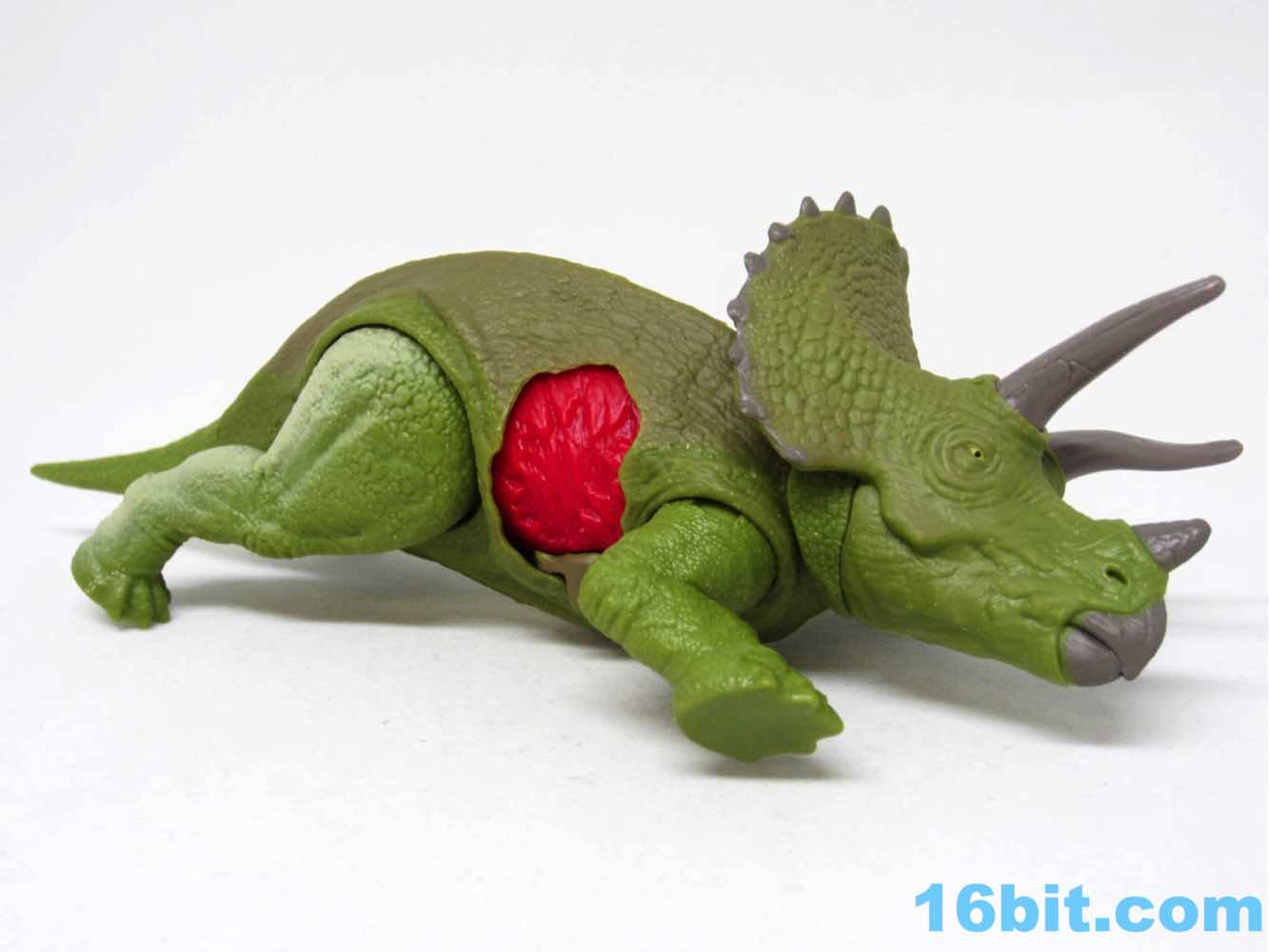 I love the sculpting - the scales, wrinkles, and damage marks are all pretty great. Its horns are molded in a different color and rubbery plastic, which is a nice way to save on paint and to prevent blindness. Deco is very simple compared to other dinos in the assortment. The triceratops' eye is yellow with a tiny black dot, with a painted beak and frill horns. A dusting of brown on its back keeps her from being a mono-color dinosaur like our fathers had, as does some odd cream color on the back of her legs. The red wound under the trap door is molded in red, which is simple and reasonable to expect for a toy like this. I appreciate it's unpainted, because over time it might look ugly with wear and tear. I would have loved painted toes or a wash, but for ten bucks it's pretty good.