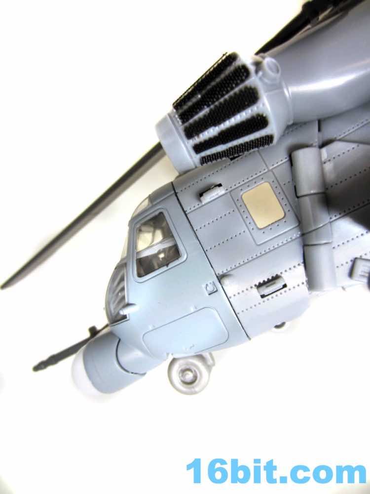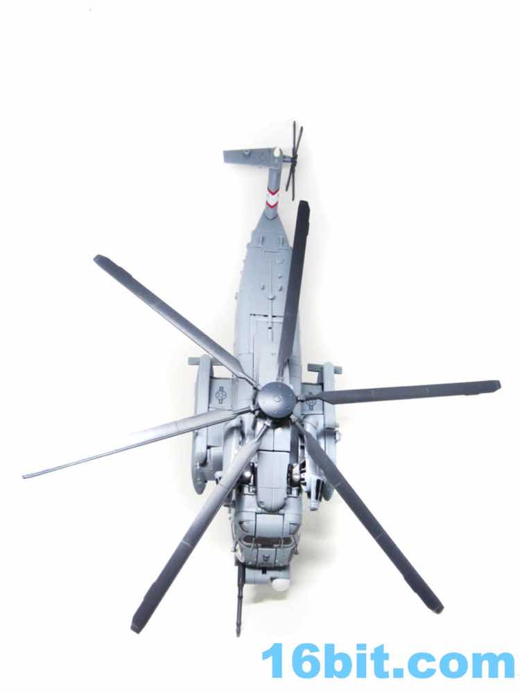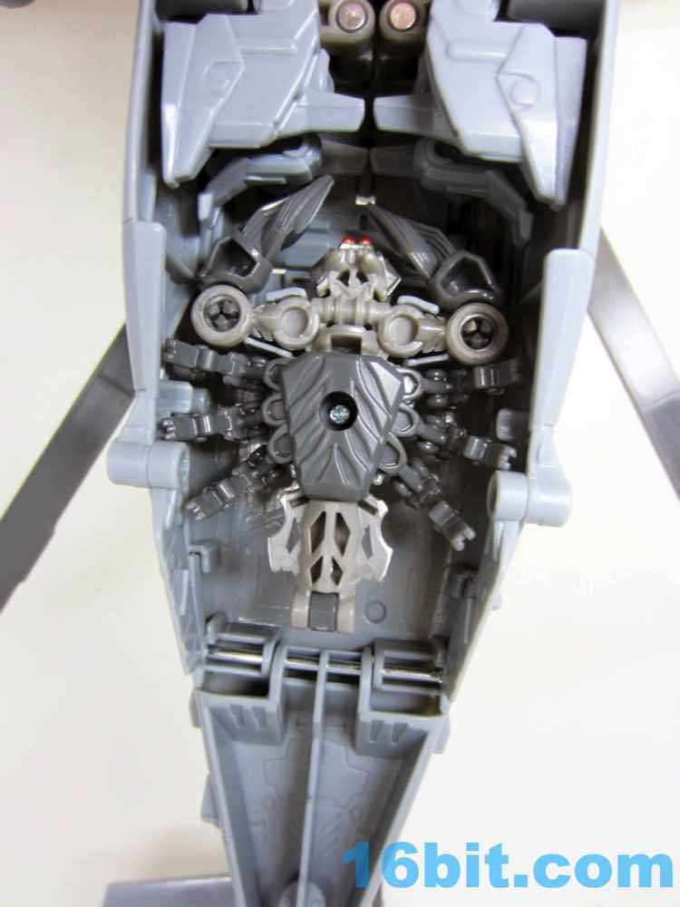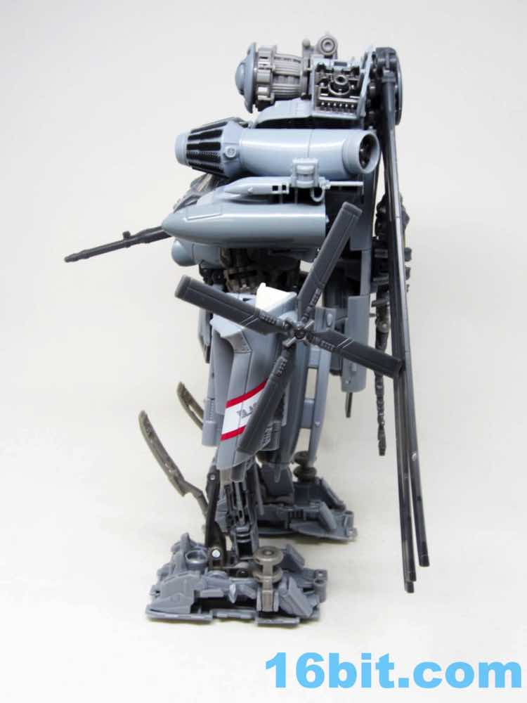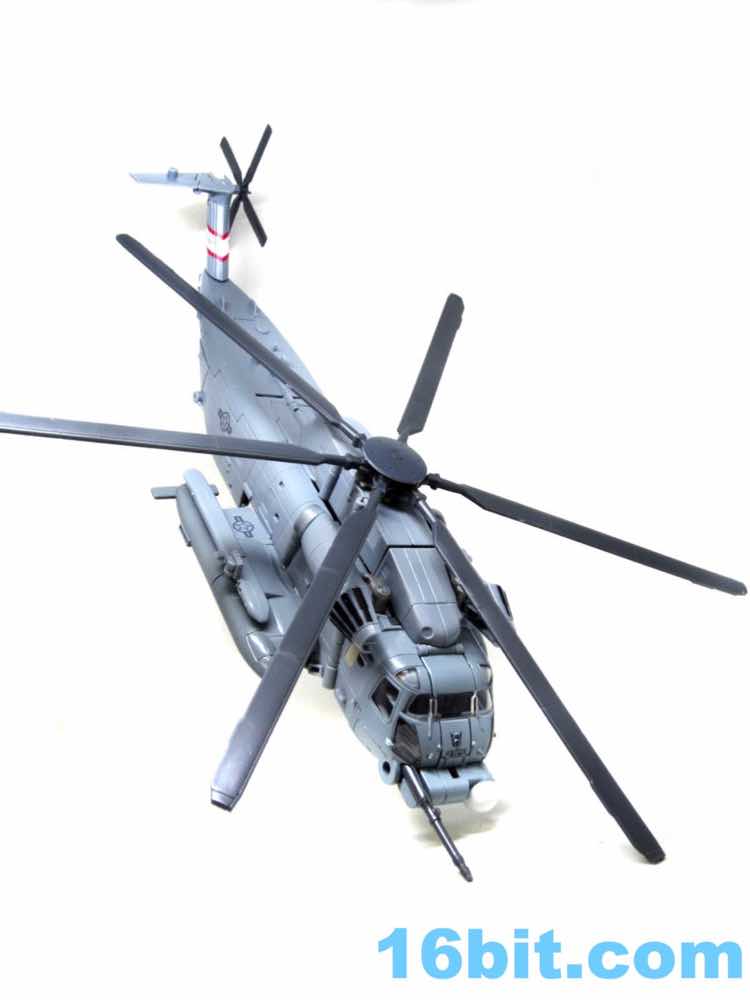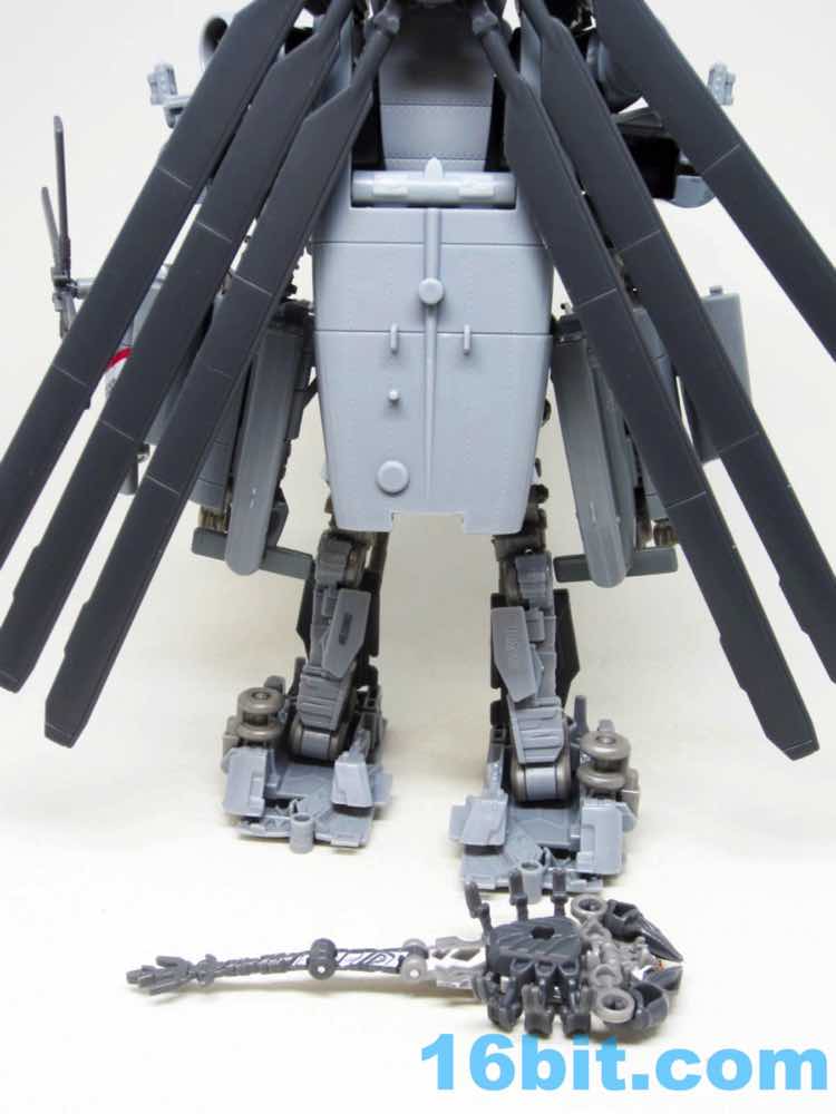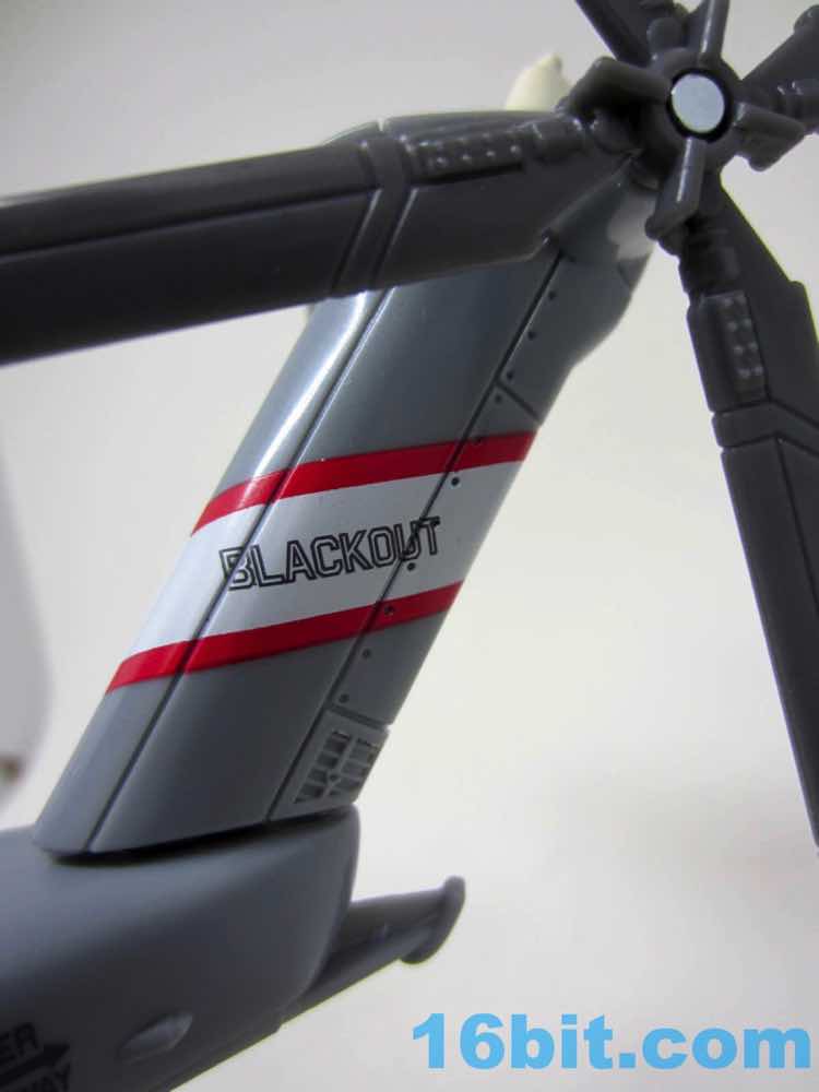 The helicopter is big and impressive. From the tip of the cannon to the back of the tail, he's a hair over 16-inches long - one of the bigger alt modes that aren't a Titan-class toy. Deco is good, but simple. You'll see it's mostly grey, with a few markings like "BLACKOUT" on the tail, a Decepticon symbol on the front, and a clear window. There's on-board storage for Scorponok in the tail with some decent sculpted detail on the exterior, but it's not much of anything that's going to really "wow" you. It's good, it's accurate, but it's not next-level weirdness like the paint job on Grimlock. It's good, but the rotor doesn't spin freely. It just looks really nice.