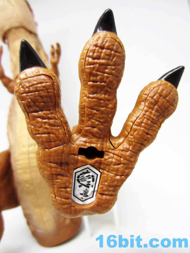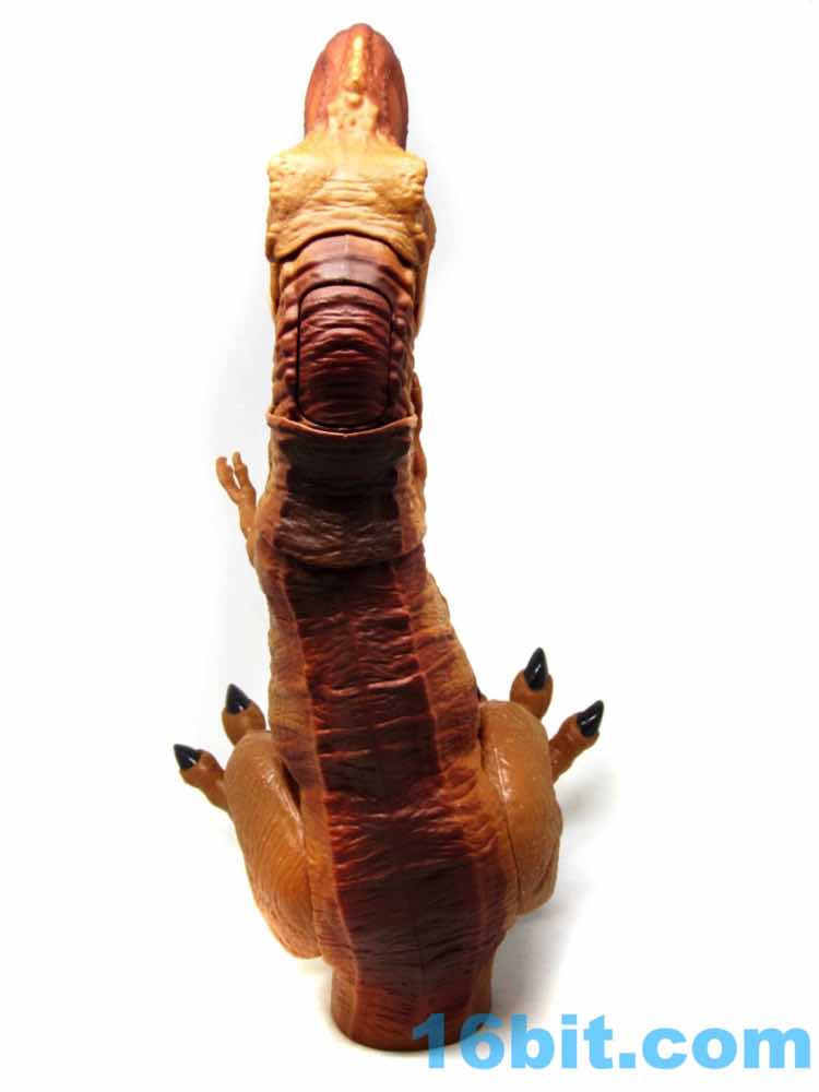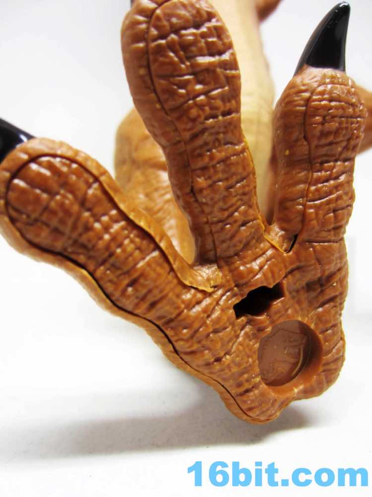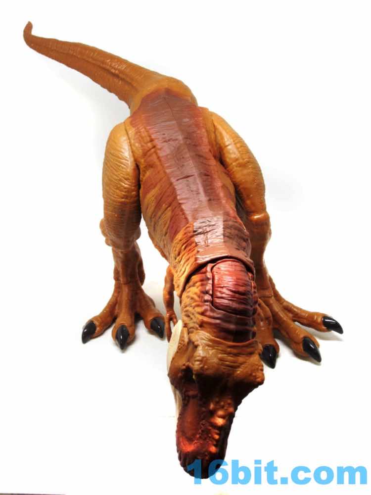 I love the teeth, the tones of brown, the eyes, the sculpting, just about everything. The neck is a little weird - there's a sleeve/collar that joins the skull to the body, and it looks sort of like one of those whiplash collars you see on TV court case sitcoms. Paint it white, and it would probably be a lawsuit dinosaur waiting to happen. This gives her a good range of movement, so she can look up or down - an uncommon thing on these bigger dinosaurs. Just a couple of joints really add to her range of movement, letting her bend down to chase little dinosaurs or menace human heroes. Those extra leg joints do a load of good in making this a more lively toy, and it's better than anything Kenner or Hasbro ever did. (Sorry Kenner or Hasbro.) I got the ReSaurus T-Rex in college, and while it has more articulation it can't stand as well without assistance from the display stand.