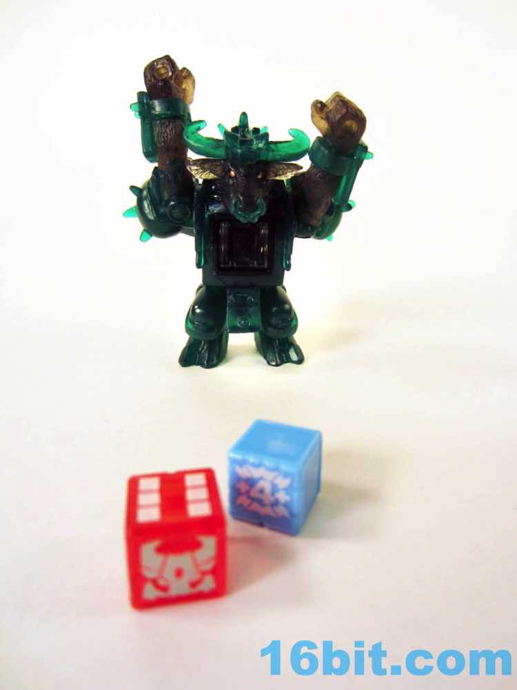 The toy's gimmick is a dice launcher in the chest - it's removable so all the figures share tooling. There's a prism so light reflects into the clear chance cubes, giving the figure a little more life. It shoots a decent It lights up the clear dice due to a prism in the plunger, which has a sticker on the back that matches the character side on the die.