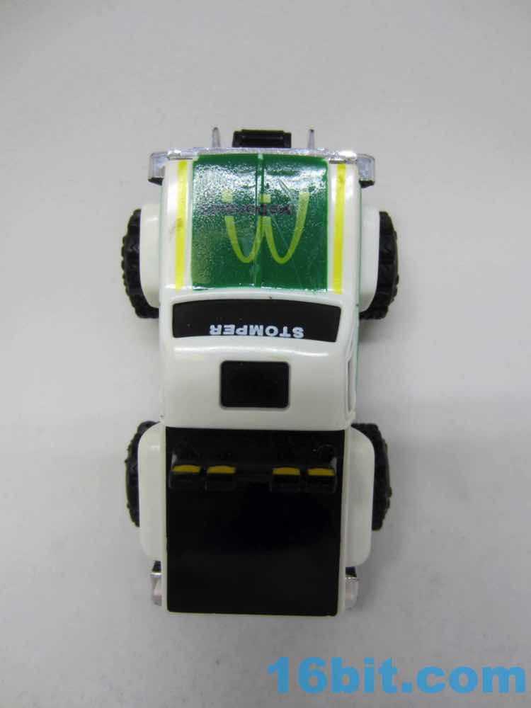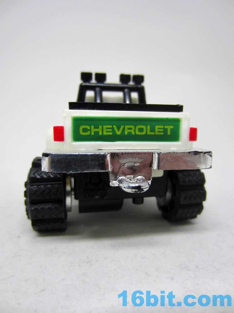 A snap-on chassis gives the toy its detail. A motor inside held the engine and lights, with clear lights on the front and back of the chassis. The Chevrolet has a chrome grille and matching bumper, plus painted yellow lights. A green hood has a McDonald's logo on it, which looks pretty nice. I'm surprised how it held up to 30 years of neglect, and that the tires are intact. I've had rubber-wheel Transformers crack in under a decade.