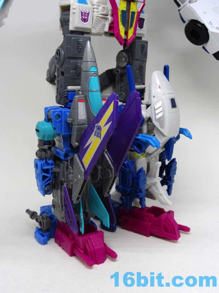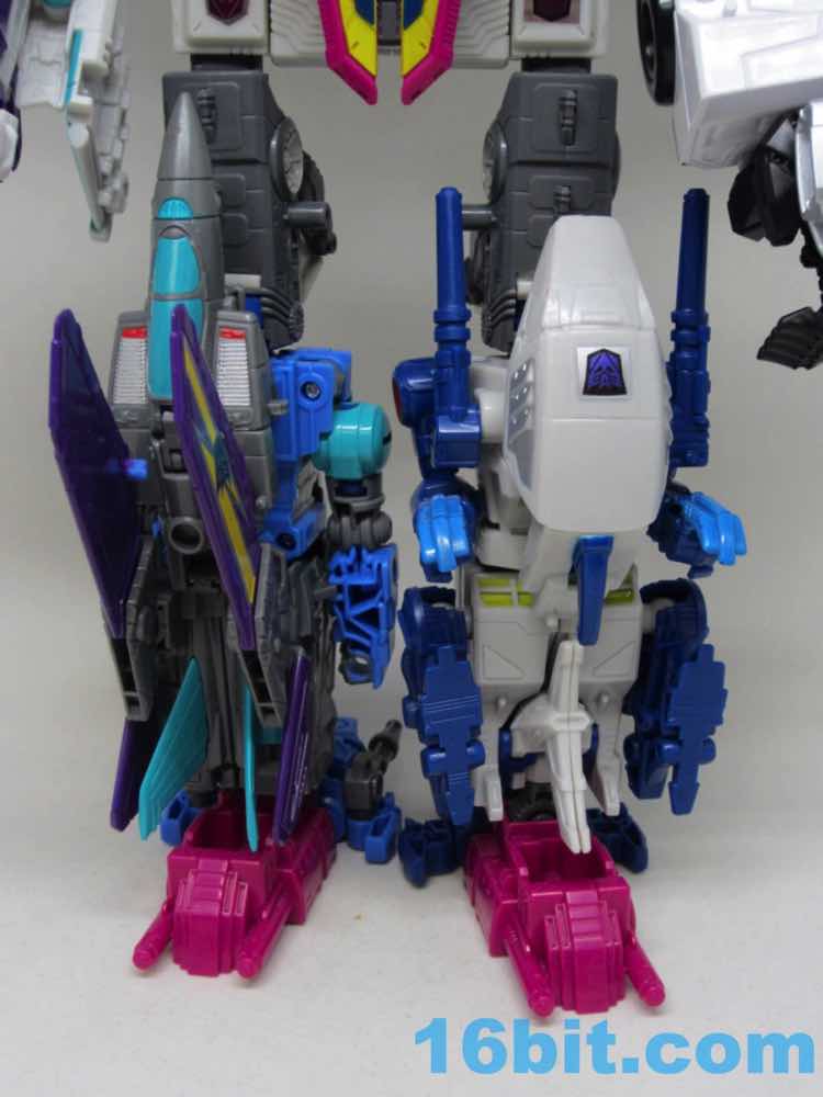 Due to changes in the toy's arms, neck, and nosecone the limbs look a little bit different. It's still fundamentally the same as the other jet limbs, with bicep swivel and bending elbow - plus the fist plugs in to the end. It's consistent and colorful, making a great limb for Starscream or a fill-in on Abominus while we wait for the rest of the team to hit stores. The arm moves nicely. The leg is a stump as usual. Ta-daaaa.