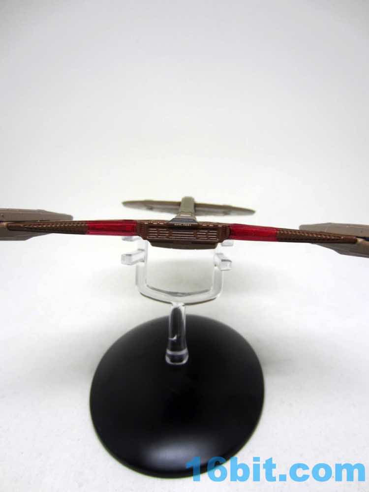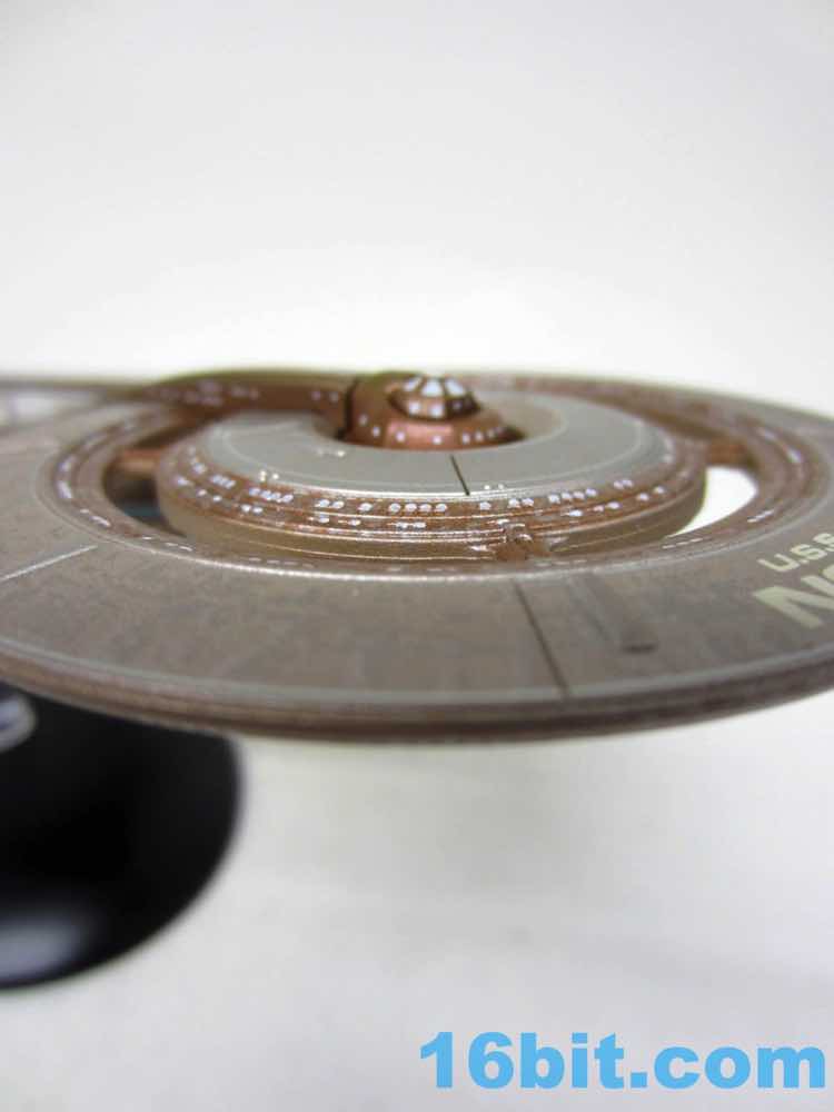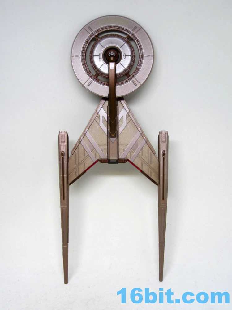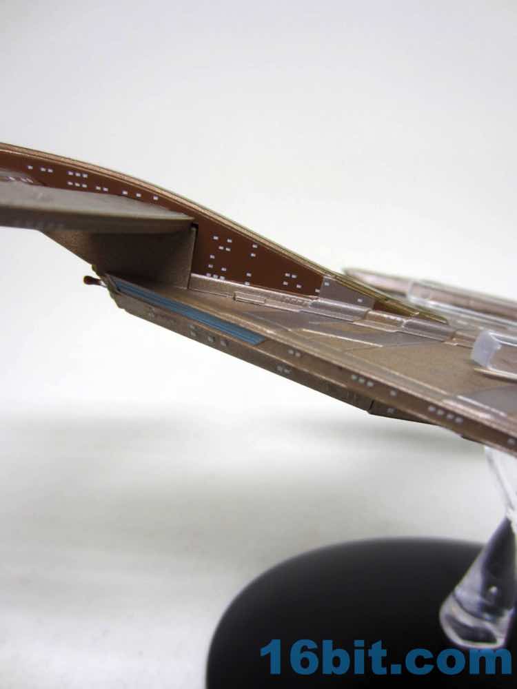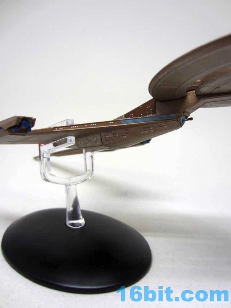 As with the others, the display stand clamps on to the back giving it the ability to look like it's hovering in space without any unsightly holes in the actual ship. I had to check the directions to make sure I put it in the right place, gripping the vehicle's backside. Most Enterprises I have are one-color with unsightly battery compartments or weird buttons, so it's strange to get a debut toy of a ship that looks reasonably close to the CG model from the show.
