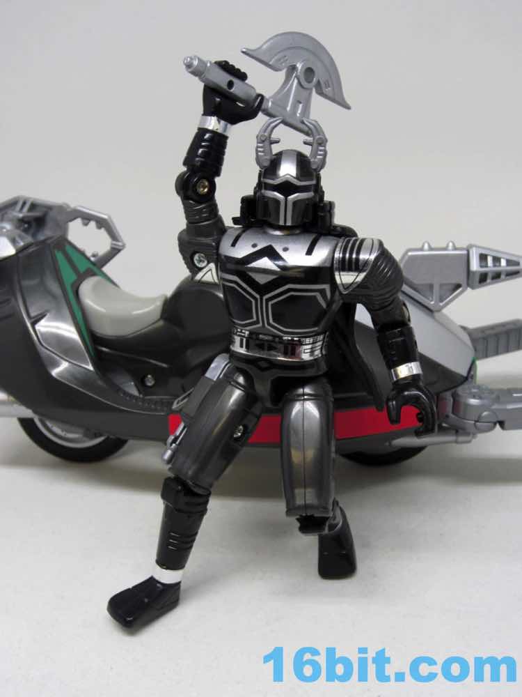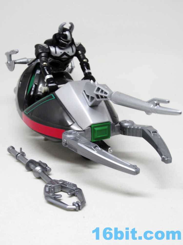 As accessories go, you're spoiled for choice. A horn lance and articulated mandibles are on the front of the bike, and a mount with beetle claws and an axe sits on the back. There's a big handlebar staff and a blaster accessory, plus the removable cape. Much like Xevoz, Stikfas, and a lot of Playmates 1990s figures you've got more than you might know what to do with - thankfully most of it mounts to the bike. It's a treasure trove of a toy with so many easy-to-lose pieces, all of which fit firmly in the figure's hands thanks to the aforementioned peg/fist/weapon system.