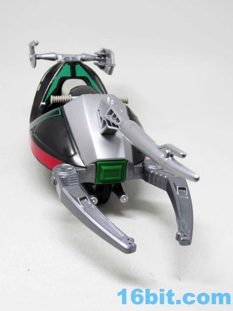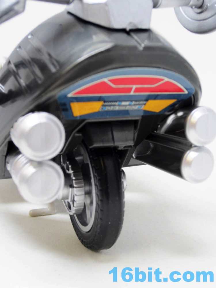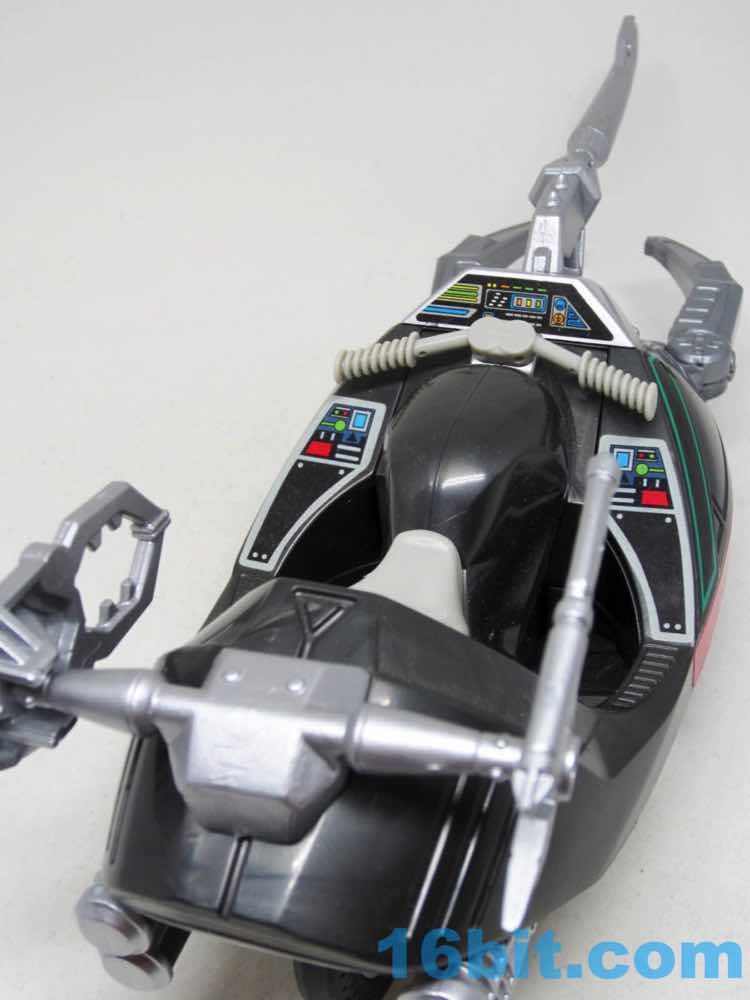The Titanium Silver Beetleborg bike is pretty amazing - it too is hollow, but bulky. A retractable kickstand keeps it upright, but you can put that up and zoom it around on the big wheels. The figure fits inside easily, but I'd like you to note the bright, colorful stickers making up the control panels and rear lights. They did a bang-up job making something to pretty it up here, and the result is a fairly impressive slab of plastic. It has a few moving and removable parts - those mandibles are probably the most interesting bit - but it's fun to zoom around. I generally dislike "bike" toys because they're usually small and simple, but this one adds a lot of meat to the offering to give you something that feels like a big fun toy.