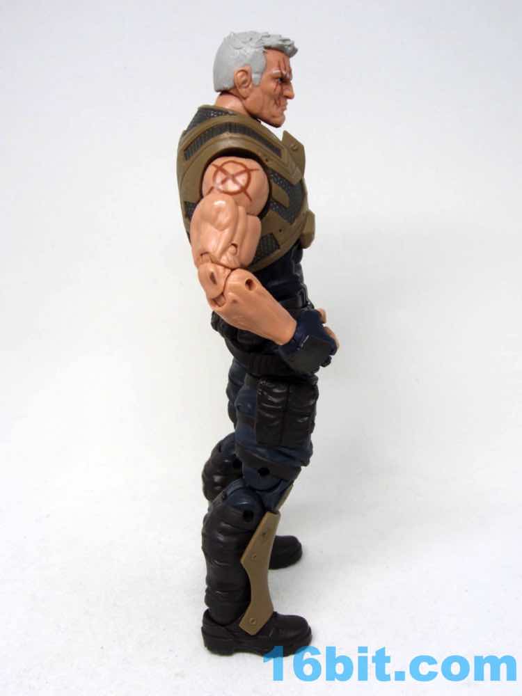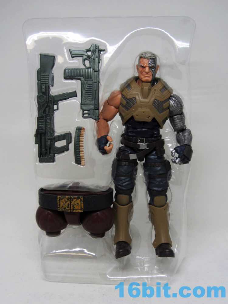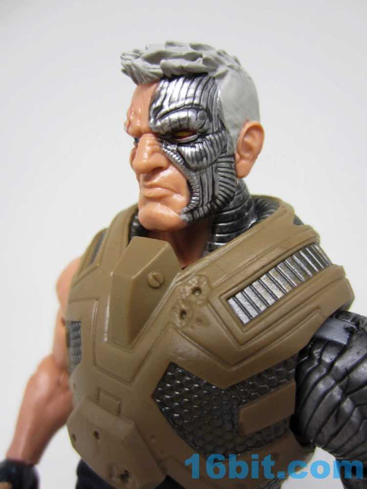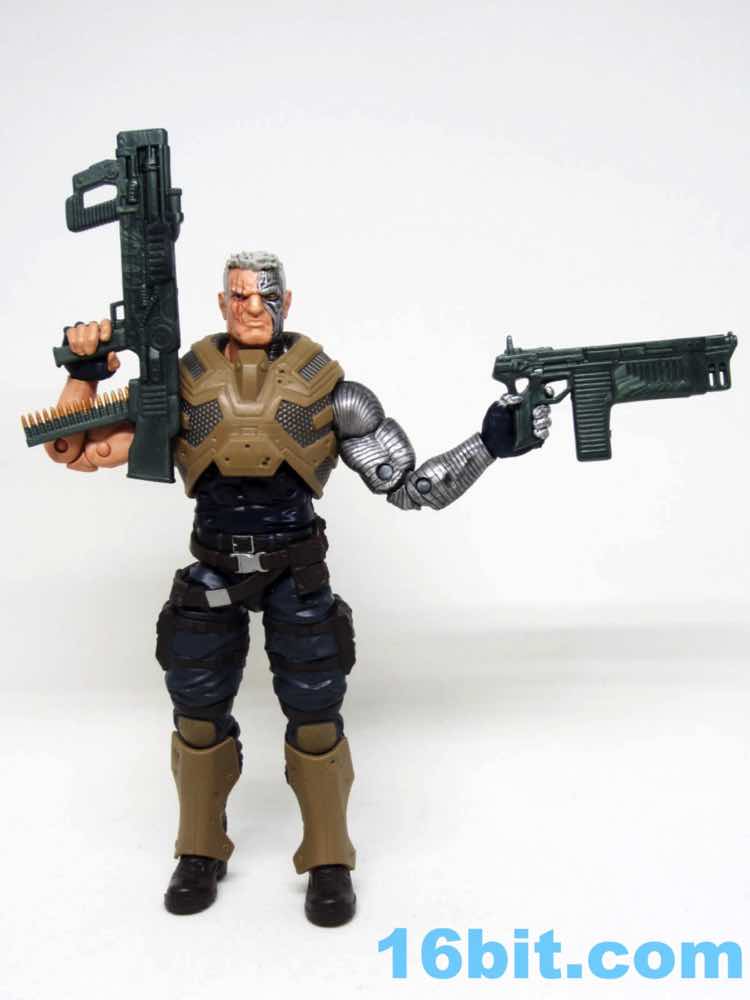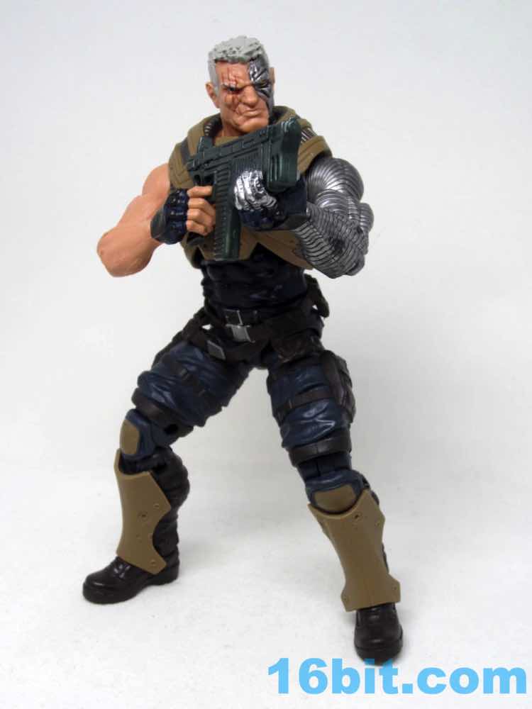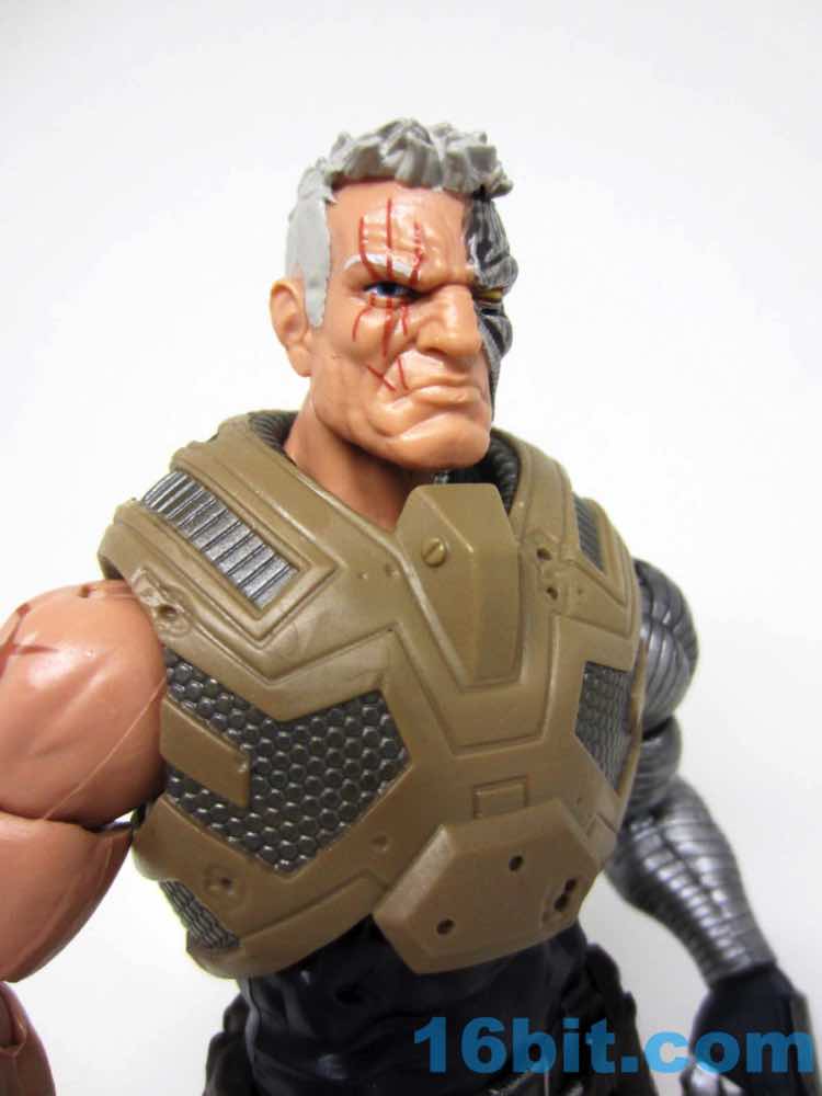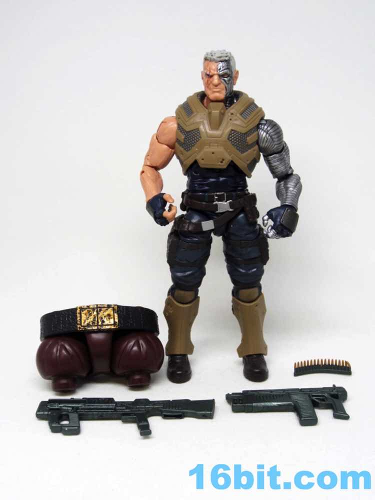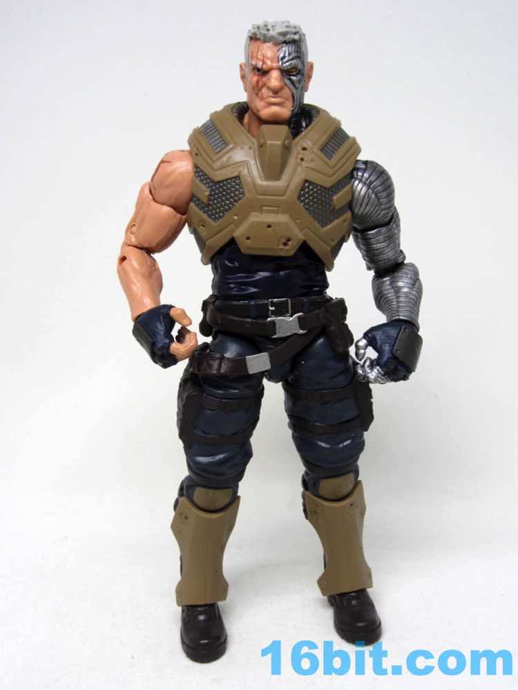The 6-inch scale action figure is chunky and well-constructed. The upper torso is on a ball joint so there's no unsightly ab crunch, it's not a vest piece but is the actual body. Very nice. The figure is loaded with pouches and belts, boots and a robot arm. But sleeves? No. Cable cares not for sleeves. Half of his face is a robot and he's got a scarred eye and a big "X" on his arm, so he's too good to wear a shirt with your trappings of things like warmth.