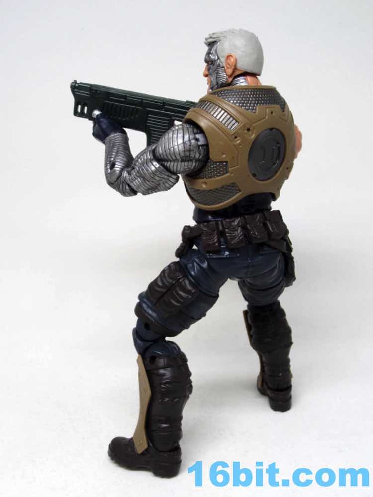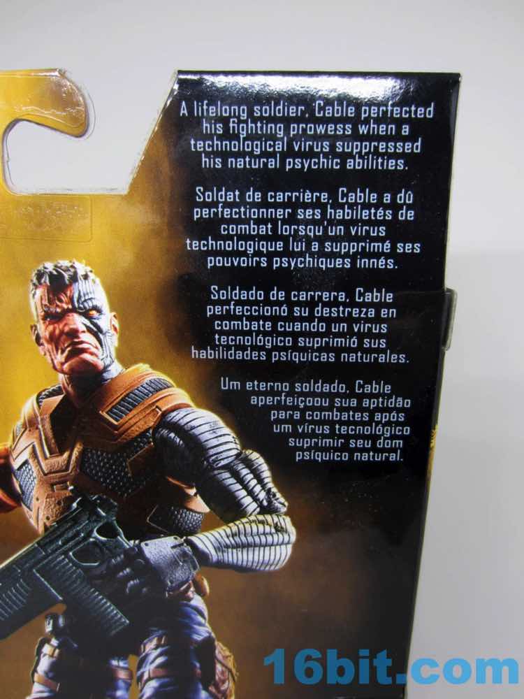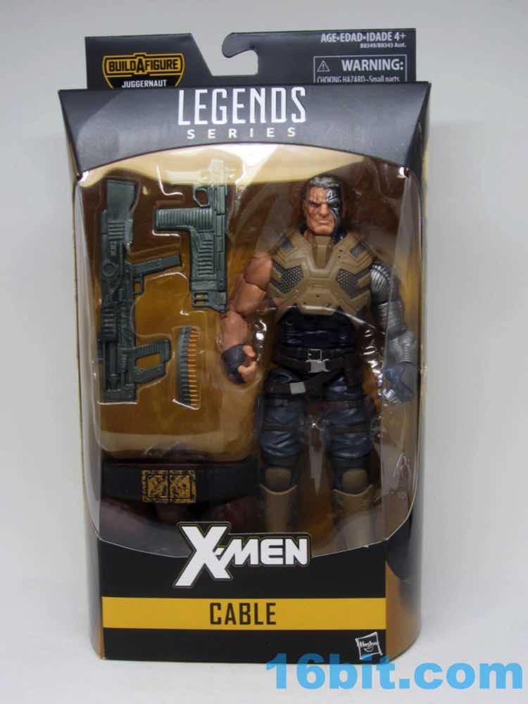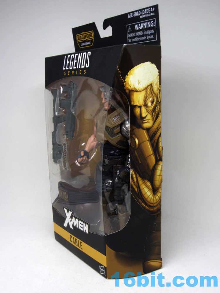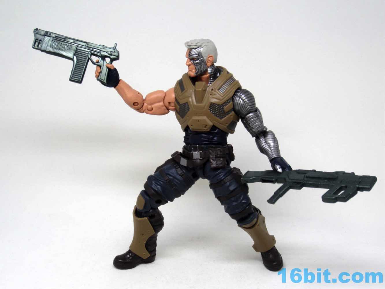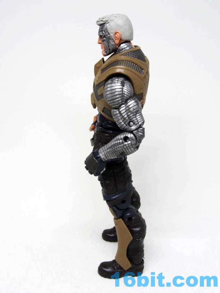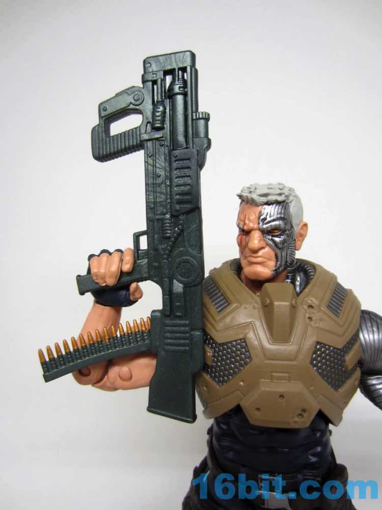 The 6-inch scale action figure is chunky and well-constructed. The upper torso is on a ball joint so there's no unsightly ab crunch, it's not a vest piece but is the actual body. Very nice. The figure is loaded with pouches and belts, boots and a robot arm. But sleeves? No. Cable cares not for sleeves. Half of his face is a robot and he's got a scarred eye and a big "X" on his arm, so he's too good to wear a shirt with your trappings of things like warmth.