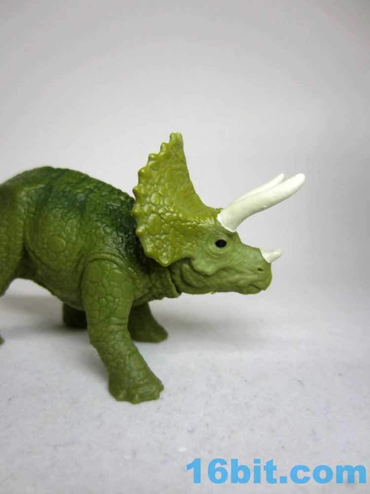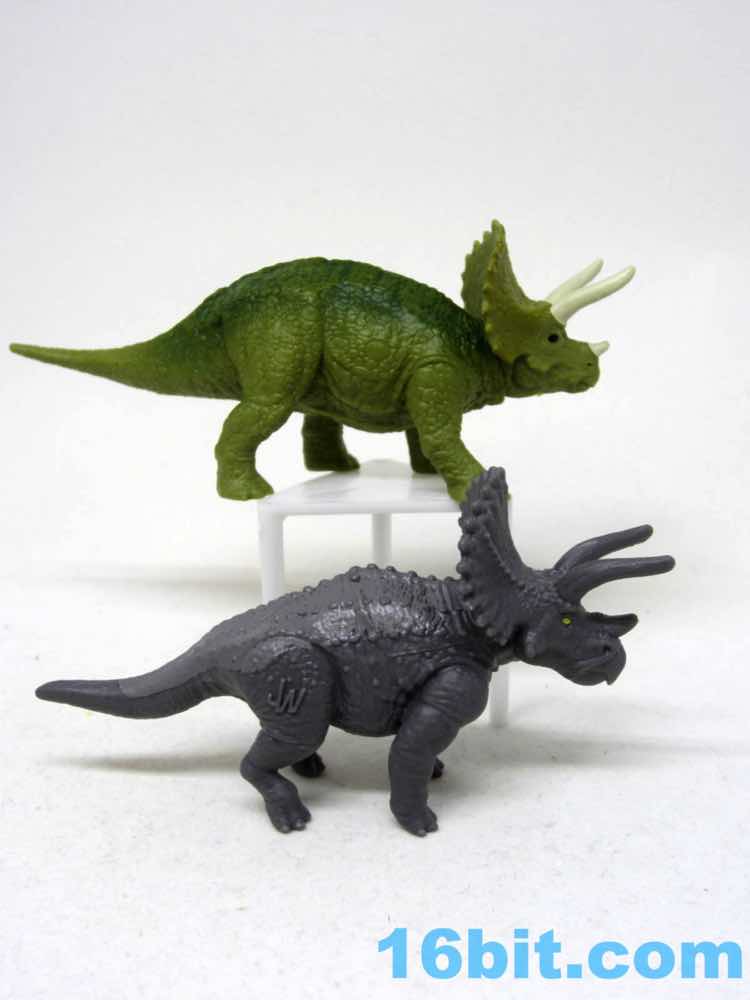 The Triceratops, or Torosaurus toddler, or whatever, is also good. It's long, it has a green shade on its back, and grey horns. The black eyes shine pretty well, with scale detail that reminds me of some of the very best dinosaur toys I had as a kid. She has a jointed neck for posing and combat, which makes it more interesting than Hasbro's static grey toy from a few years ago. Mattel's new one is a little more lively, with more color, and it's also a lot more expensive. Walmart's Hasbro tubes were $4.44 for 3, Mattel's are $9.99 for 3.
