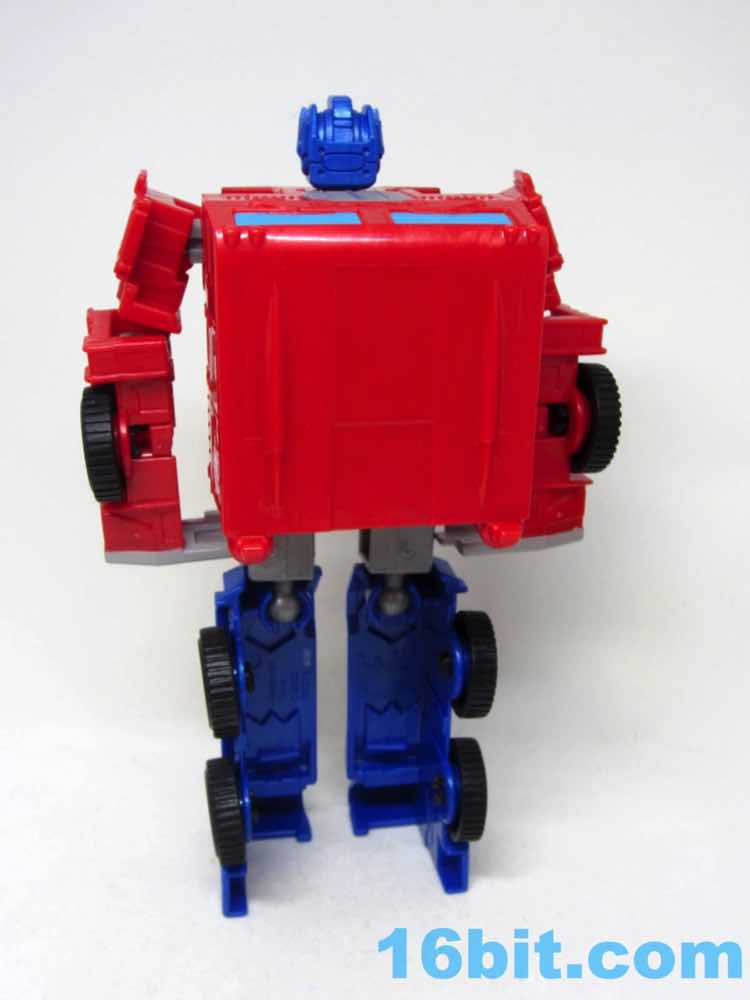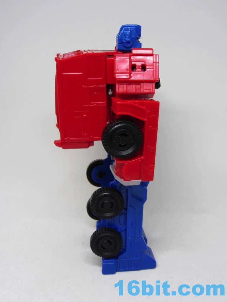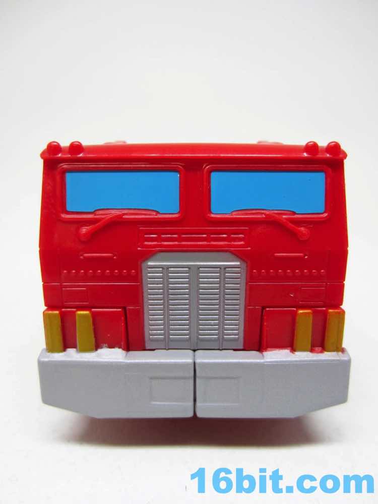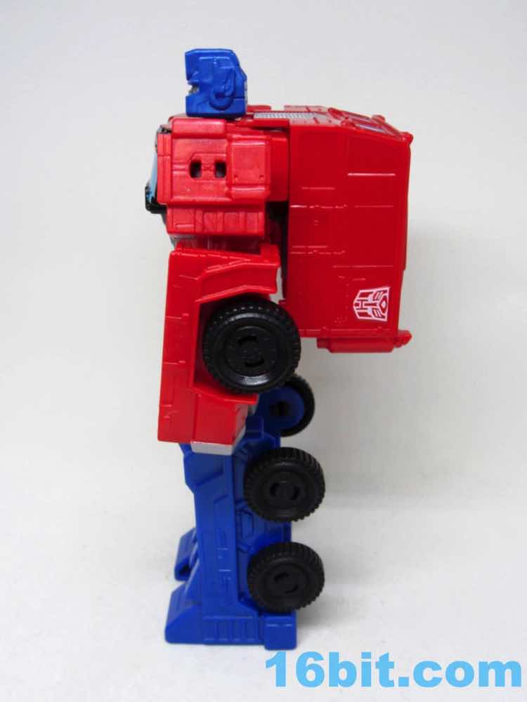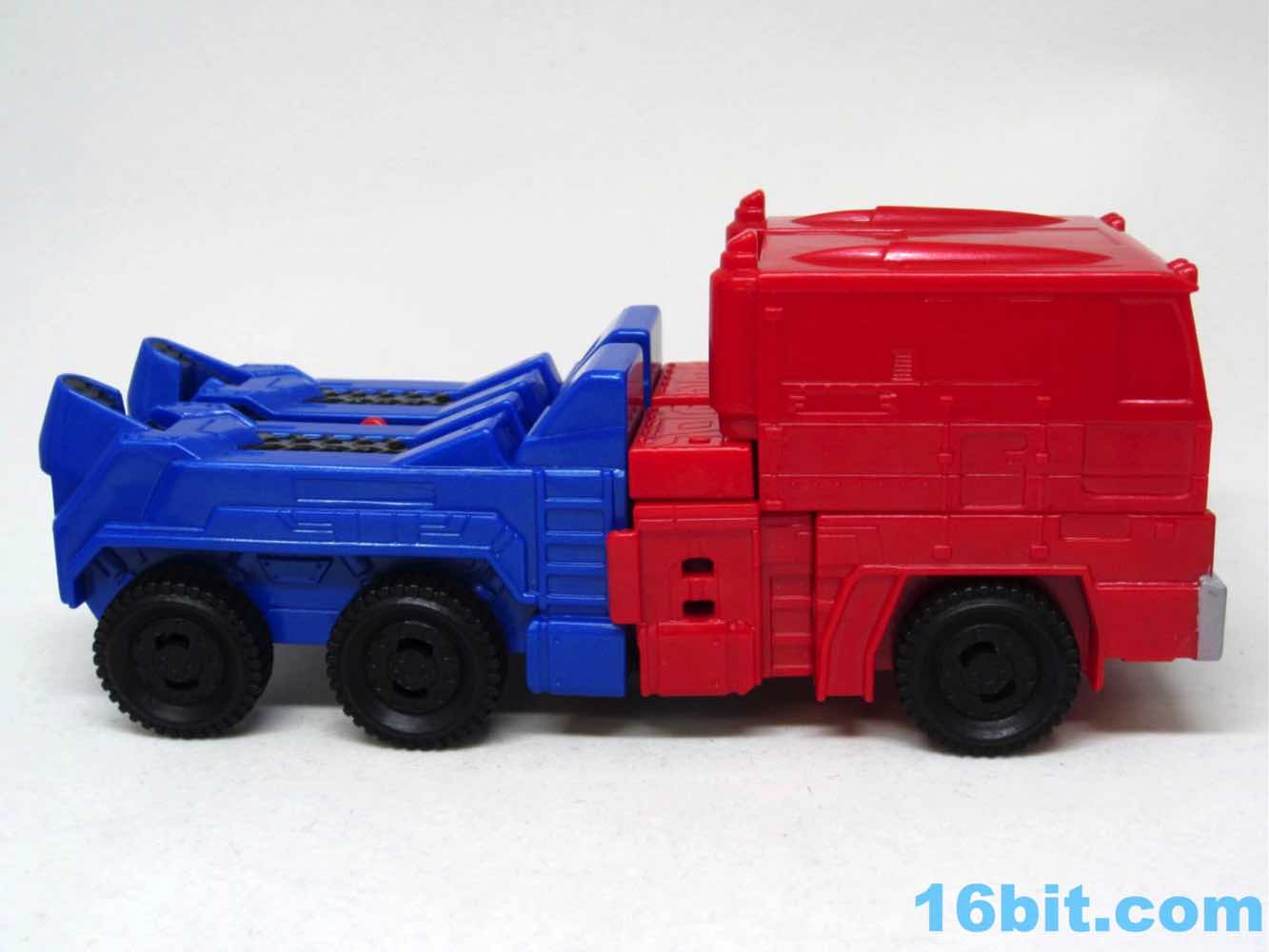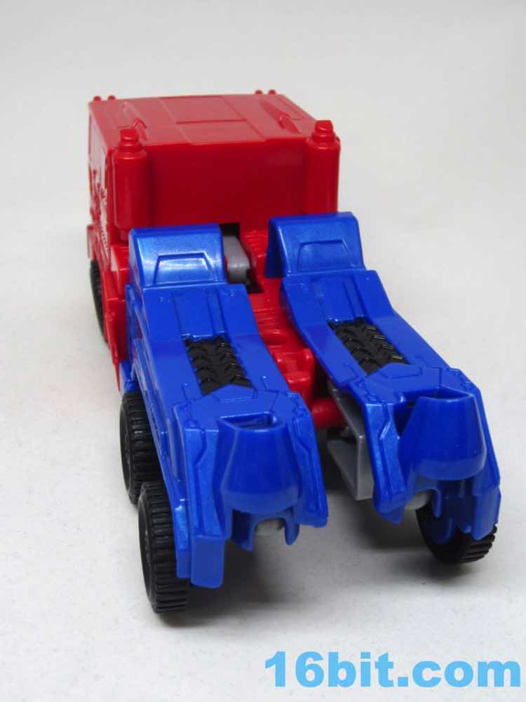 The Optimus Prime truck is not exactly a charmer - transforming it is fun, but it's lacking in paint and kind of long. It doesn't do much, but it doesn't have an abundance of visible kibble either. The snap-in wheels spin a bit, but not as well as the ones with metal pins.
