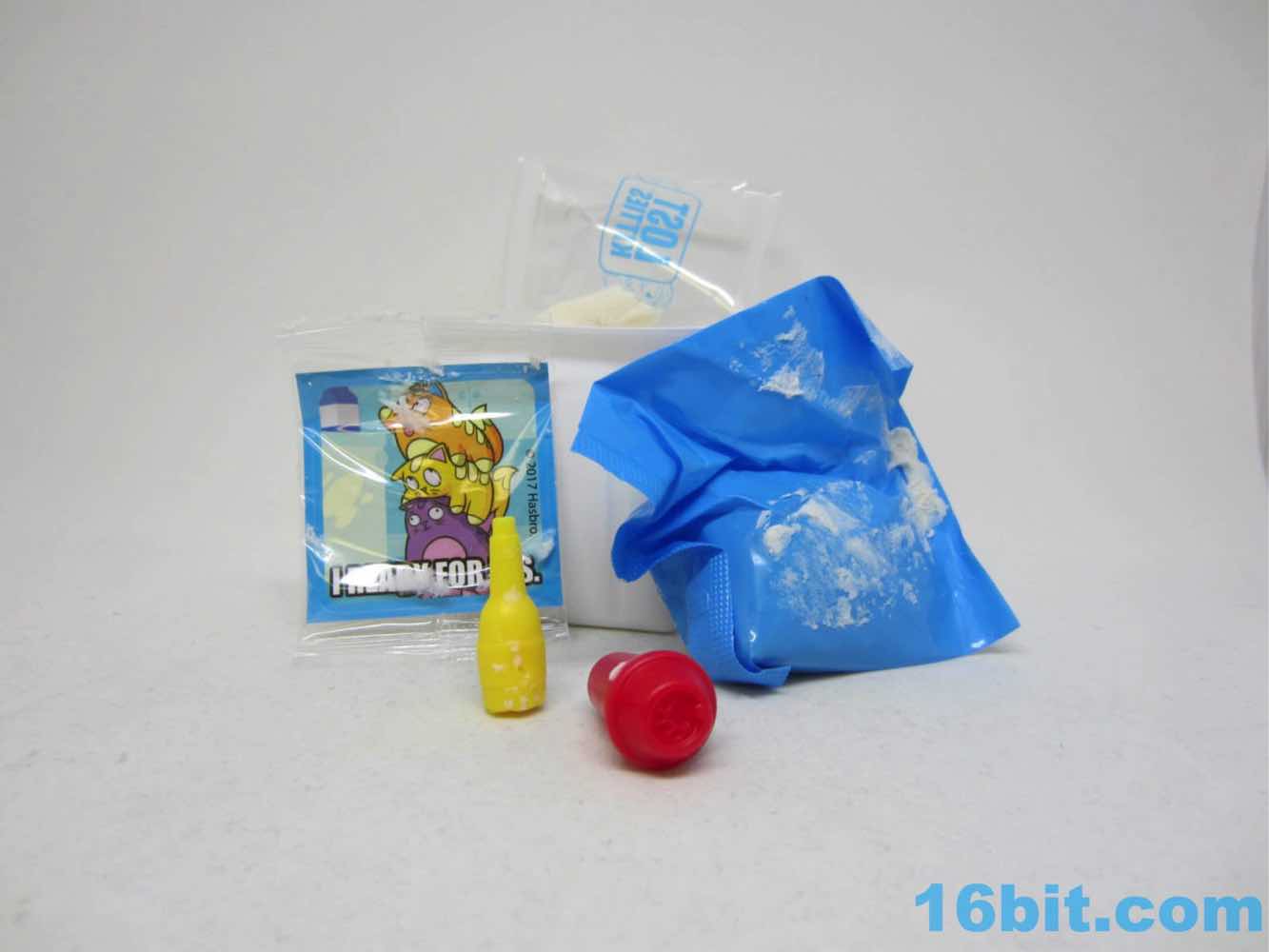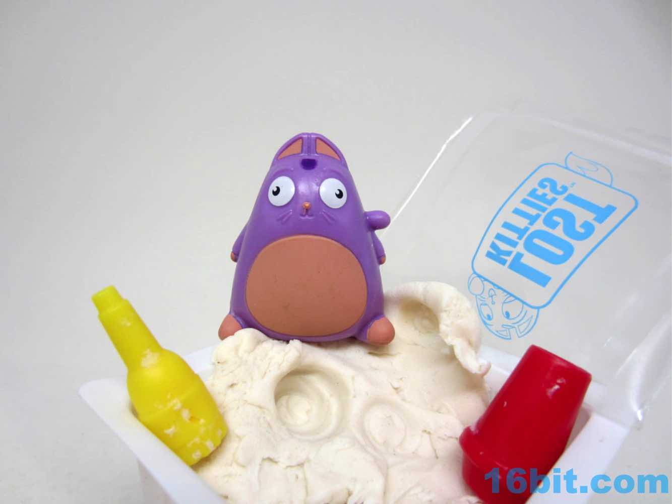 His tiny paws dangle uselessly off his formidable frame, unable to hold the two accessories which were buried in the Play-Doh "milk" surrounding the figure. One is a stamper that puts a paw print in the Play-Doh, while the other appears to be a hot sauce bottle with textured elements for sculpting the clay. I've got no skill so I won't be doing this.