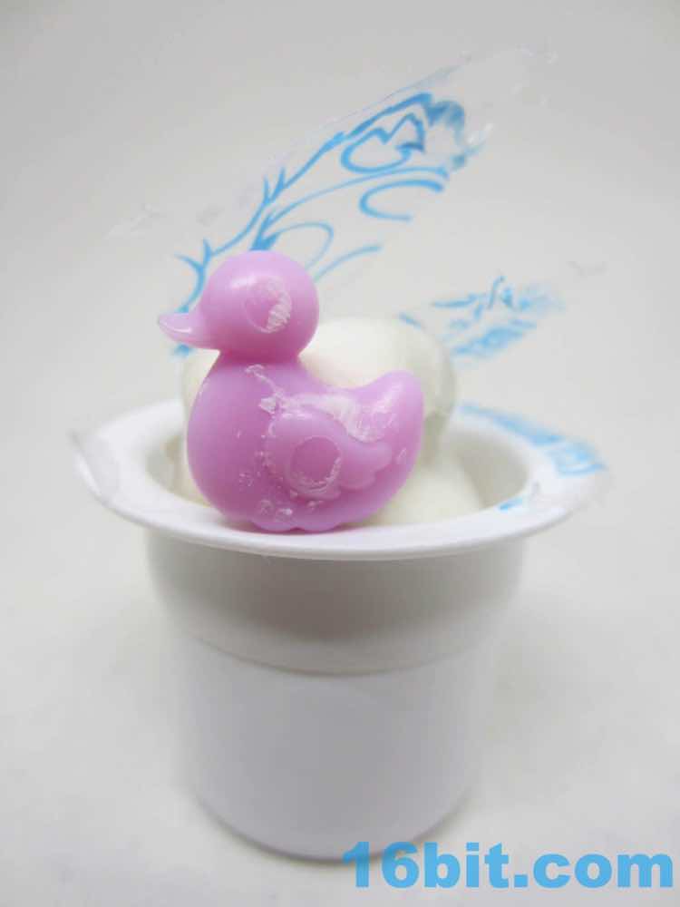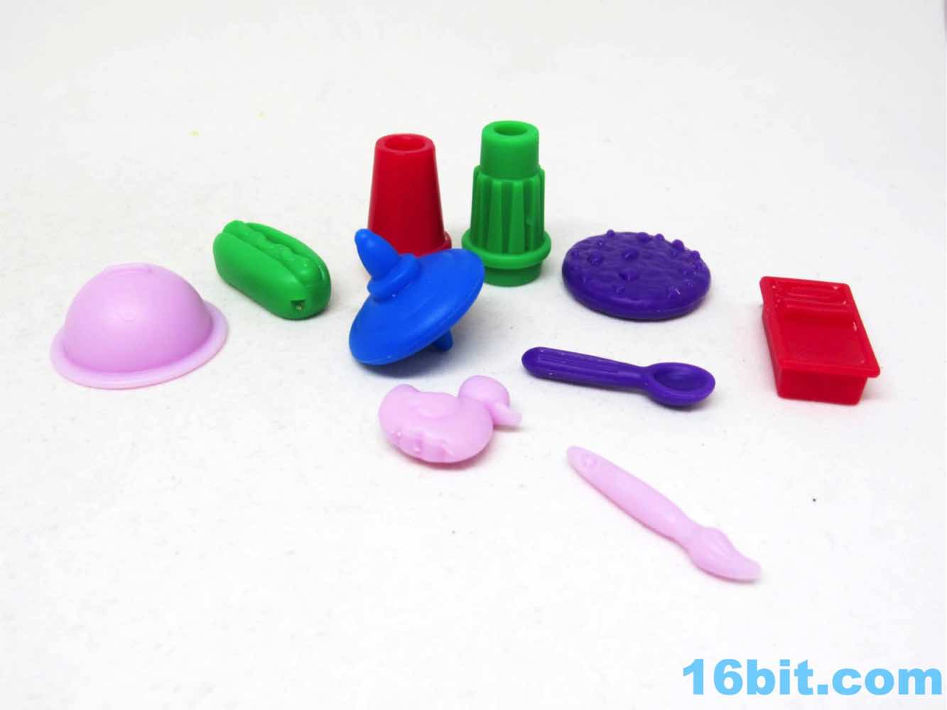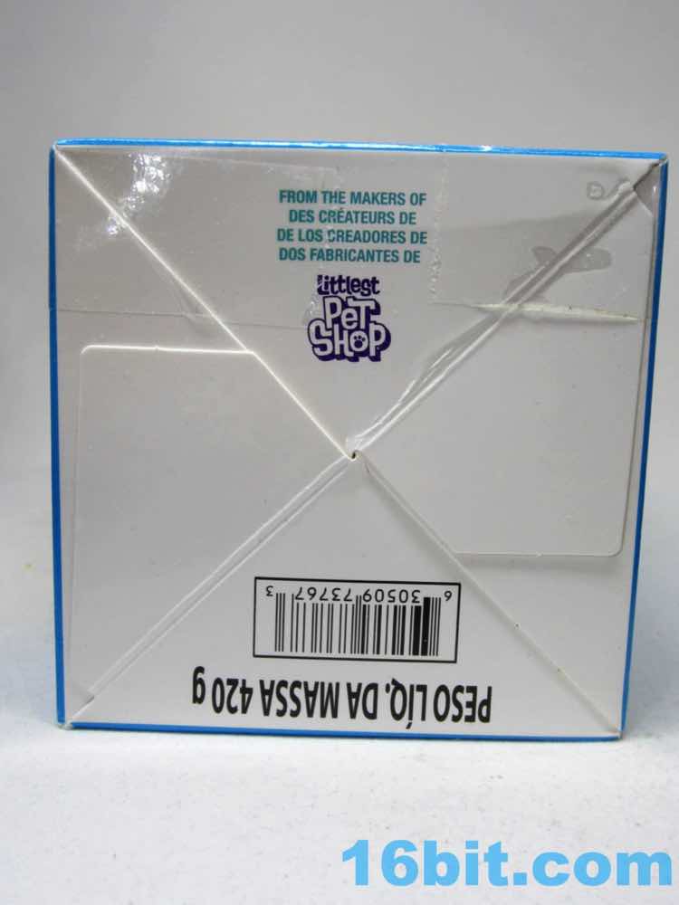 At the very top of the whole thing is a 4-pack of white Play-Doh, each of which with a tiny accessory inside. They serve as food roleplay or sculpting tools, sp a kid playing with these might have a lot of fun. A red stamper can put paw prints in the Play-Doh. A spoon is... well, it's a spoon. It's purple. It's small and you're going to lose it. There's a paint brush that probably provides a similar experience. A pink plastic duck also has a textured bottom, but it can't stand on its own - the cats can't hold any of these, so they're just kinda there. It plays up the whole food-and-creativity motif, although the notion of making something out of the Play-Doh is seen in the official photography but not played up in the marketing materials, or packaging. If you don't recognize the smell, it might not occur to you that this is indeed real Hasbro Play-Doh you're getting as debris in the way of your plastic cat. It's uncommon for Hasbro to not play this up - but the bottom of the package does indicate these are from the makers of Littlest Pet Shop.