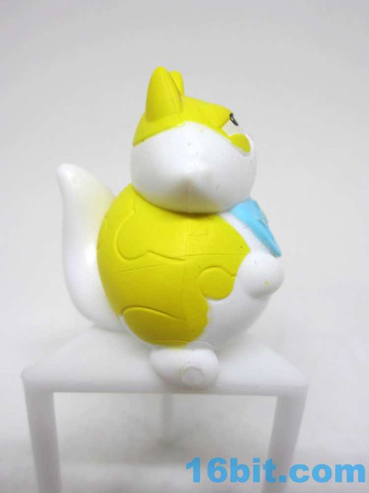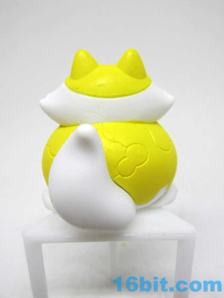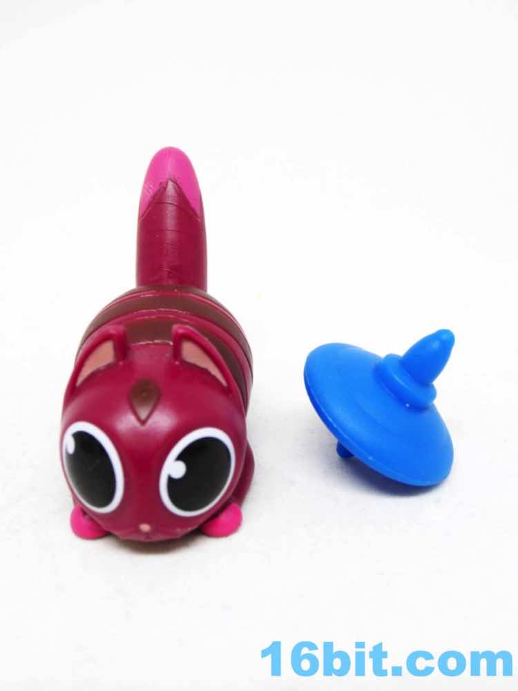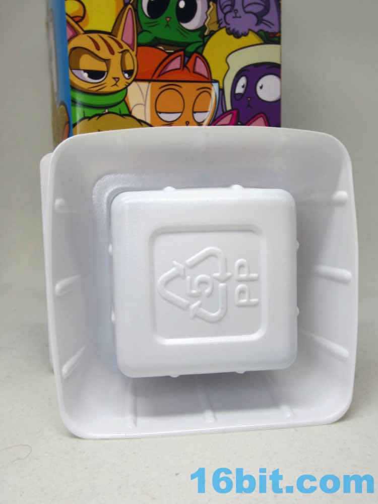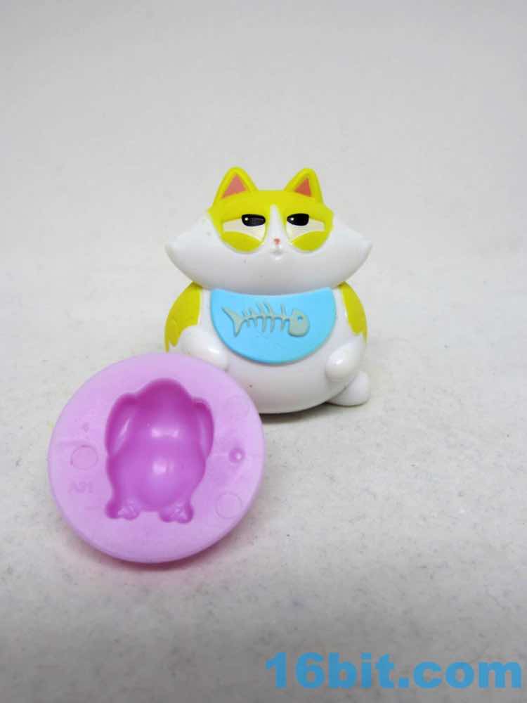 "Attack mode" Specks has giant enlarged eyes and a stiff tail, a pose cat owners recognize from moments before their cat suddenly runs and attacks them or somebody else. The whiskers fling forward and the mouth is small and focused - they did a good job giving this one a ridiculous amount of personality given it's basically a small loaf of plastic with stripes and a face. The tail has a unique color on the tip, and both this cat and his portly pal have a little paw pad sculpted on the bottom. Thanks to the pose, it's pretty sturdy and is unlikely to ever topple over - so far, all the figures seem designed to not fall over. It's the kind of thing you don't get on bigger action figures. It has a top that can spin - I don't think it was meant to serve as a mold for the "milk."