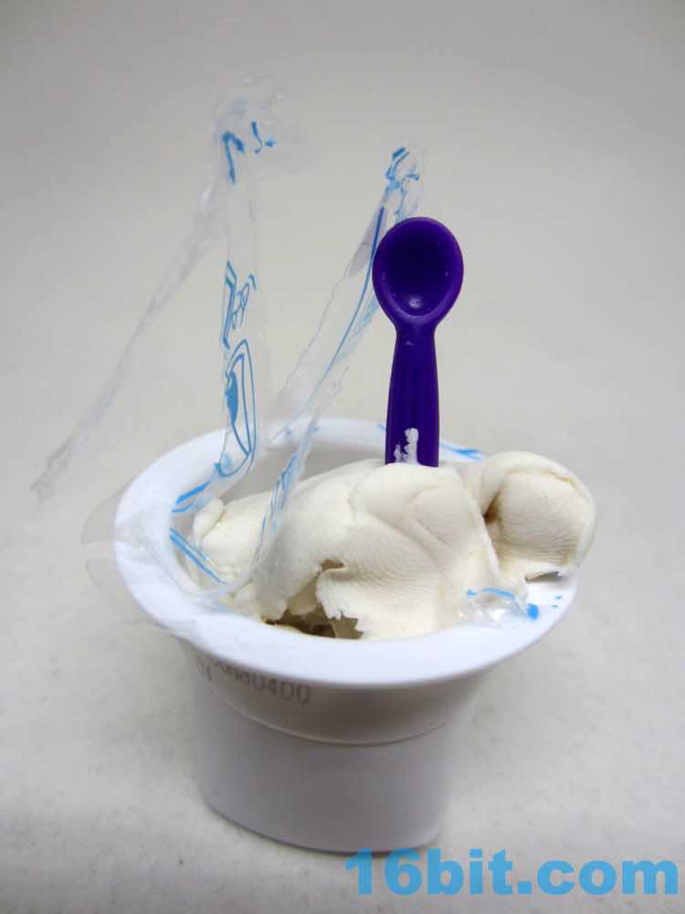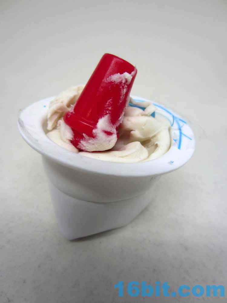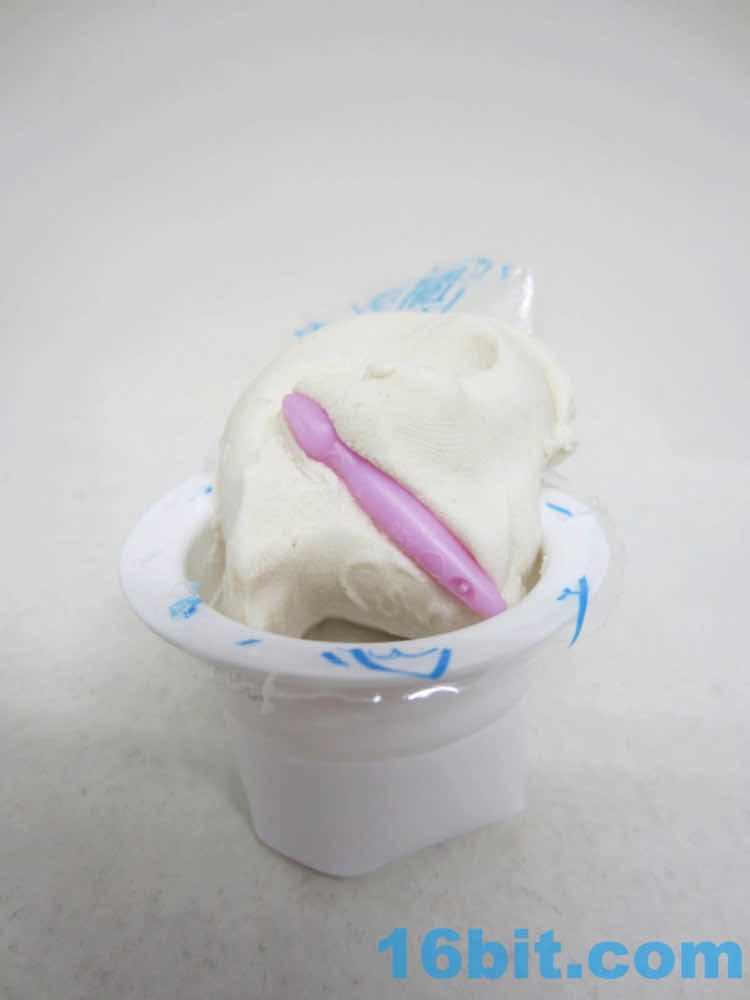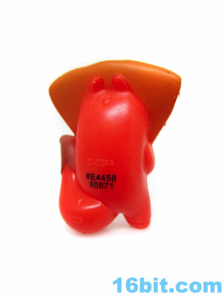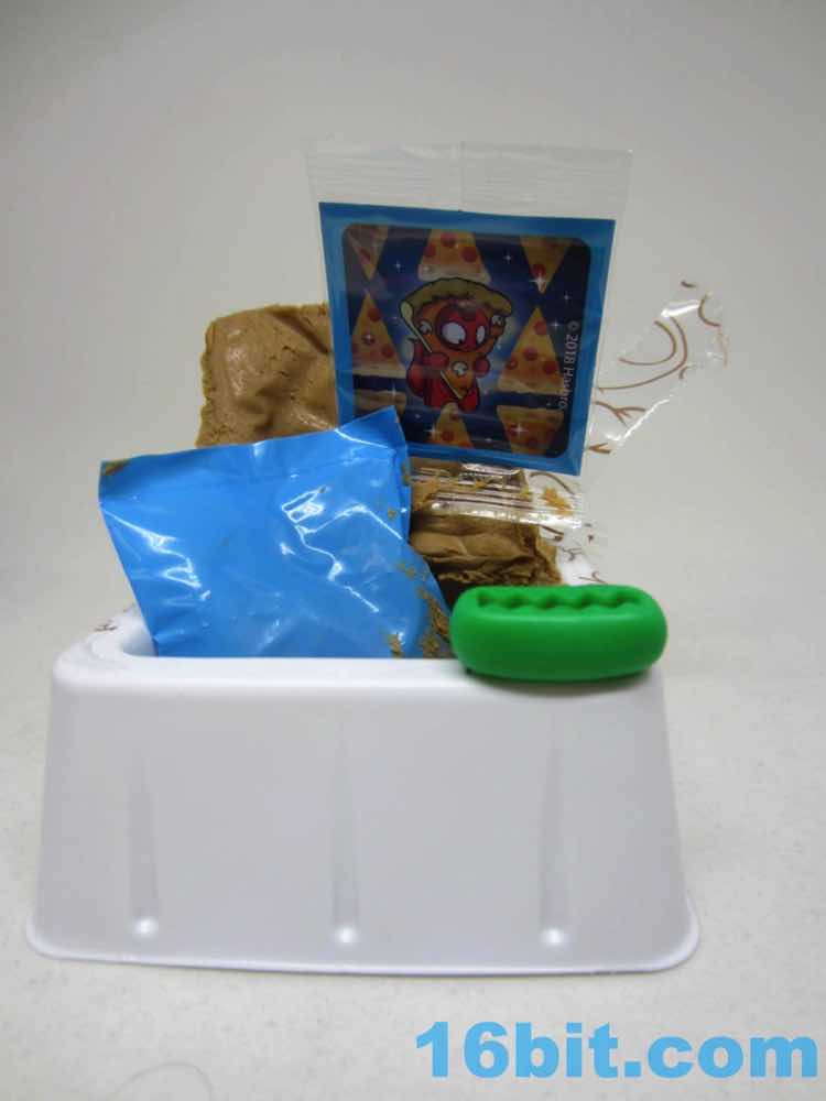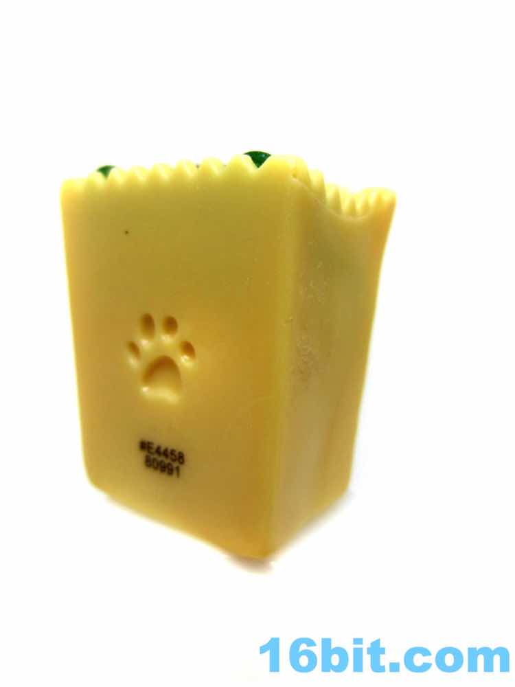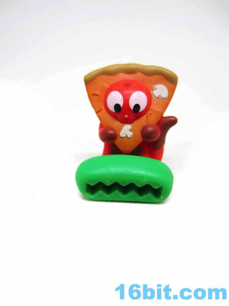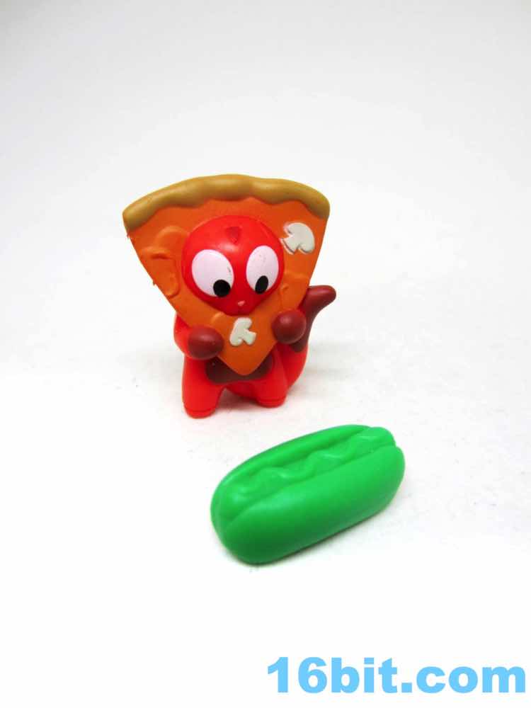 The "chocolate" figure in this box was Cheesy, a pizza slice with a cat eating it from the inside. You can see the mouth munching on it from within, and there are sculpted pepperoni pieces unpainted. They got the mushrooms, though. The little orange cat is on the smaller side compared to the others, but that's also because of the giant pizza hat. The tail serves as a means of steadying the figure, which has painted paws and large eyes. A stripe on the back of the head is unpainted, though. It includes a green hot dog with a mold to make french fries out of the bottom.