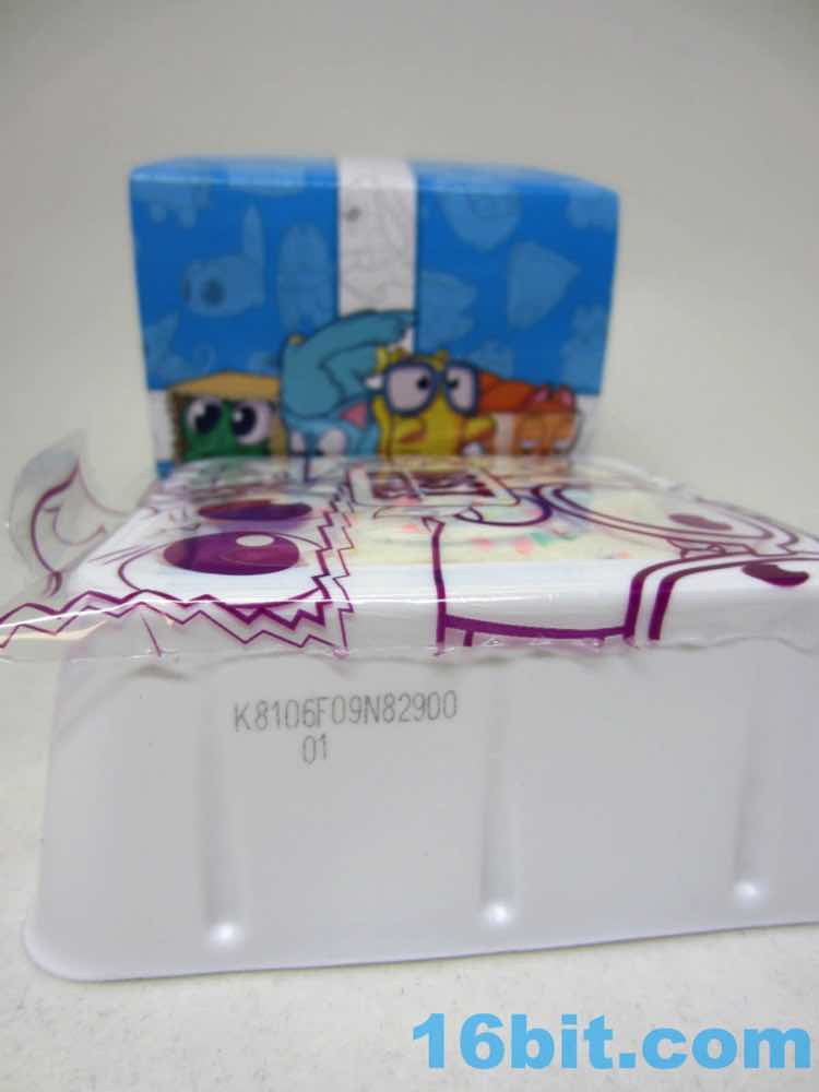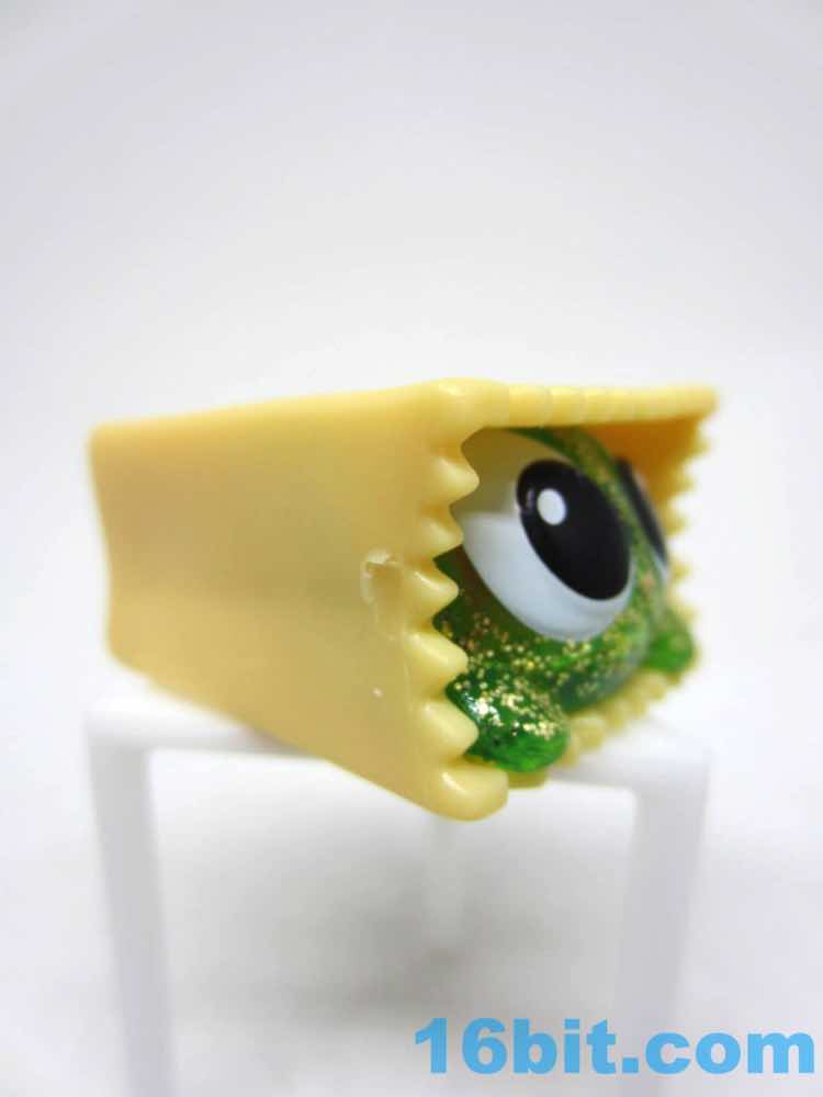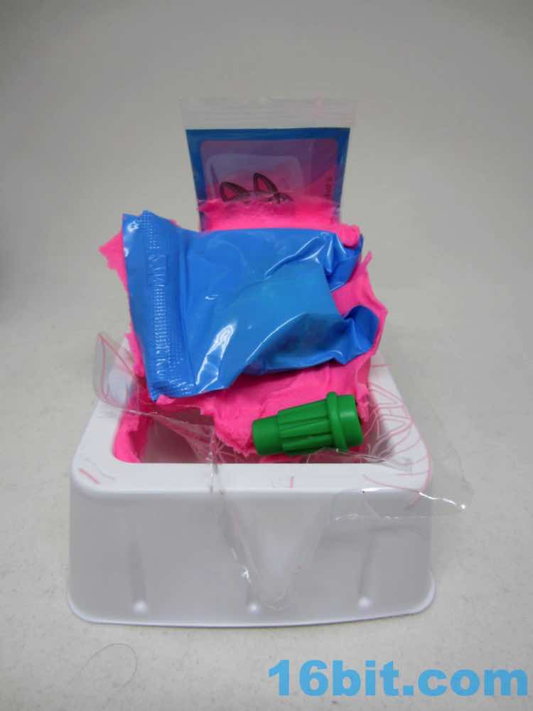 Finally we've got Totes, the special sparkle figure that serves to immortalize a slang term that didn't quite catch on in my circles. It's a cat face in a paper bag - the cat is green and glittery, with huge eyes like it's ready to attack you. This is fairly accurate to cats I have met, and probably the easiest sculpt in the entire line. It's cute and clever, but not exactly fun as it's a bag you can't put things in. It comes with a cookie you can use to mold more cookies as well as a tin of sardines you can use to mold tiny fish.