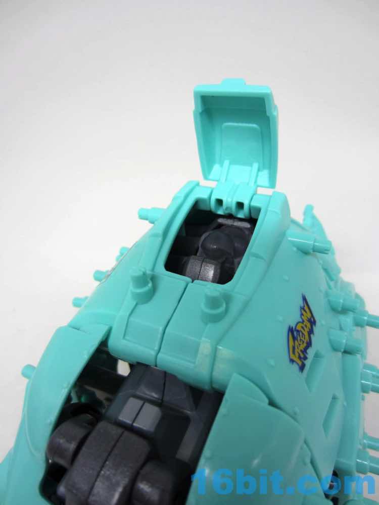 At about 6 1/2-inches long, it's not a huge toy but it does offer more moving parts than usual. A motor allows the toy to walk and nod his head, and if you reconfigure its armor it will also cause a piston to manipulate a very phallic cannon in the fold-out portion of the shell. Muy sexy. The shell also has an opening hatch to reveal one of the toy's radical departures from previous generations - the little chrome pilots are gone, replaced by significantly larger clear colorless frosty figures. I assume these will be replaced by anime-styled figures later as blind bags or other figure kits are sold, but for now you've got a nameless, faceless slug figure pilot. (I wish it was just chrome.) The actual mech gets some bonus personality thanks to one very new part - chrome eyeballs inserted in the robotic skull. They're metallic blue, but not vac-metal blue, and glisten nicely in a dark room.