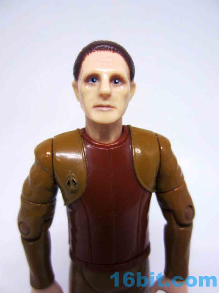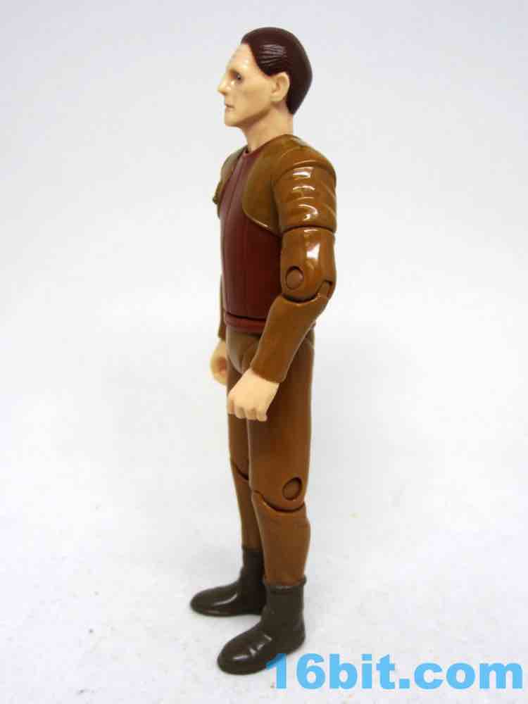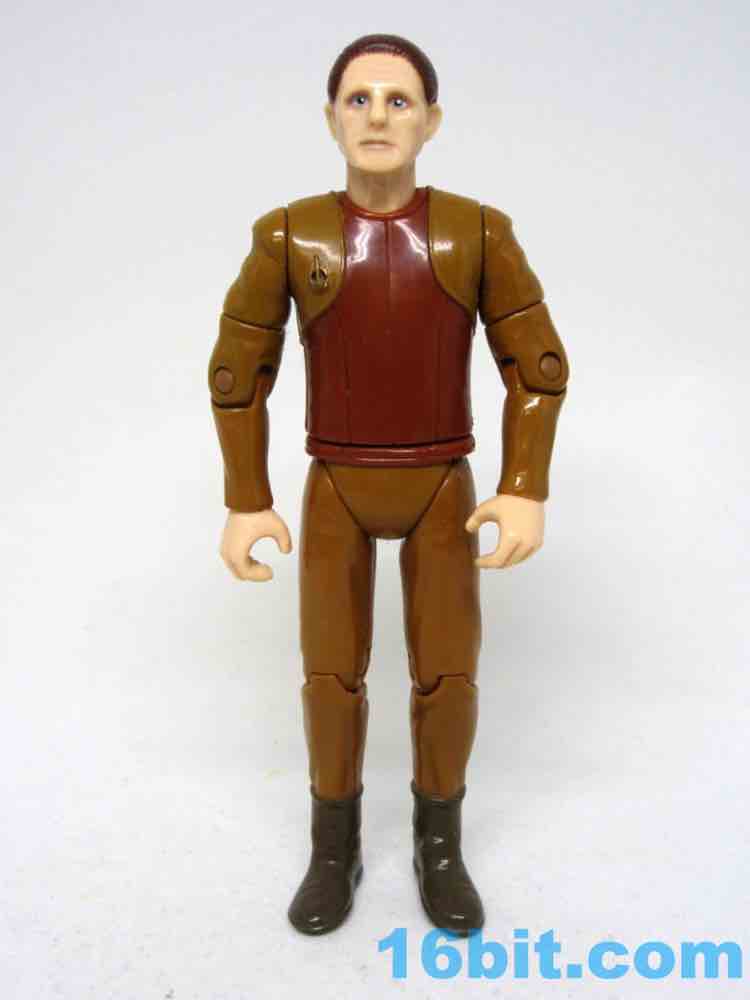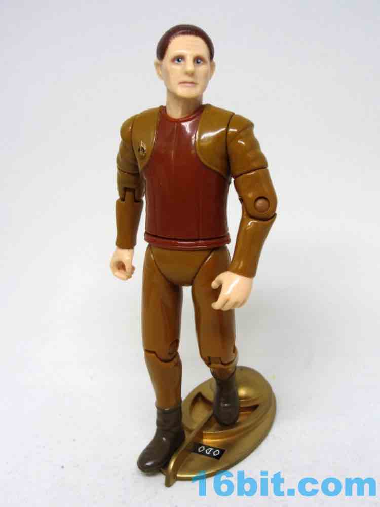 I've had this figure all this time and it aged well - the no-collar uniform still looks good because you get to see his face and distinctive neck. Since they build him up with prosthetics, it's easier to get a more accurate figure face. His unfinished humanoid head has forehead lines as well as a nose and ears that betray his newbie shapeshifter status. The Bajoran pin has some black detailing, plus his boots seem on the mark - but reference photos are hard to find.