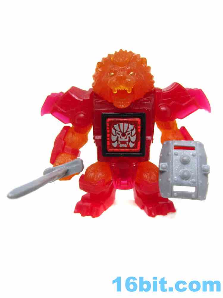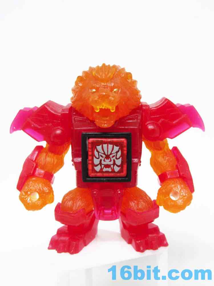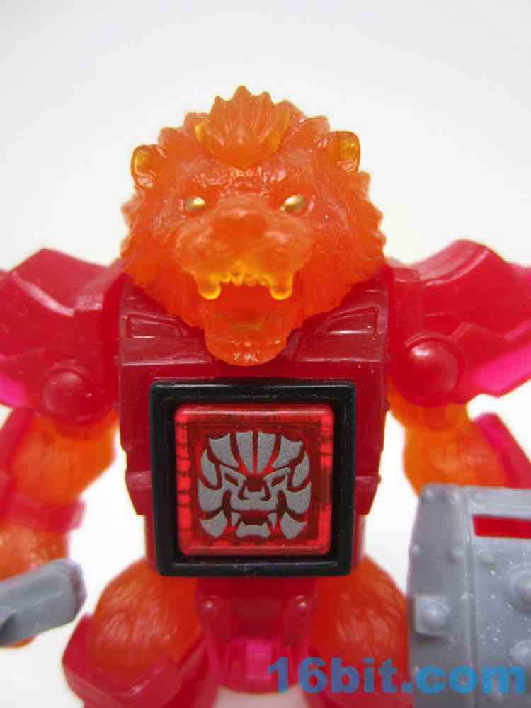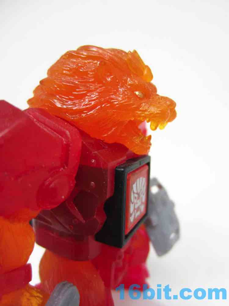 The sculpt is pretty good, and the clear solid-color bits actually help to hide some of the problems. His jaw blends right in, and the gold eyes shine nicely from the orange plastic. His red armor looks like a gummi candy, and the orange fur fits in perfectly - it's like Burning Godzilla, but not. The mane looks like hairy flames, which is what you want in your lion warrior figure.