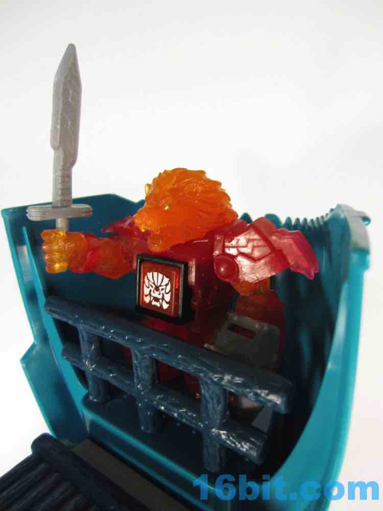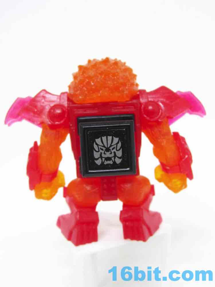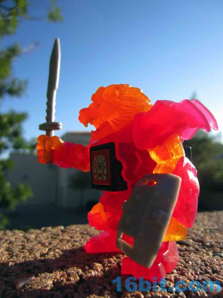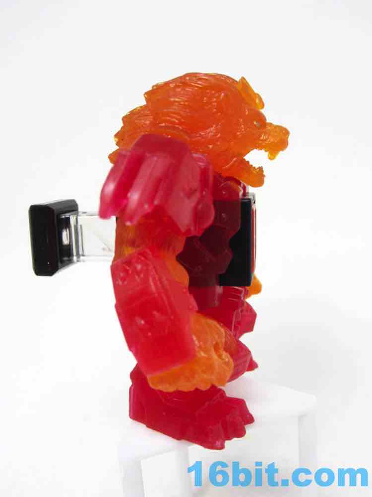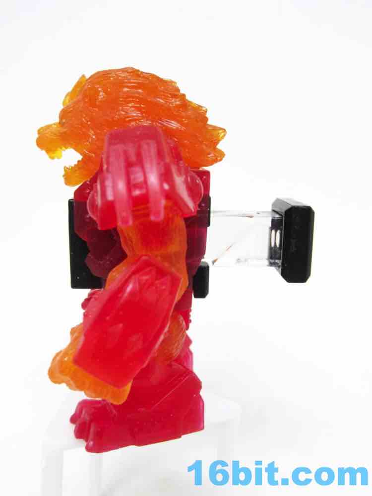 The sculpt is pretty good, and the clear solid-color bits actually help to hide some of the problems. His jaw blends right in, and the gold eyes shine nicely from the orange plastic. His red armor looks like a gummi candy, and the orange fur fits in perfectly - it's like Burning Godzilla, but not. The mane looks like hairy flames, which is what you want in your lion warrior figure.