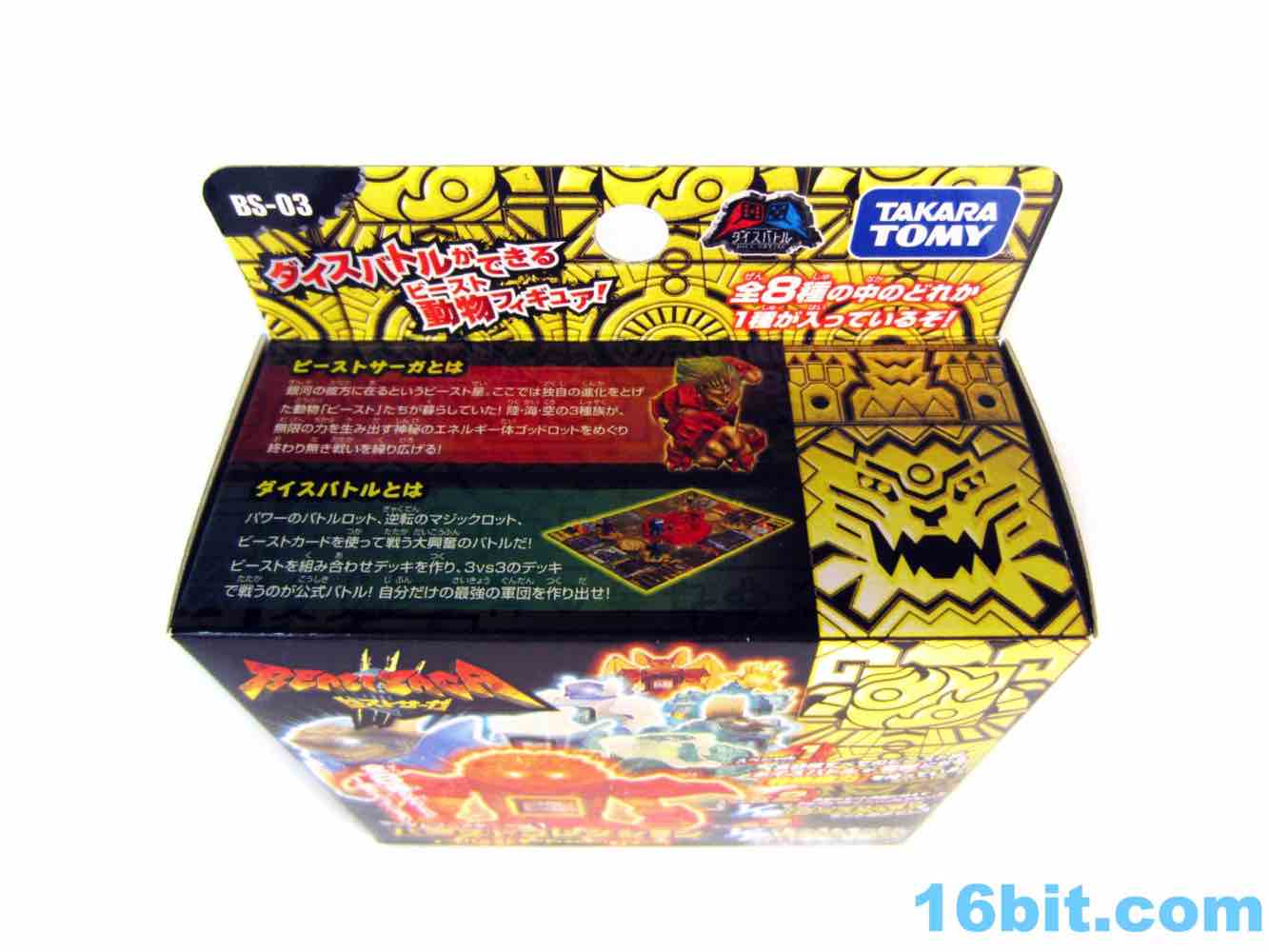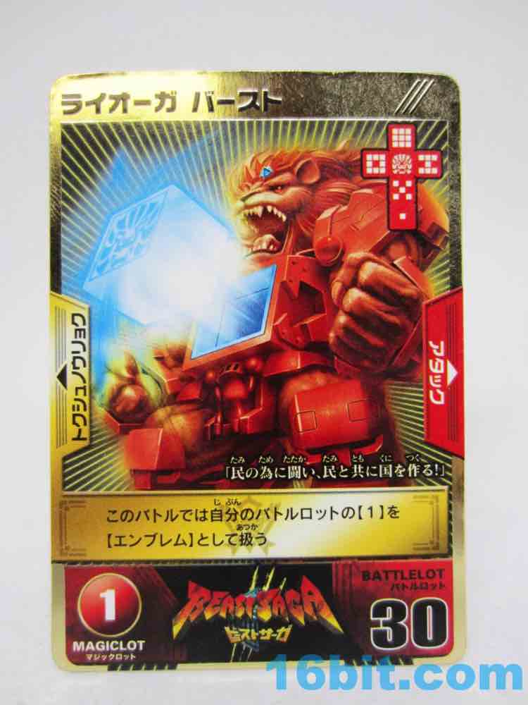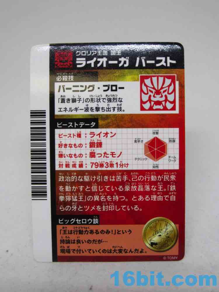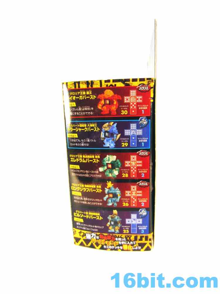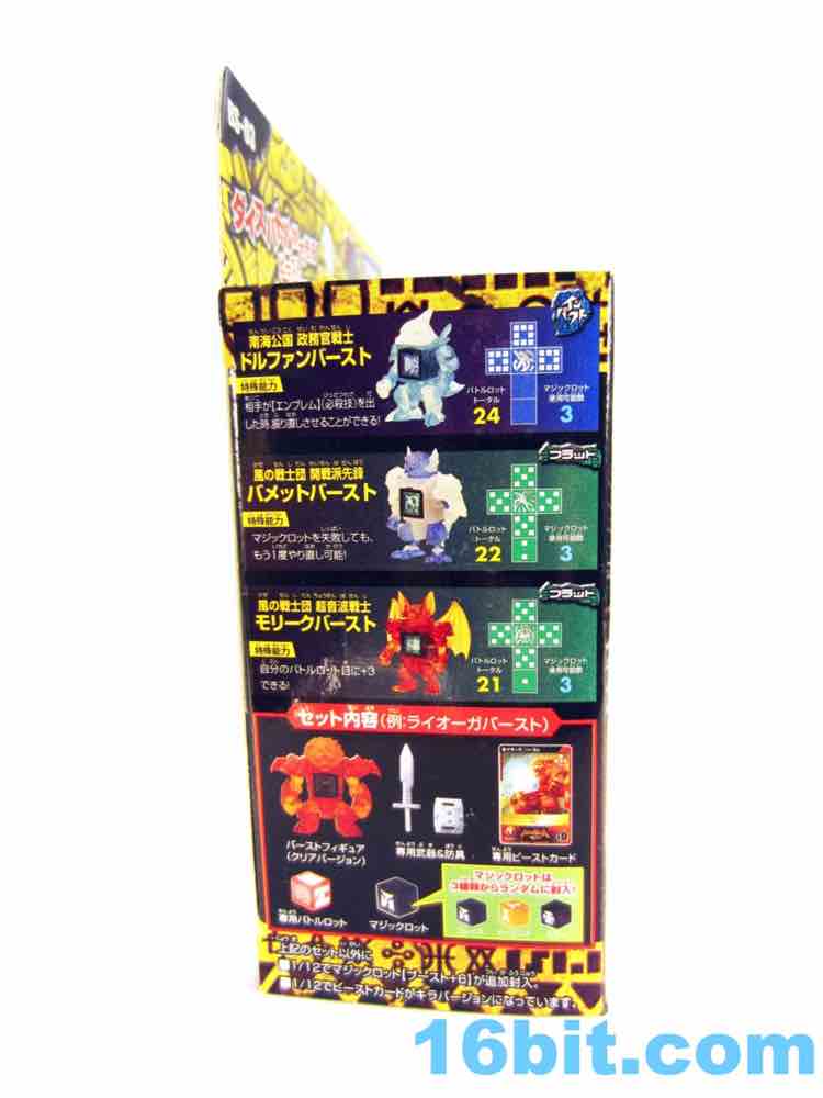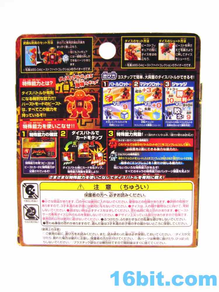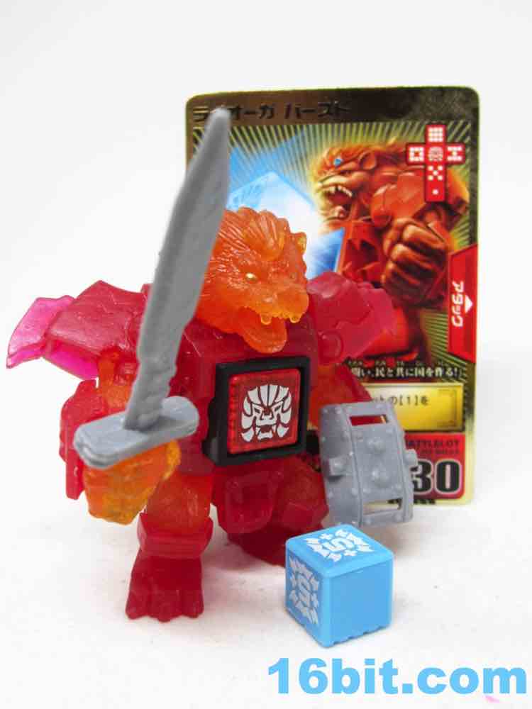 Item No.: BS-03 Manufacturer:Takara-Tomy Includes:Sword, shield, 2 dice, trading card - foil or regular Action Feature:Dice launch out of stomach Retail:525 yen (or about $7) Availability: September 2012 Other: Also known as "Liorga" and "Lio-Ga"