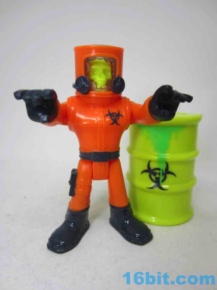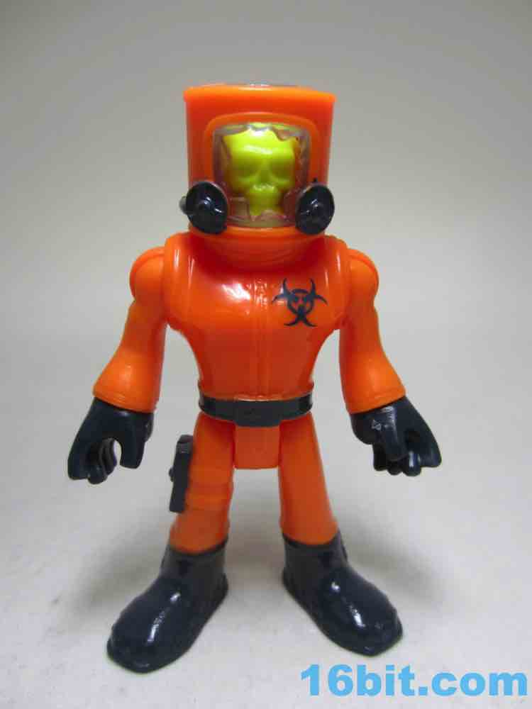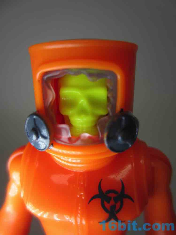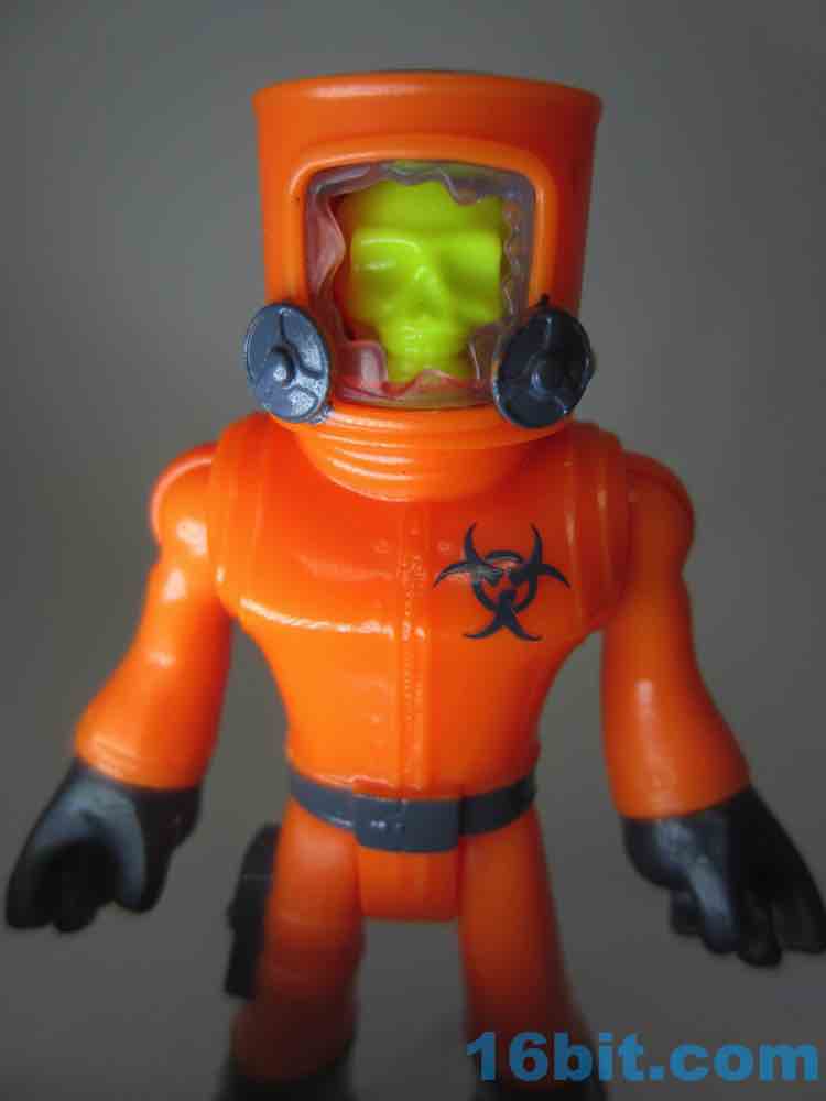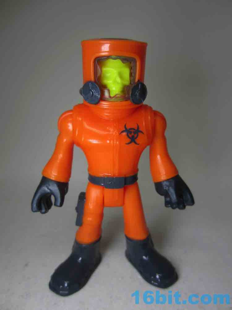 Fisher-Price Imaginext Series 11 Collectible Figures Radiation ManI was charmed enough by this Radiation Man to pick it up with some other figures from series 11 when I was out hunting X-Ray Man, Triple Threat Snake, and the pair of wrestlers. Fisher-Price has some huge fans of 1970s and 1980s toys on its Imaginext team, so they tend to go a little bit far into easter eggs and details you might not see elsewhere. Rather than do a guy in a hazmat suit, they cracked the window on the helmet and show you a ghoulish green skull, which reacts to black light and has the flesh melted off. Dark, man.