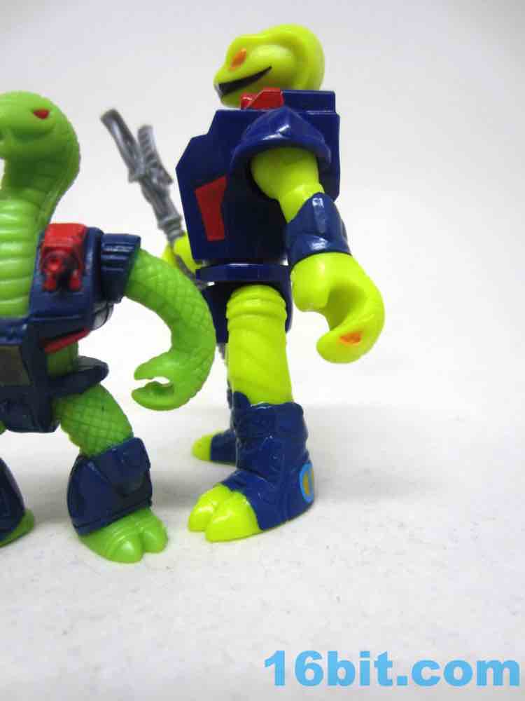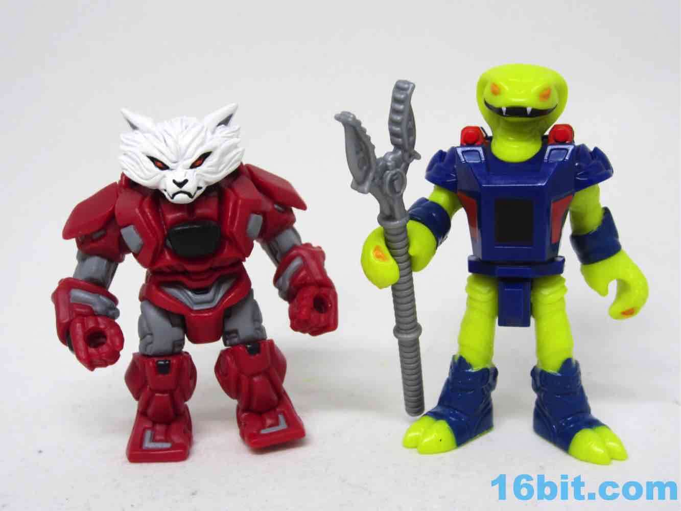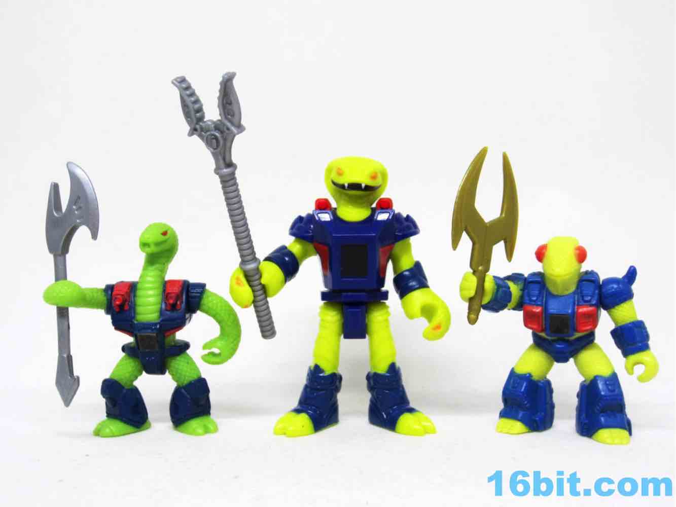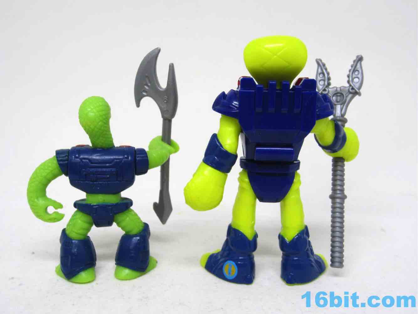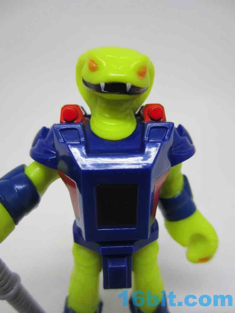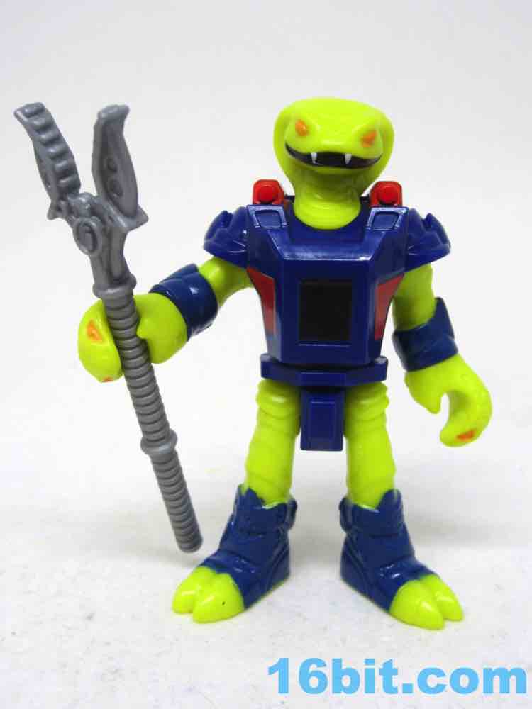 The 3-inch figure is a new mold that looks like a cross between Hasbro's classic toy and Mattel's recent snake warrior in its own ancient Egypt Imaginext line - which was basically King Hiss. The new Imaginext figure has snake heads for hands with green skin, red eyes, blue armor, and red highlights. The forms are different, as are the hues, but things are basically where they always were. The snake has lighter skin and a cobra-like hood, and even sports a fake rubsign spot with a black rectangle on the chest.